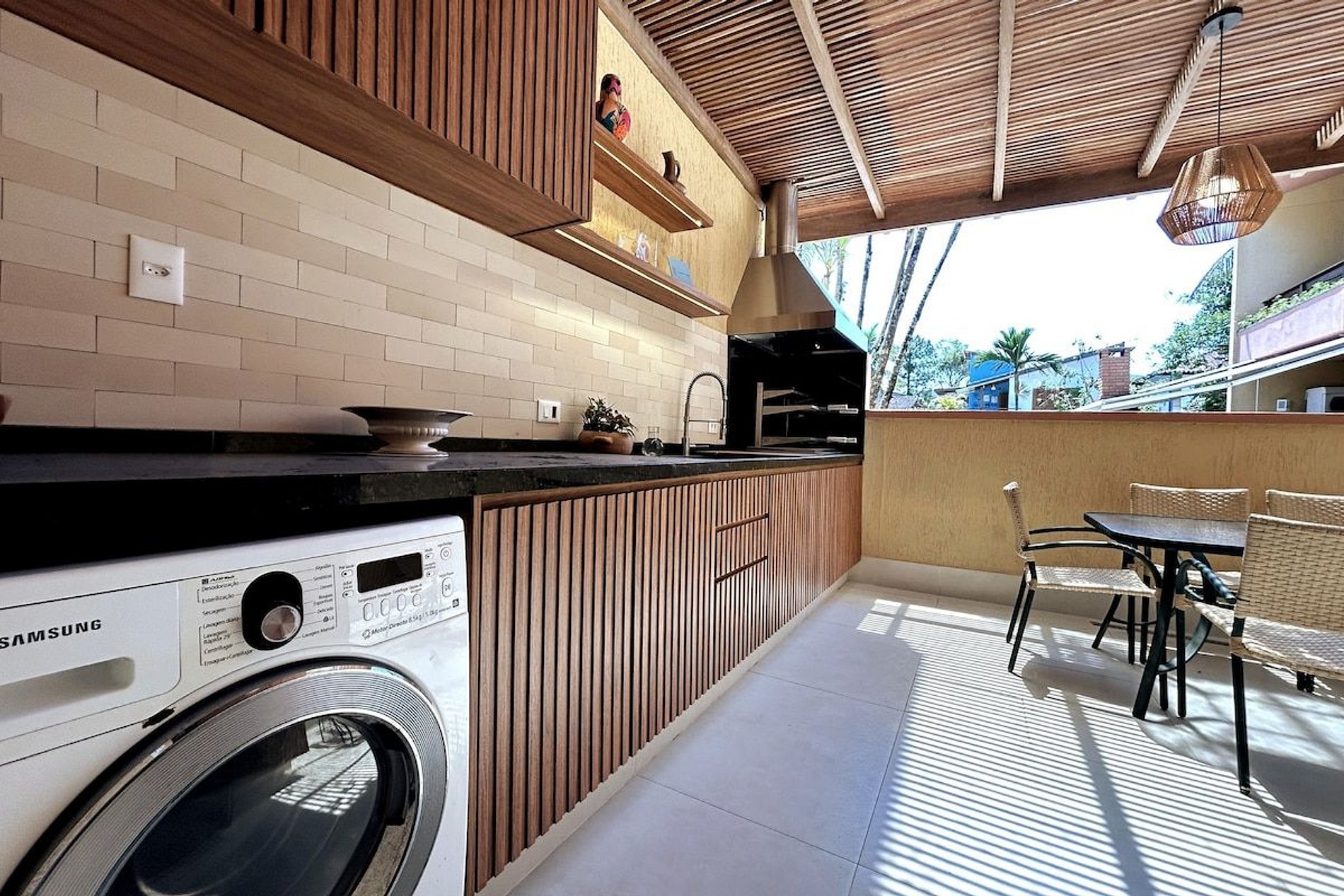 - Geladeira Duplex com amplo freezer - Máquina de café Nespresso - Lava louças - Lava e seca roupas - Fogão 5 bocas - Forno - Todos utensílios necessários para suas refeições a churrasco