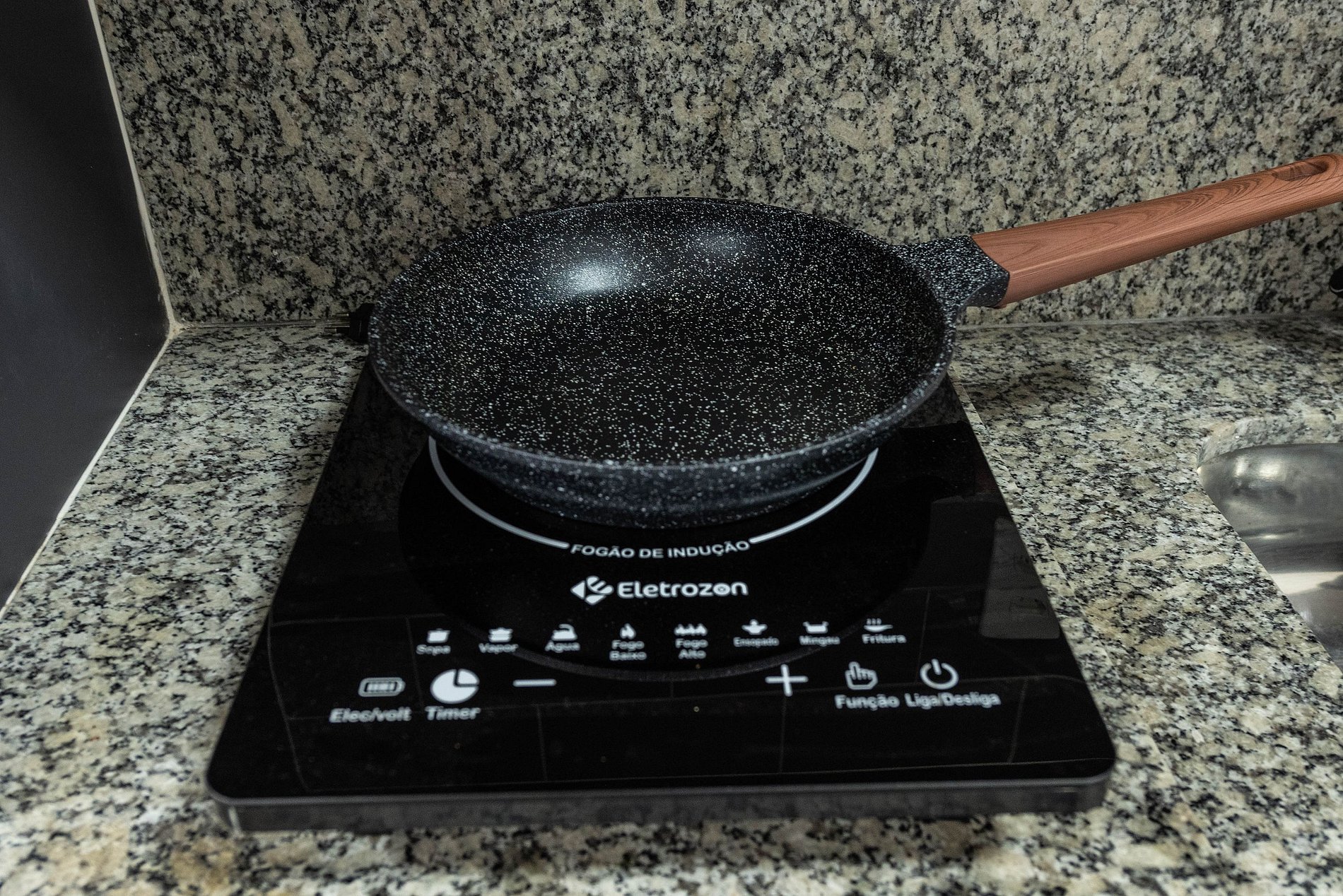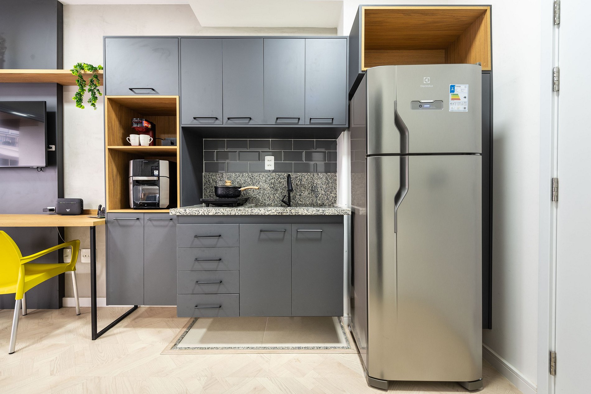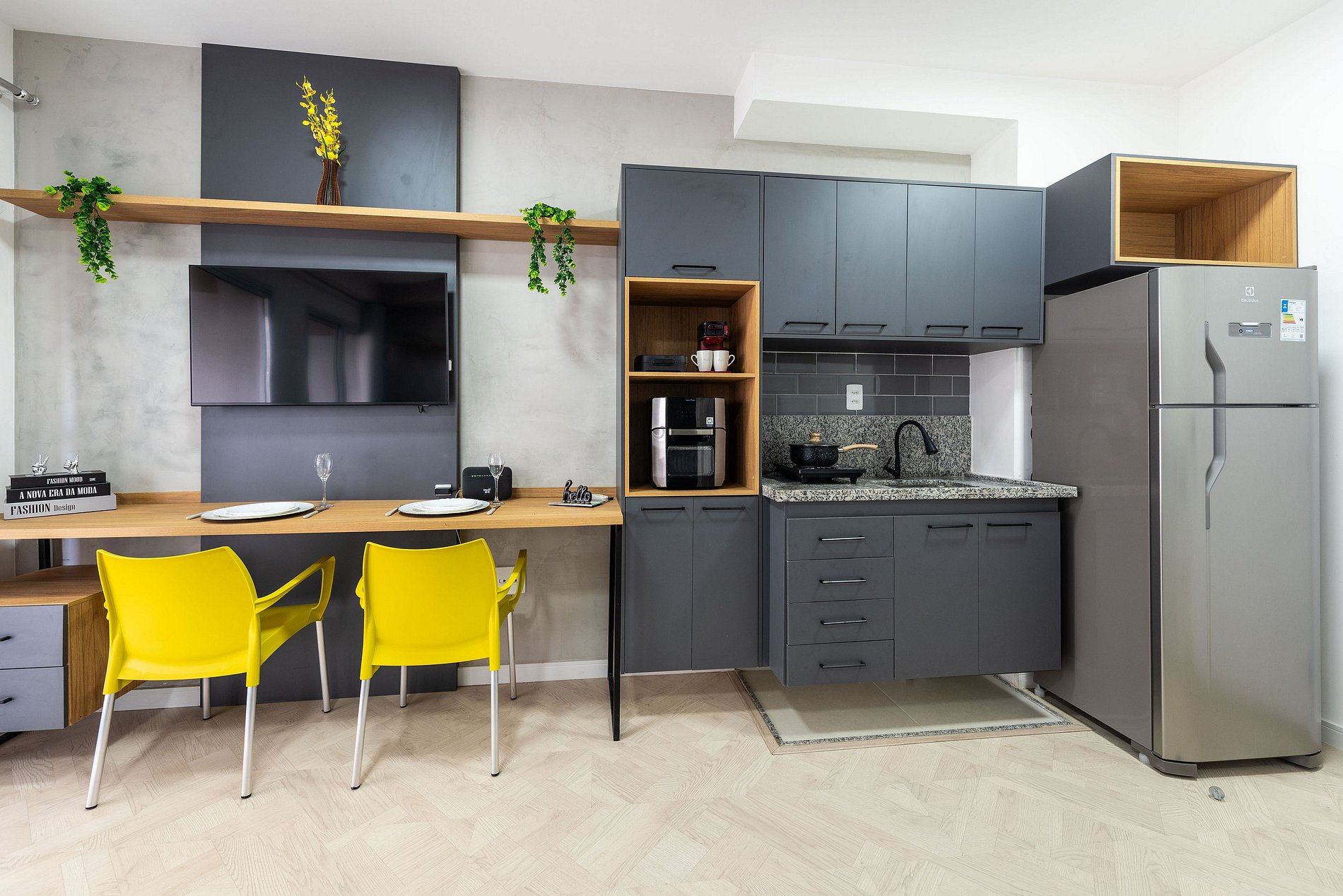 * Cozinha completa, equipada com geladeira, fogão cooktop, air fryer, micro-ondas e todos os utensílios necessários para preparar suas refeições