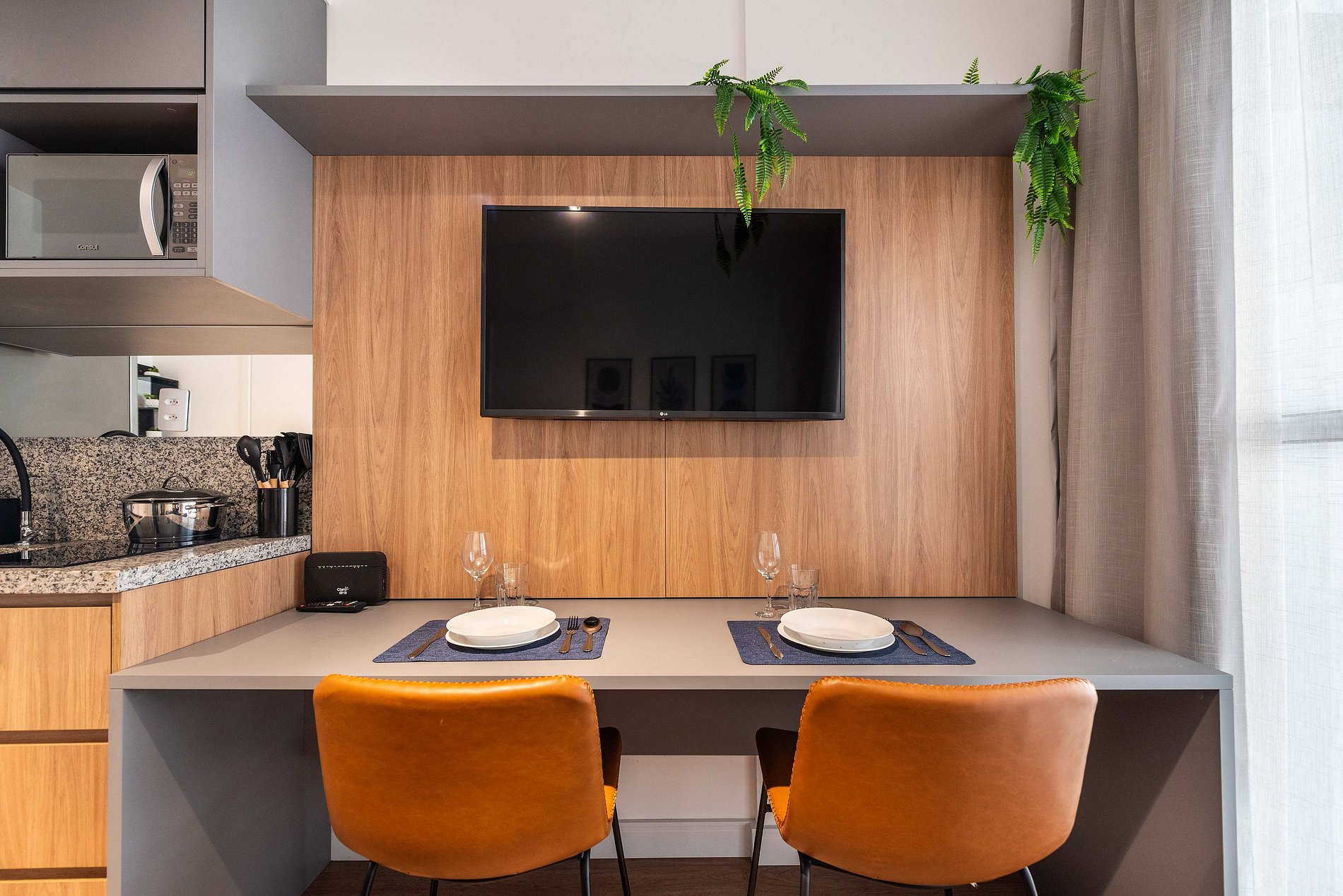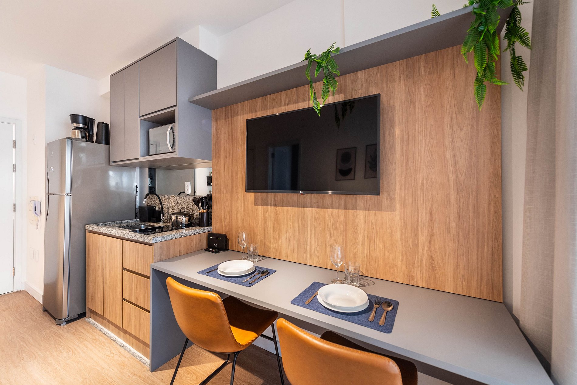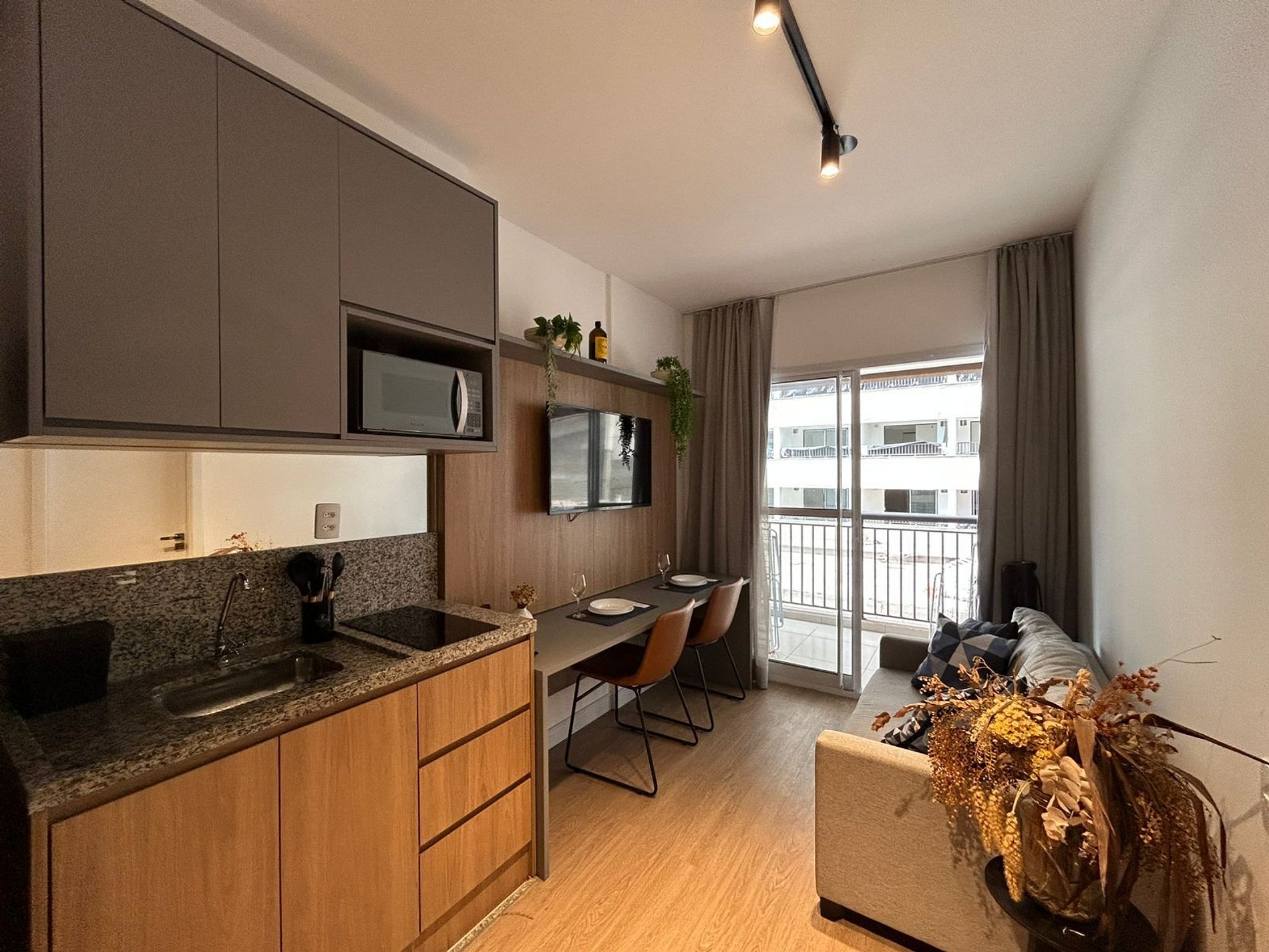 * Cozinha americana com fogão de indução 2 bocas, micro-ondas, sanduicheira, cafeteira elétrica, liquidificador e chaleira elétrica.
