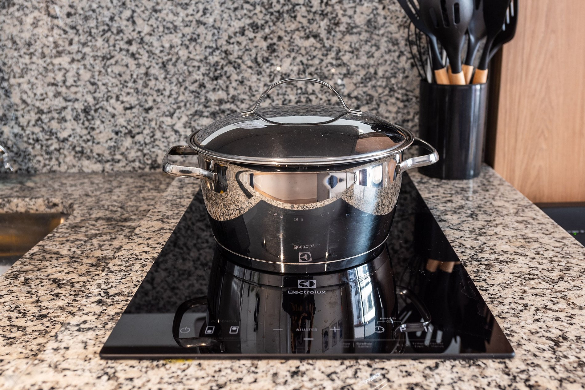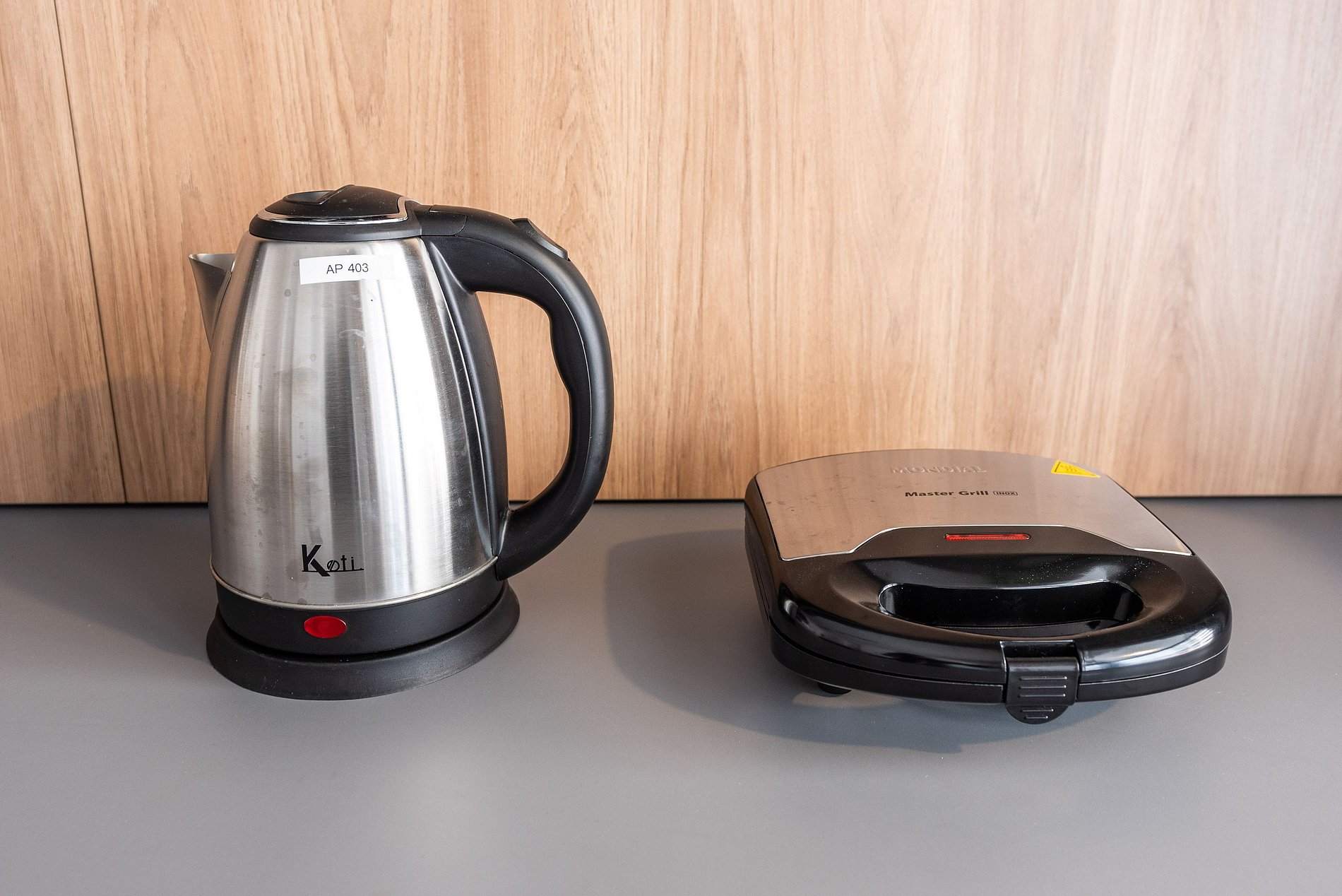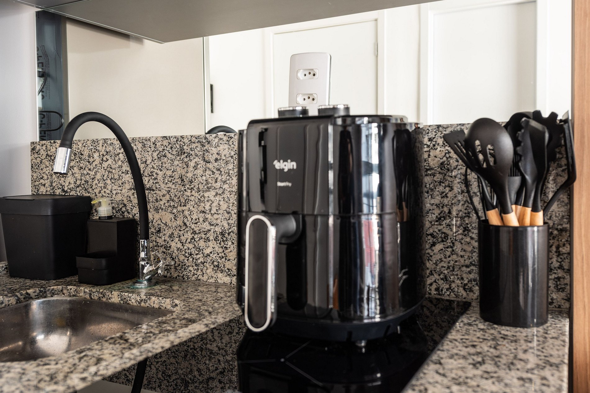 * Cozinha americana com fogão de indução 2 bocas, micro-ondas, sanduicheira, cafeteira elétrica, liquidificador e chaleira elétrica.