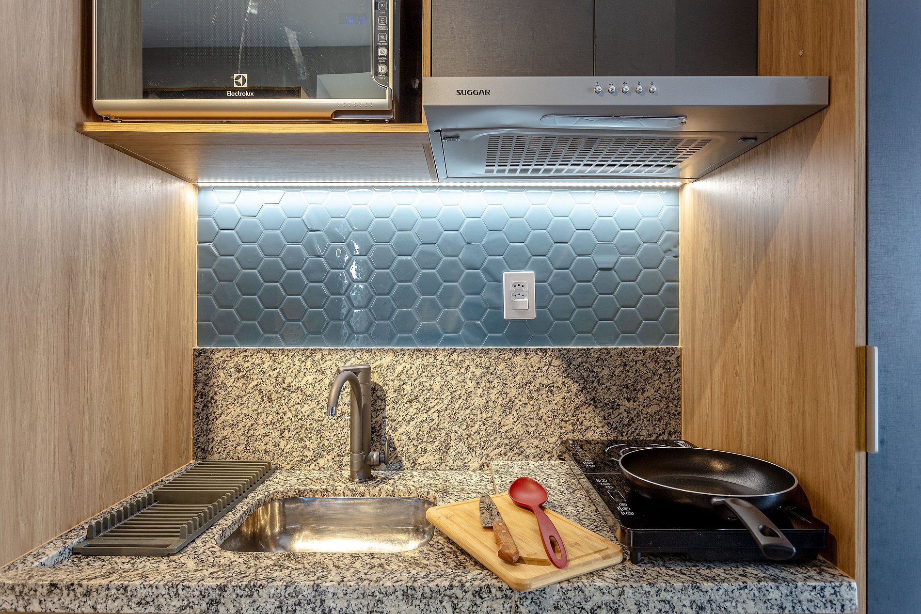 * Cozinha completa, equipada com geladeira, micro-ondas, fogão cooktop 2 bocas e todos os utensílios necessários para preparar suas refeições