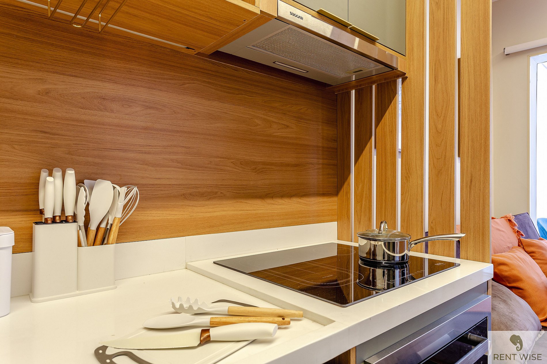 * Cozinha completa, equipada com geladeira, micro-ondas, fogão cooktop, forno, airfryer e todos os utensílios necessários para preparar suas refeições
