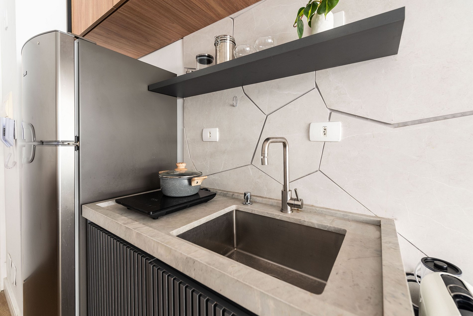 * Cozinha completa, equipada com geladeira, micro-ondas, fogão cooktop e todos os utensílios necessários para preparar suas refeições