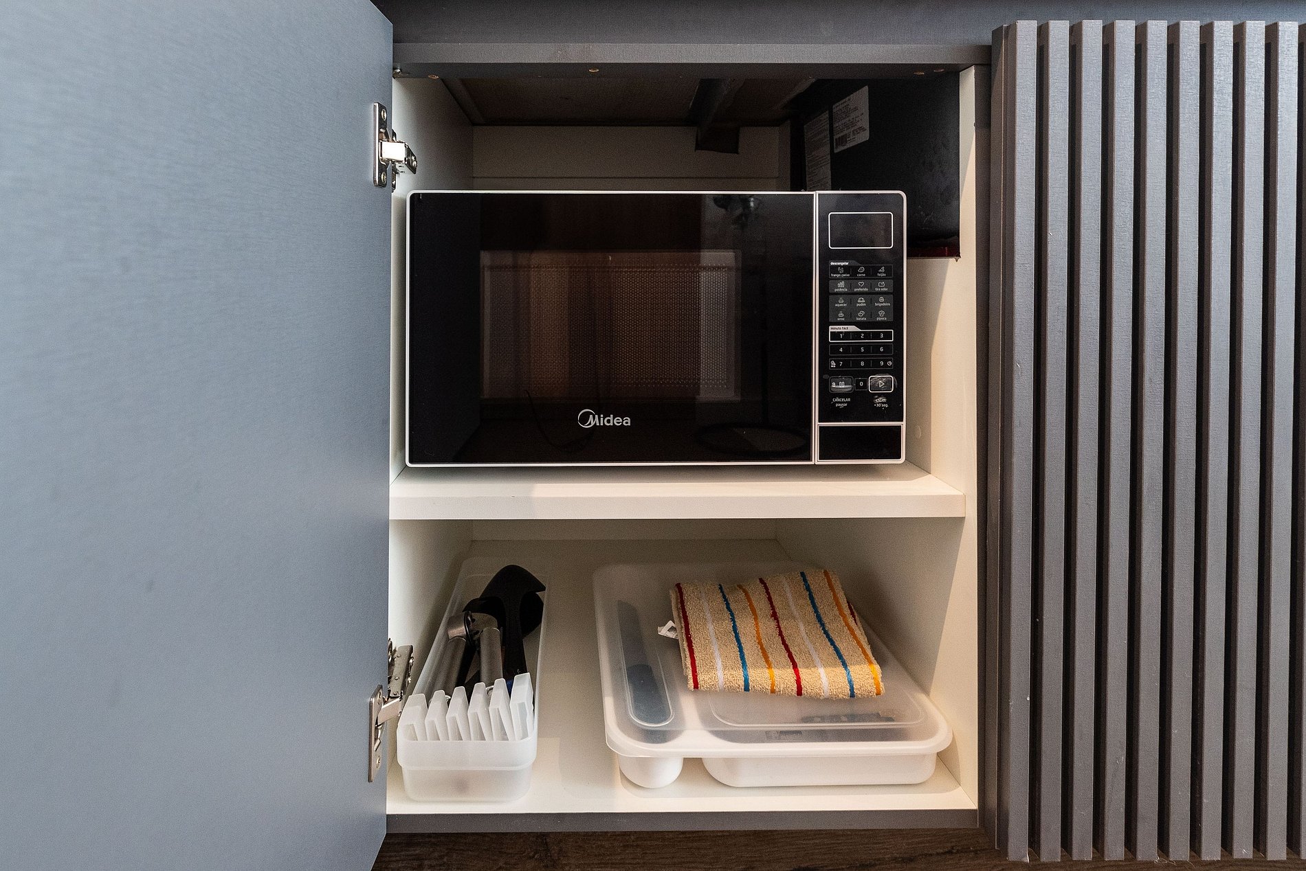 * Cozinha completa, equipada com geladeira, micro-ondas, fogão cooktop e todos os utensílios necessários para preparar suas refeições