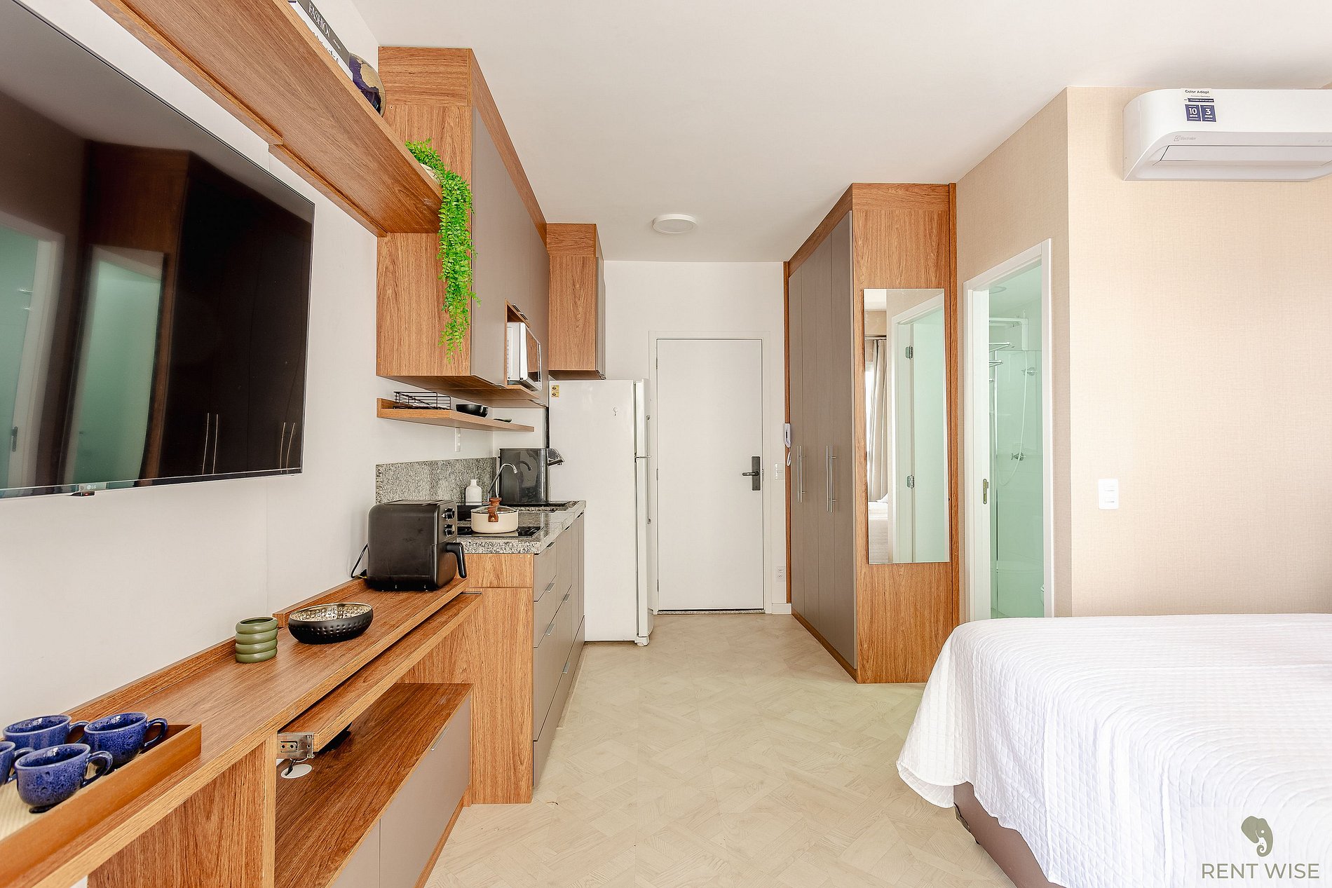 * Cozinha completa, equipada com geladeira, micro-ondas, fogão cooktop, airfyer e todos os utensílios necessários para preparar suas refeições