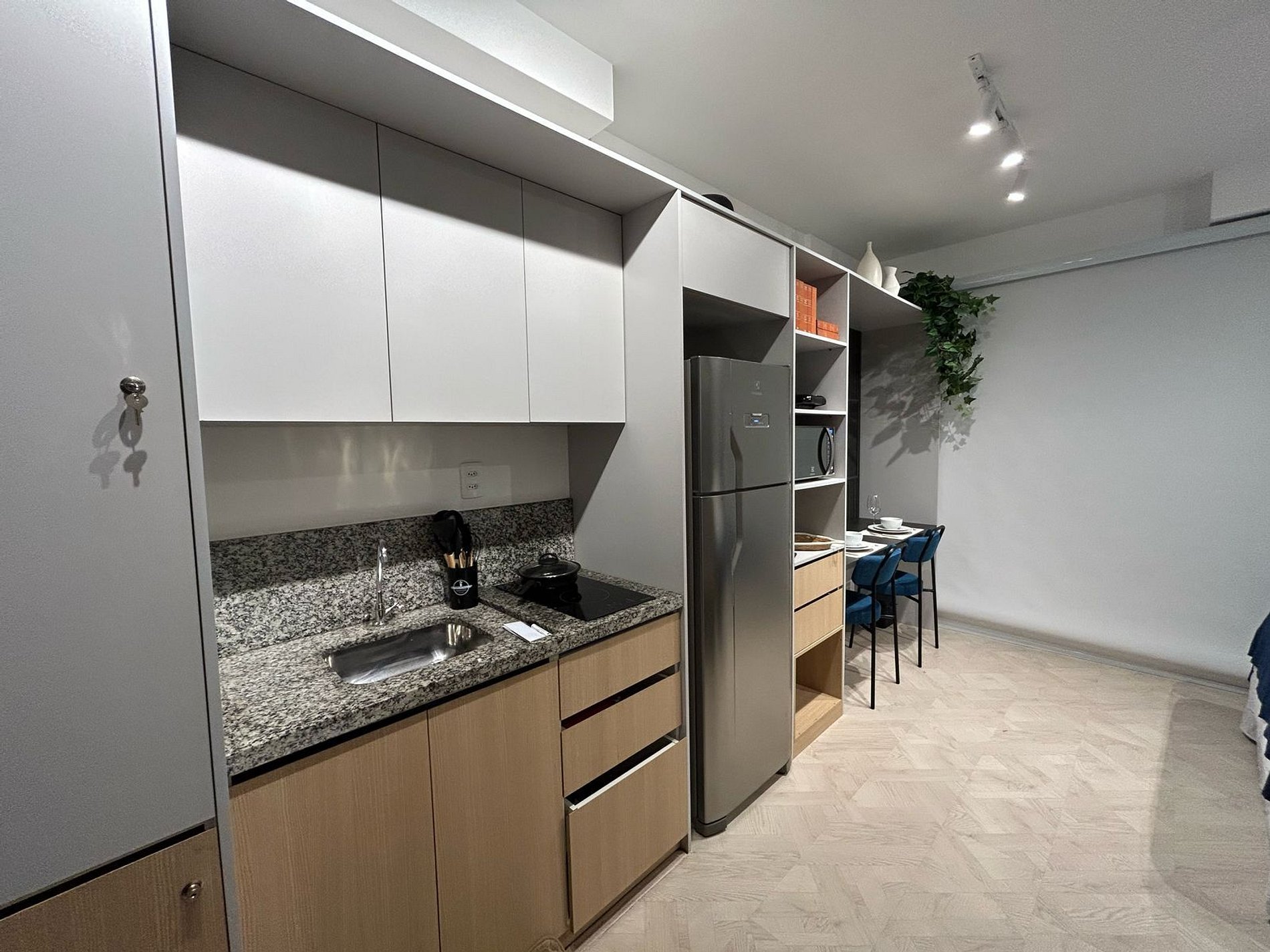 * Cozinha completa, equipada com geladeira, micro-ondas, fogão cooktop e todos os utensílios necessários para preparar suas refeições