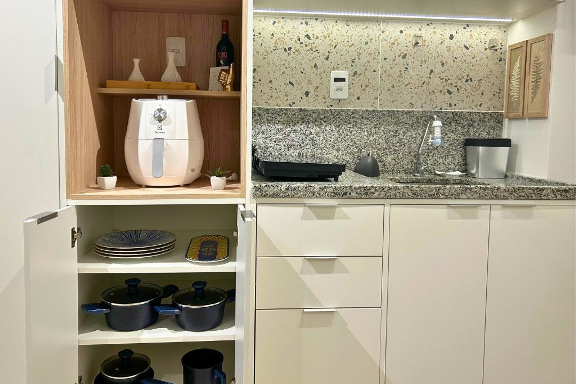 * Cozinha completa, equipada com geladeira, micro-ondas, fogão cooktop, airfryer, máquina de café Nespresso e todos os utensílios necessários para preparar suas refeições