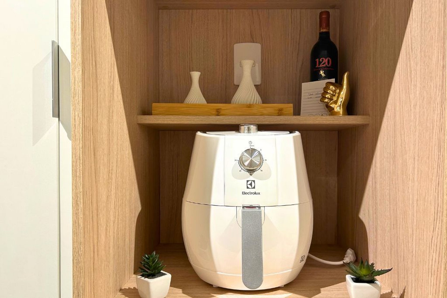 * Cozinha completa, equipada com geladeira, micro-ondas, fogão cooktop, airfryer, máquina de café Nespresso e todos os utensílios necessários para preparar suas refeições