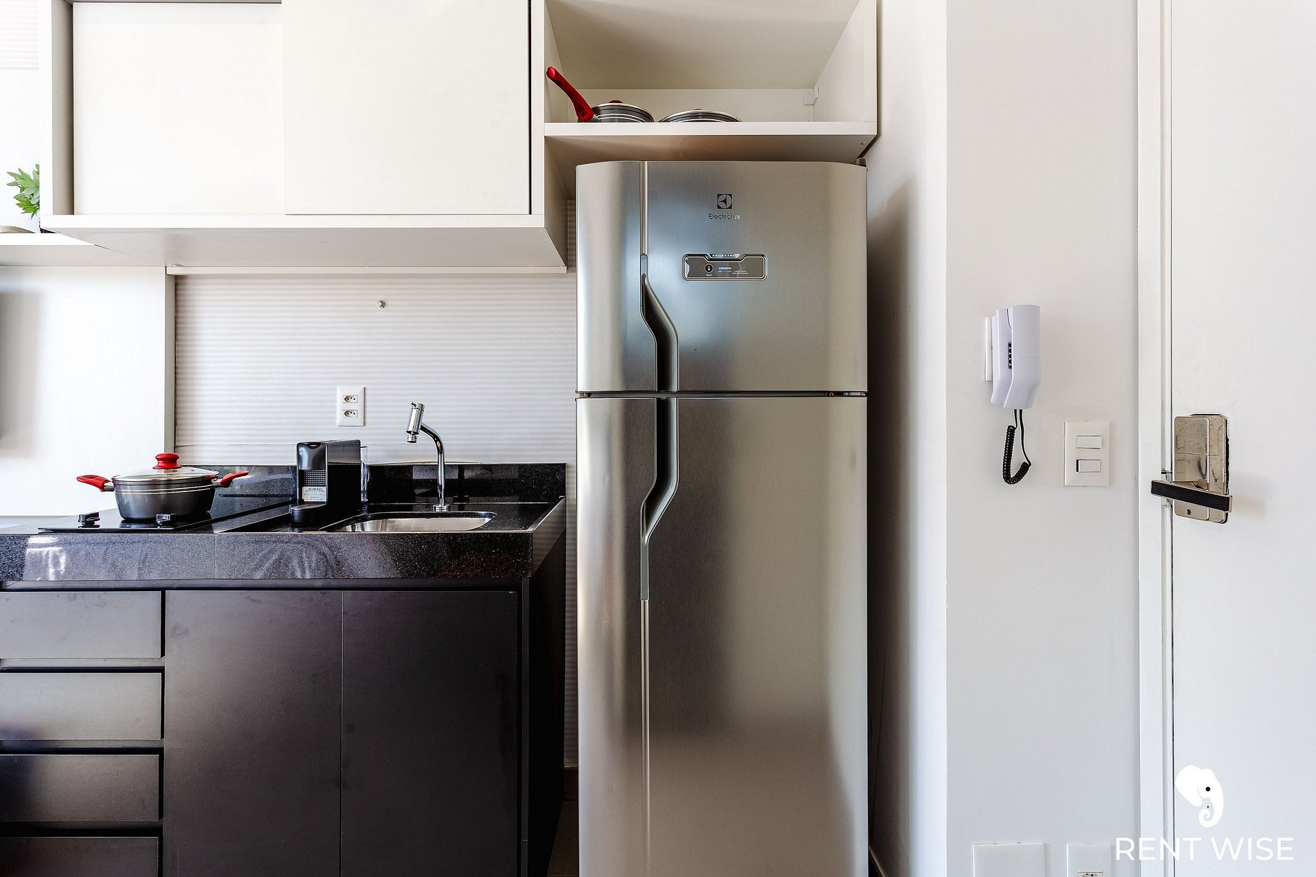 - Cozinha equipada com cooktop por indução, micro-ondas, cafeteira Nespresso, Airfryer, sanduicheira e utensílios essenciais.