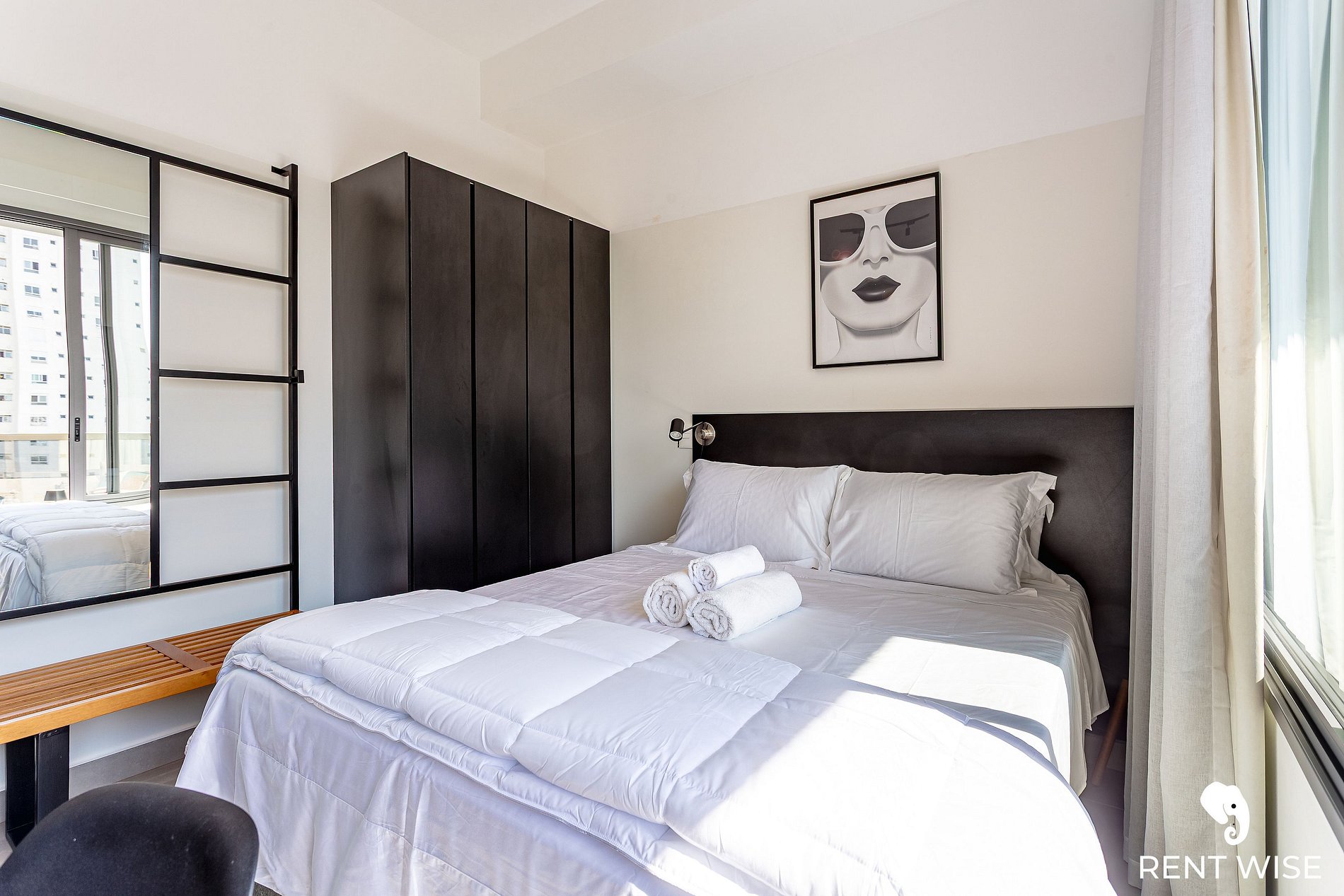 - Cama de casal com roupa de cama e banho de qualidade.