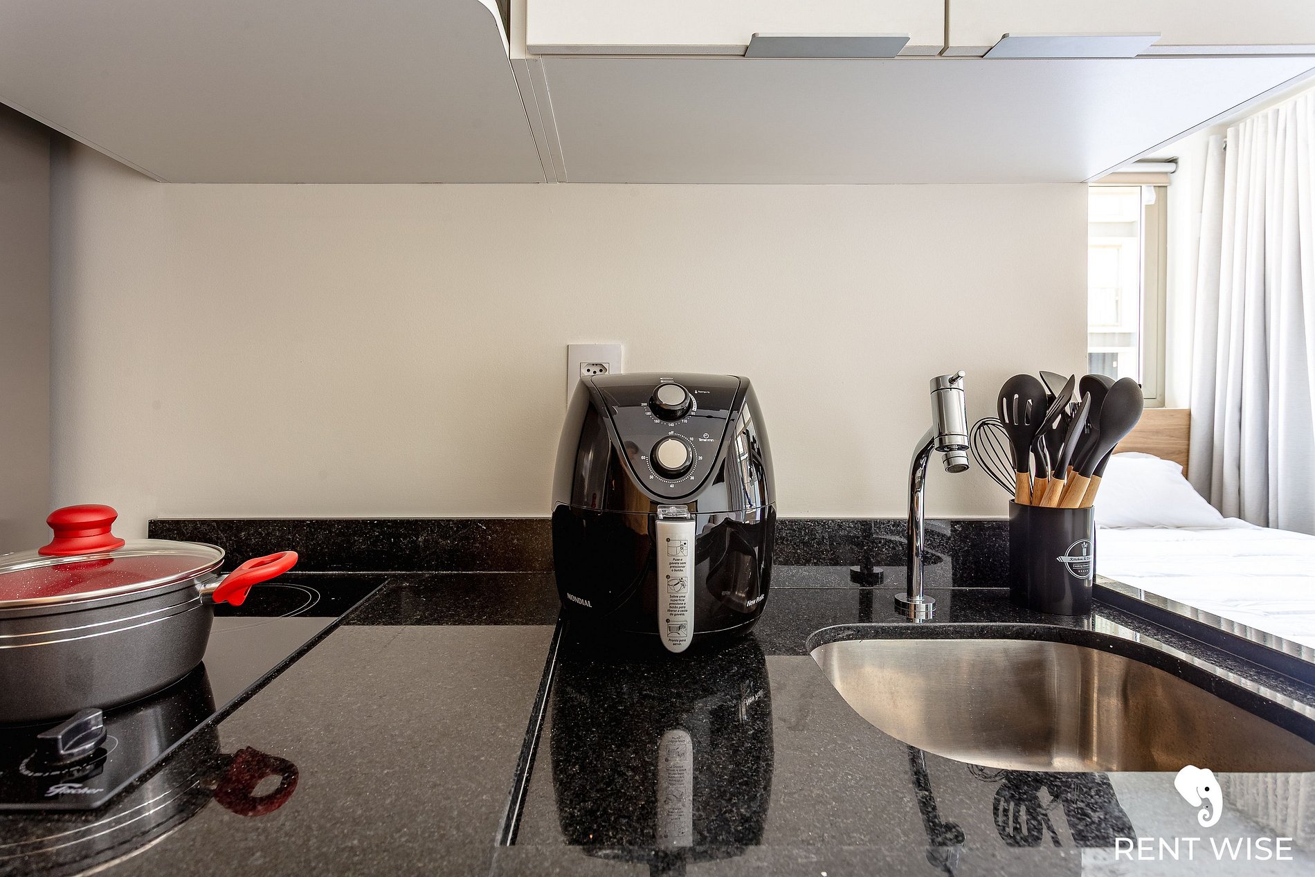 - Cozinha equipada com cooktop por indução, micro-ondas, cafeteira elétrica, sanduicheira, Airfryer e utensílios essenciais.