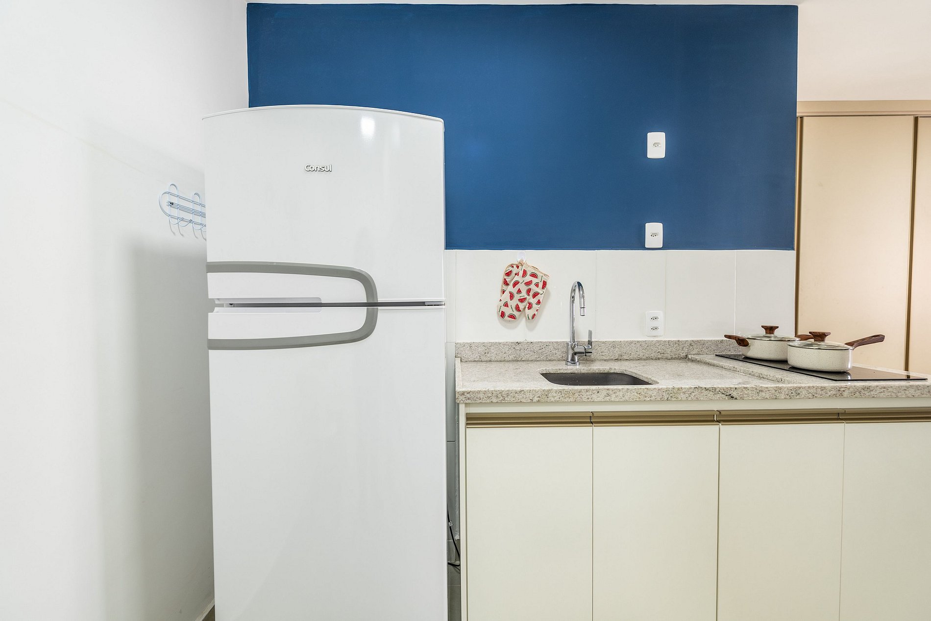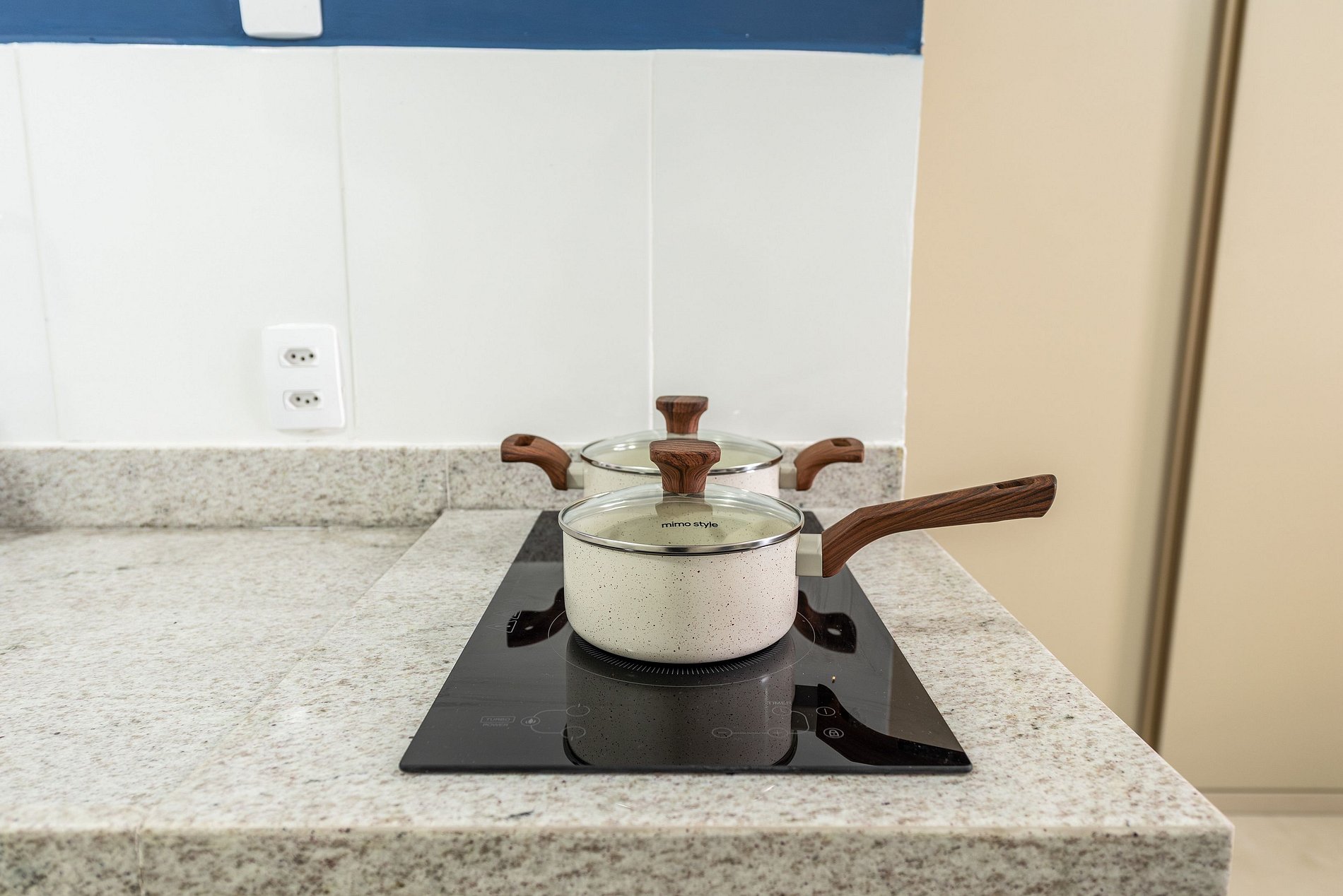 - Cozinha americana com fogão de indução 2 bocas, micro-ondas, sanduicheira, cafeteira elétrica, liquidificador e chaleira elétrica.