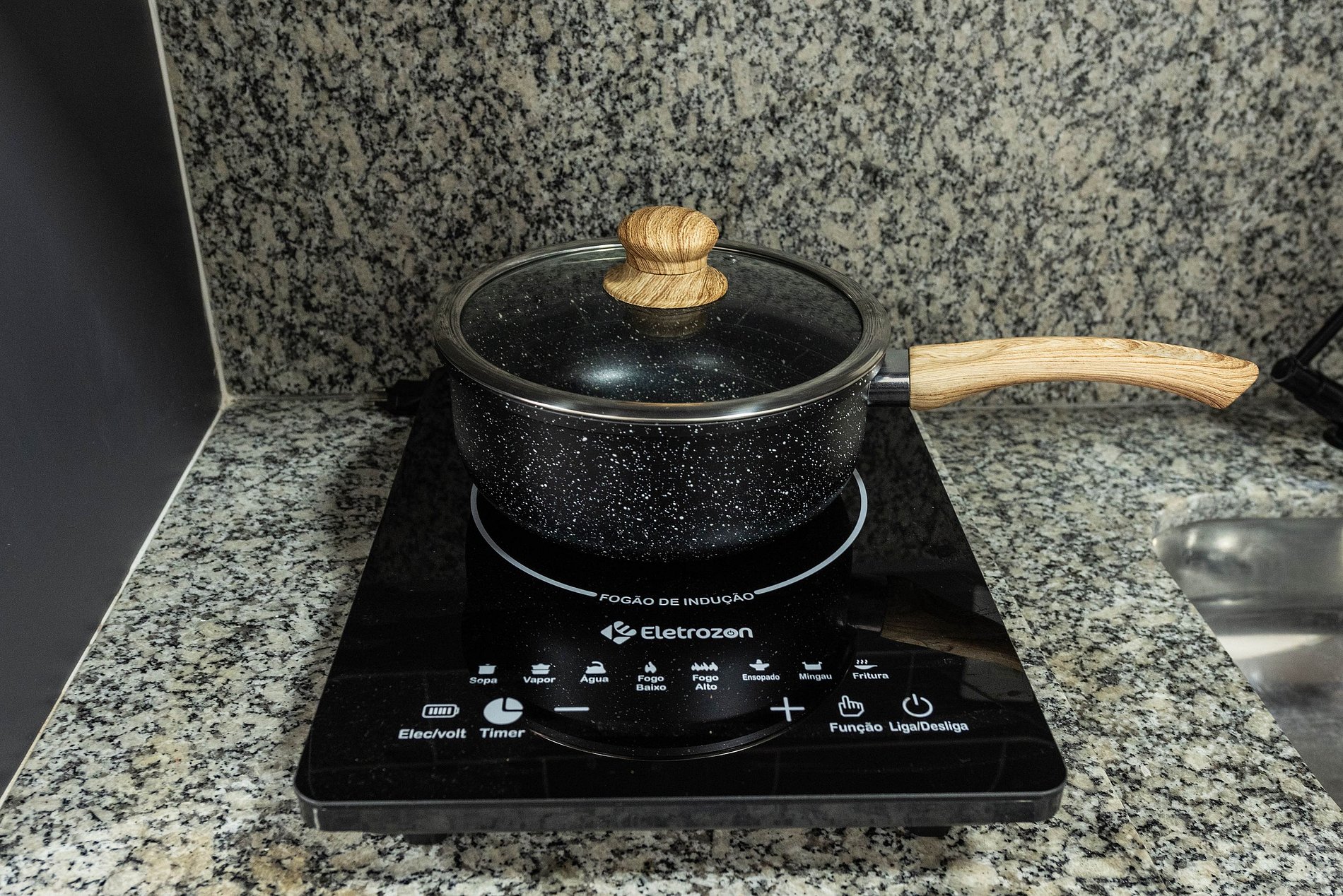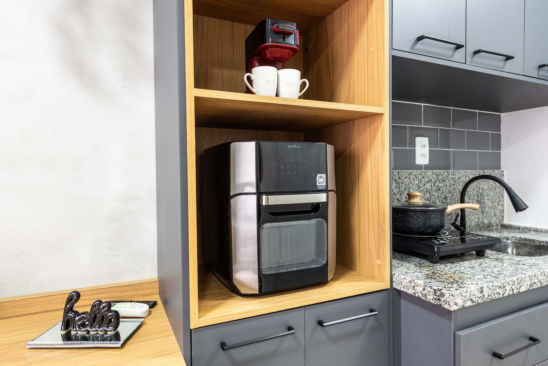 * Cozinha completa, equipada com geladeira, fogão cooktop, air fryer, micro-ondas e todos os utensílios necessários para preparar suas refeições