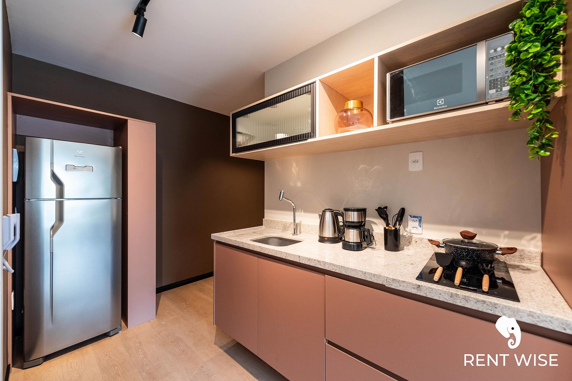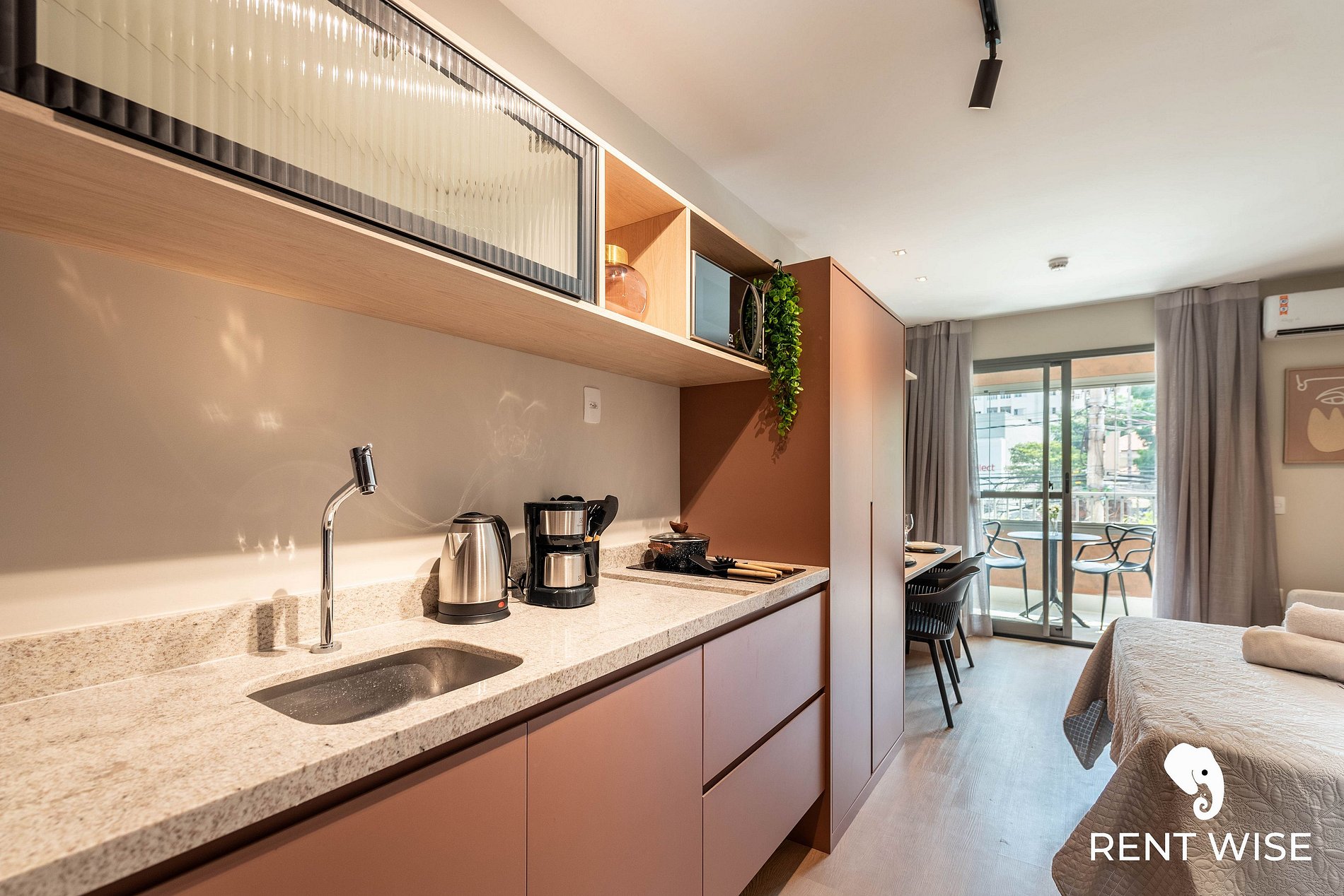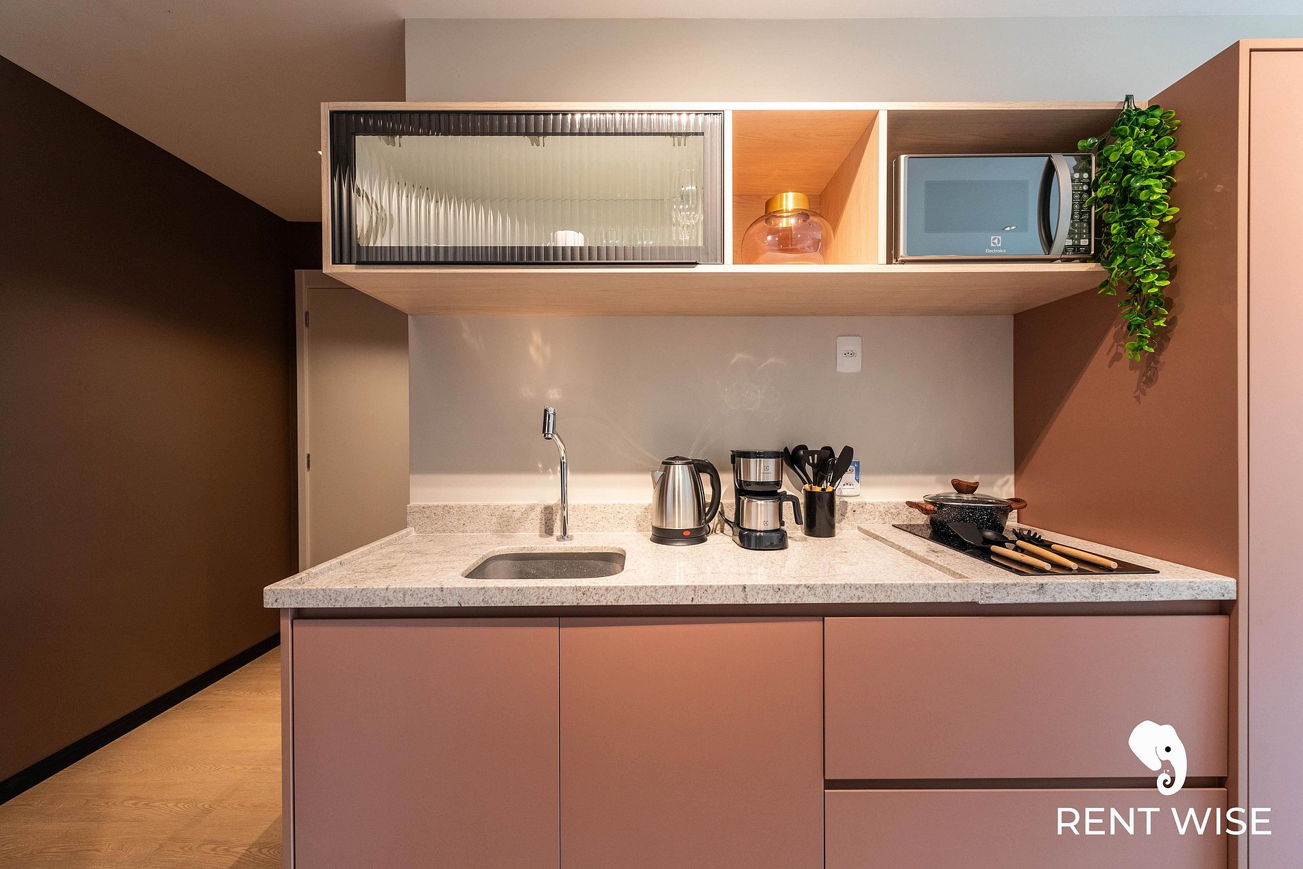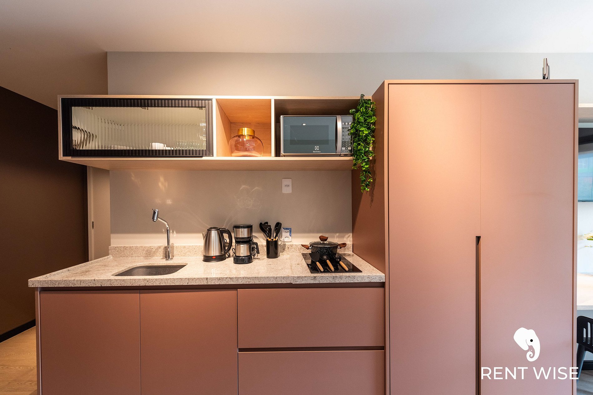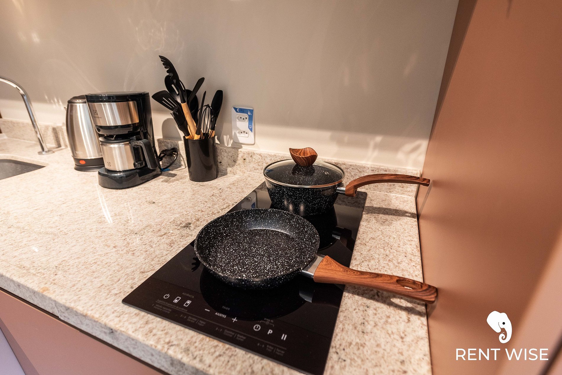 - Cozinha completa com fogão de indução 2 bocas, micro-ondas, liquidificador e cafeteira elétrica