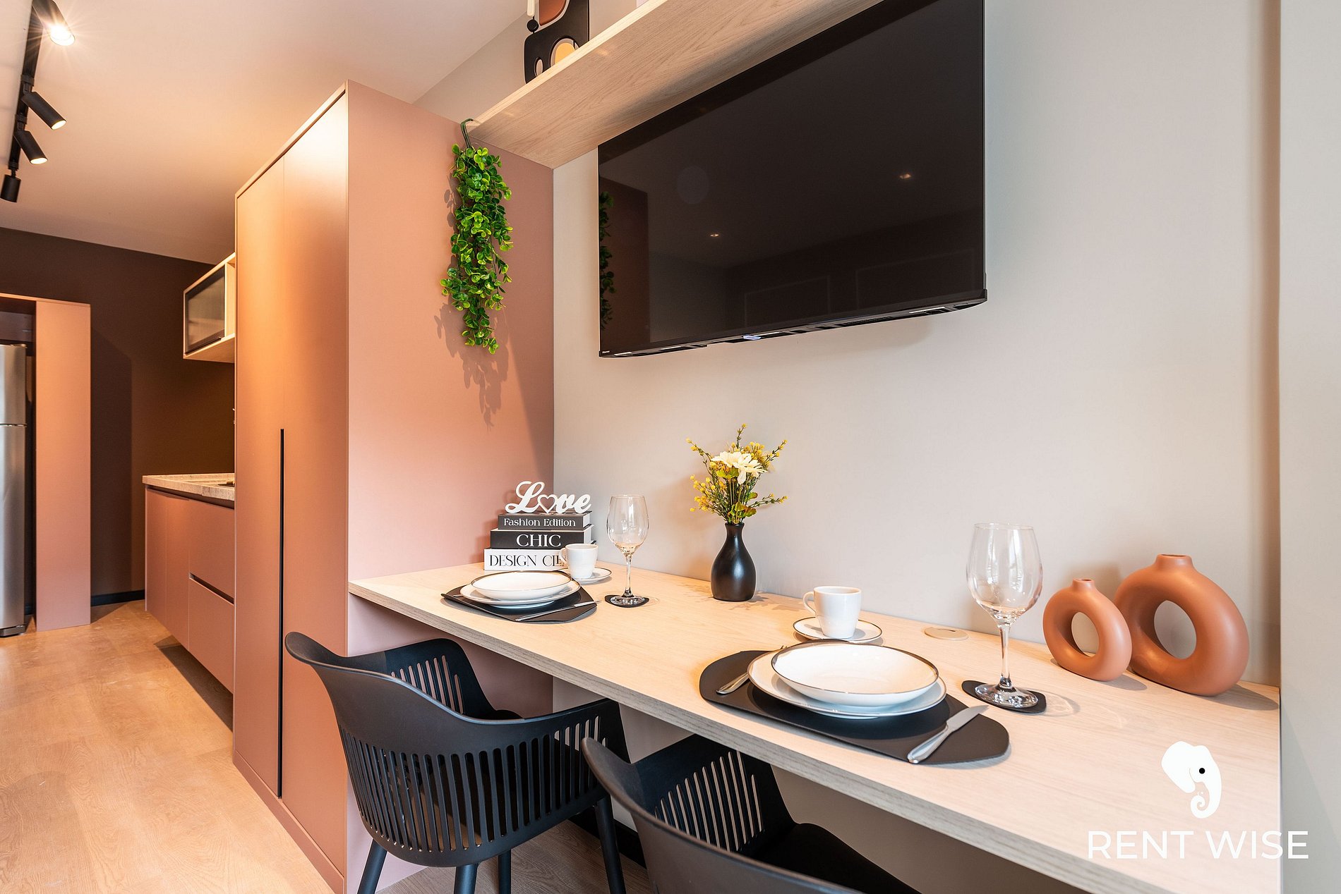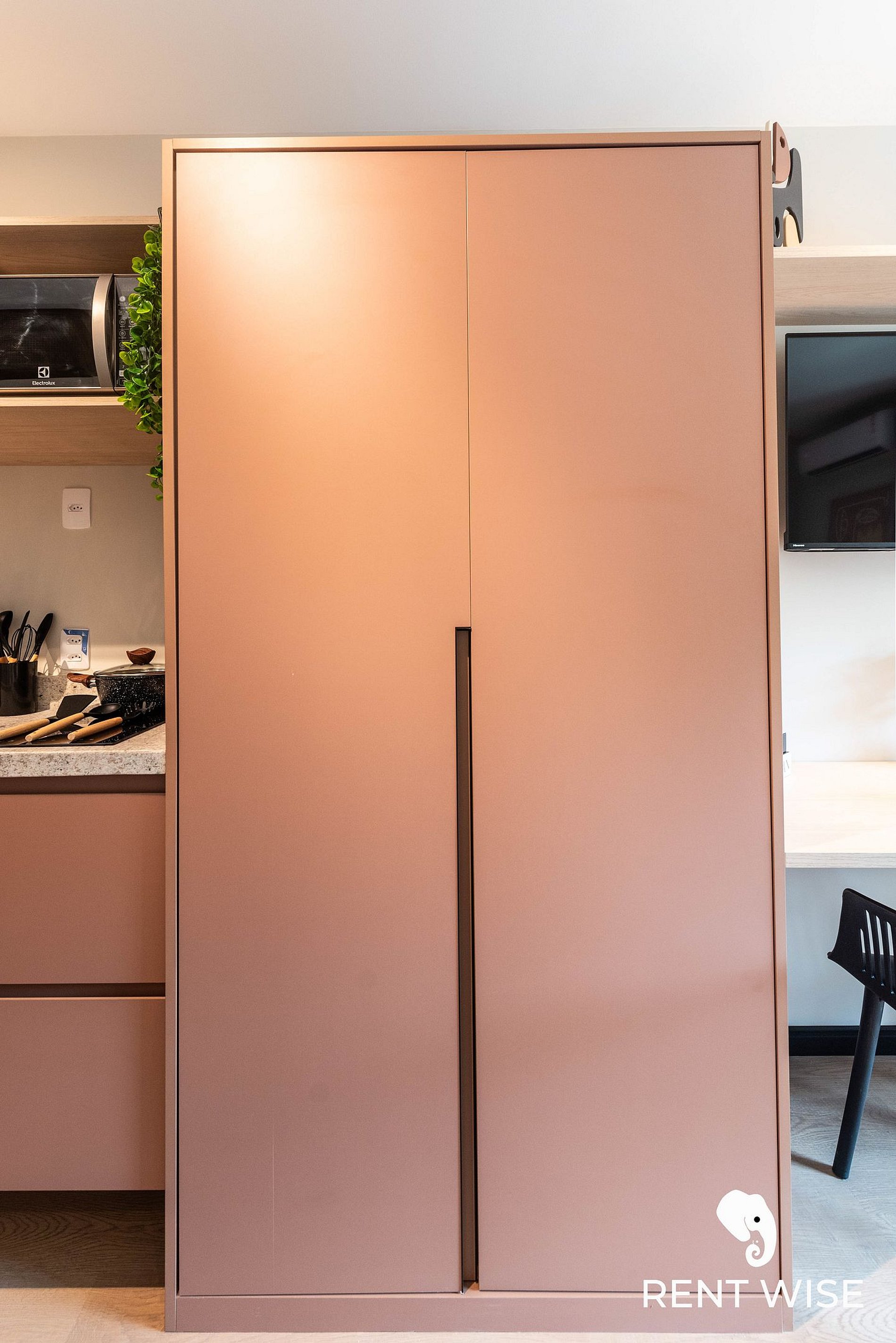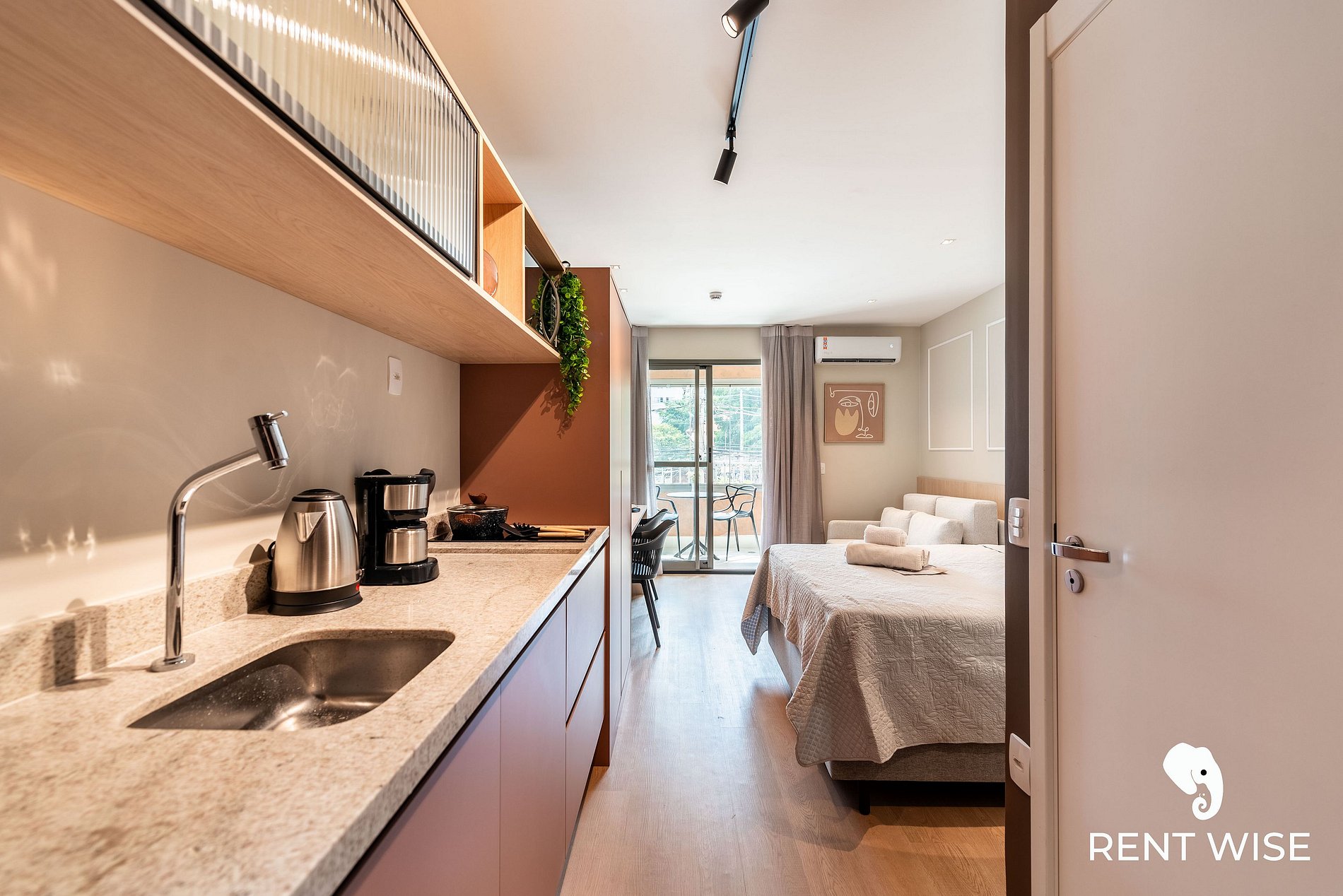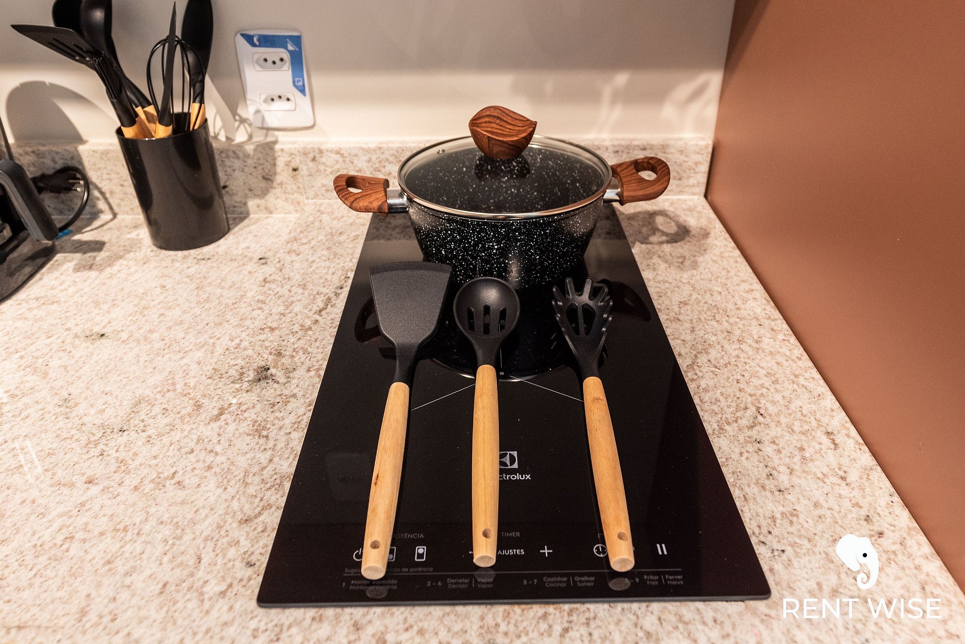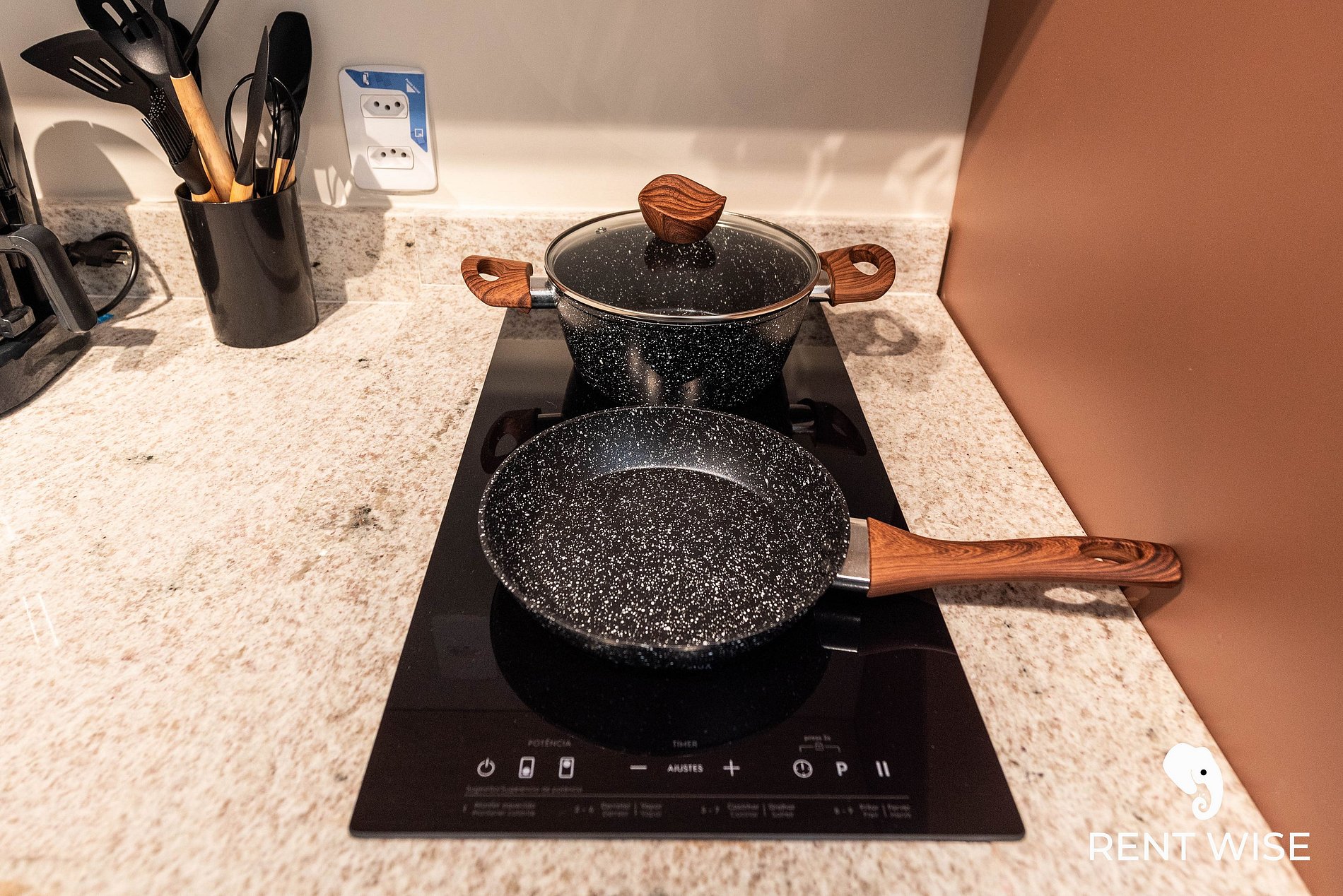 - Cozinha completa com fogão de indução 2 bocas, micro-ondas, liquidificador e cafeteira elétrica