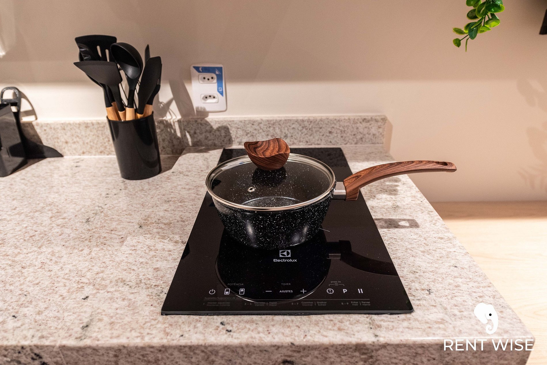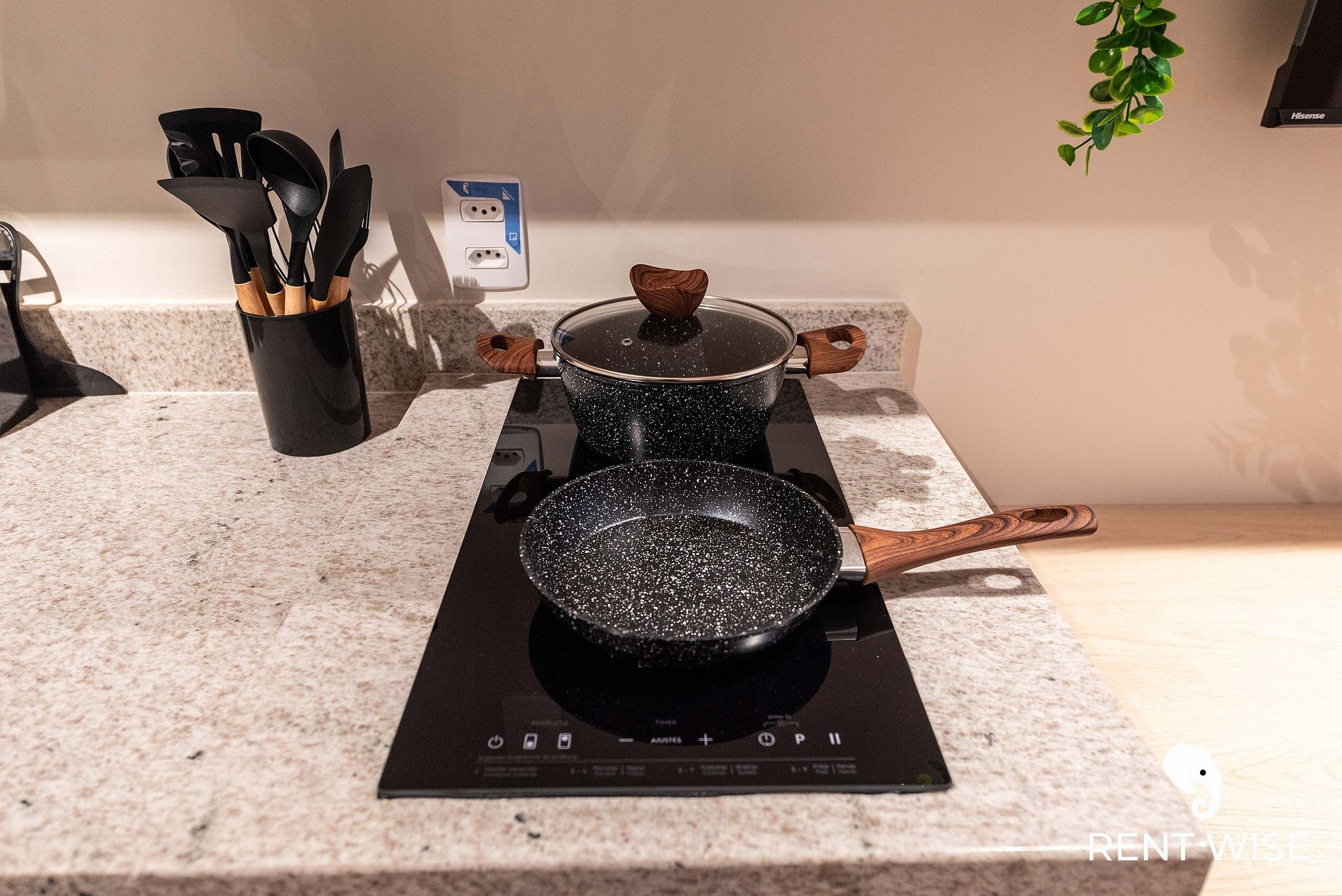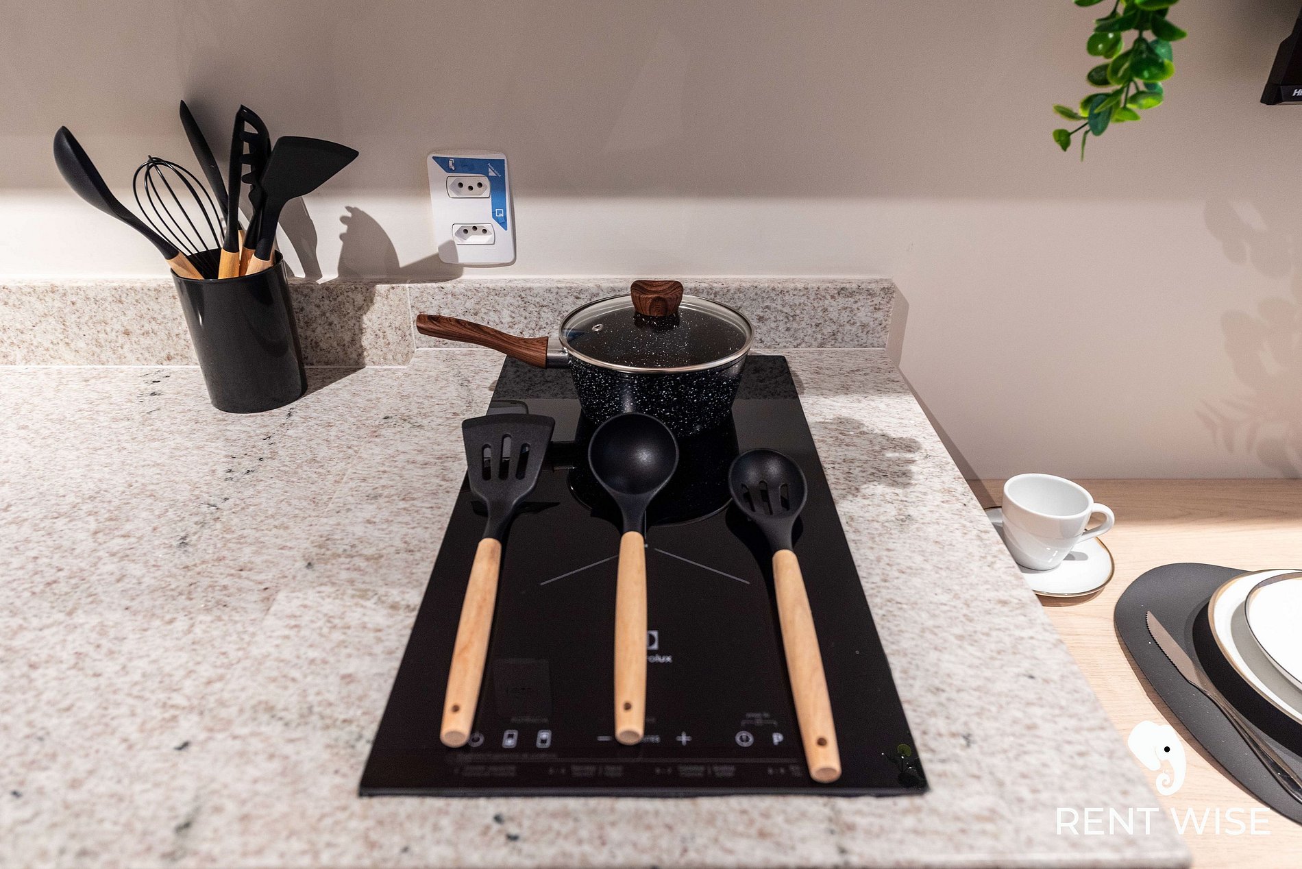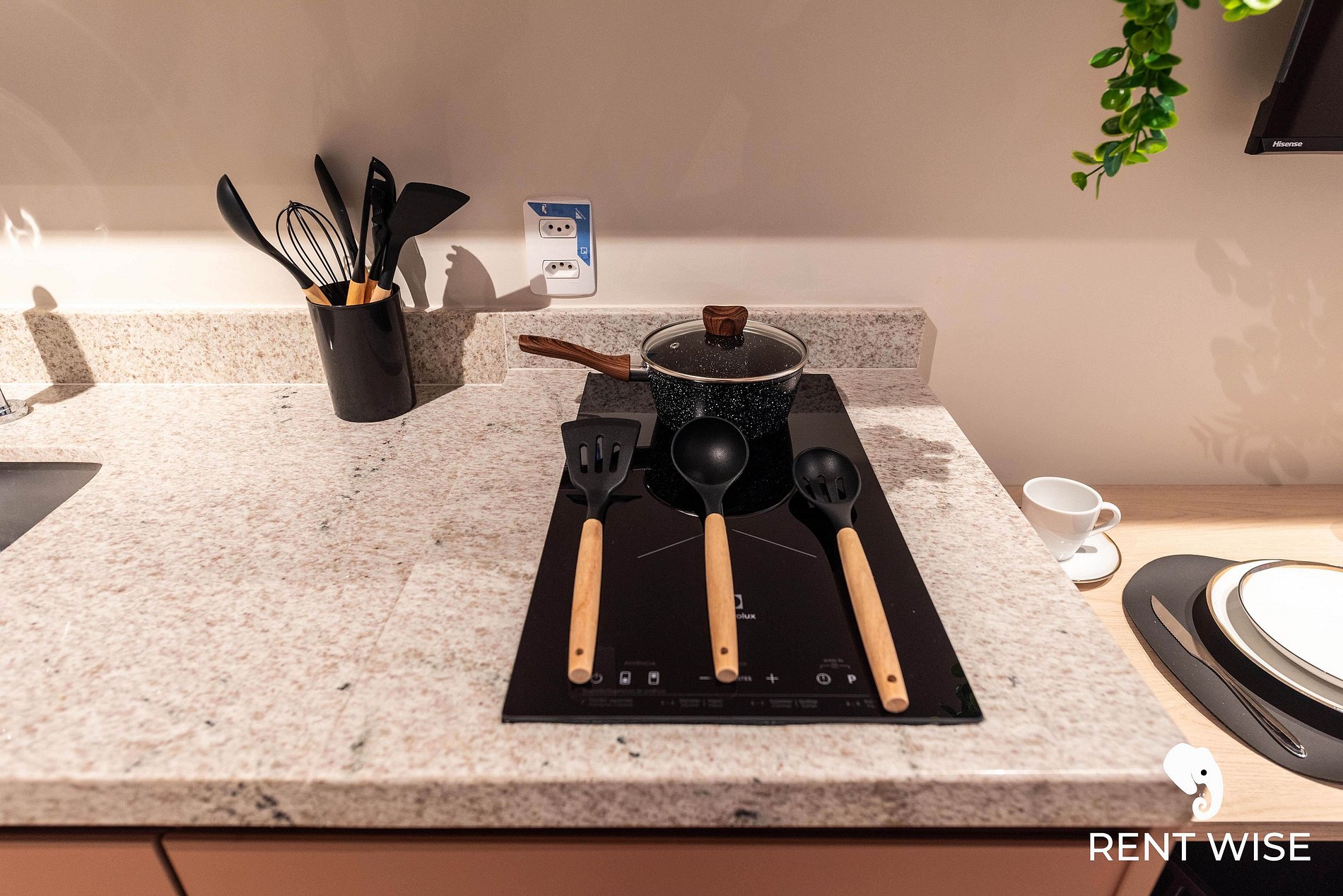 - Cozinha completa com fogão de indução 2 bocas, micro-ondas, liquidificador e cafeteira elétrica
