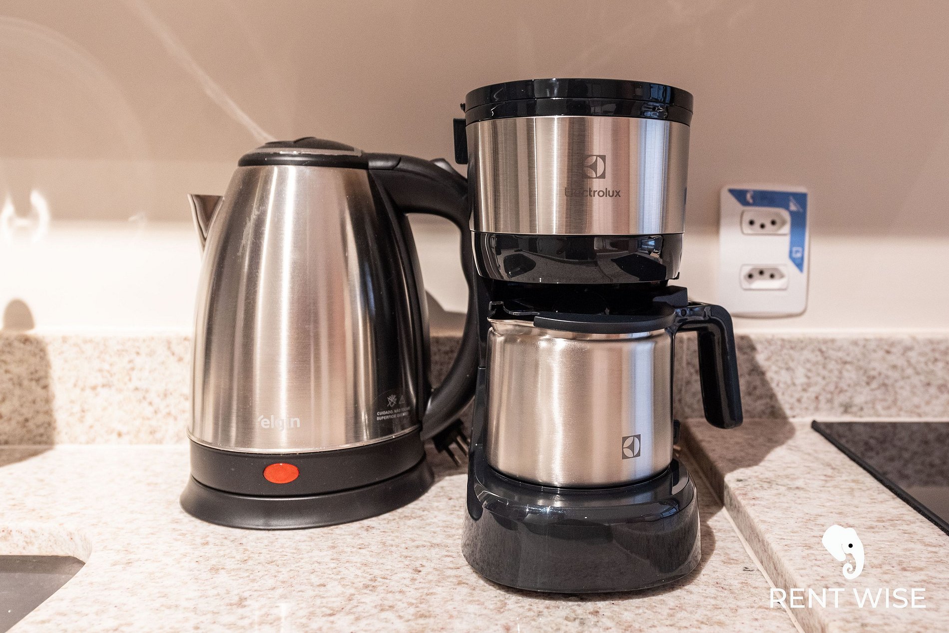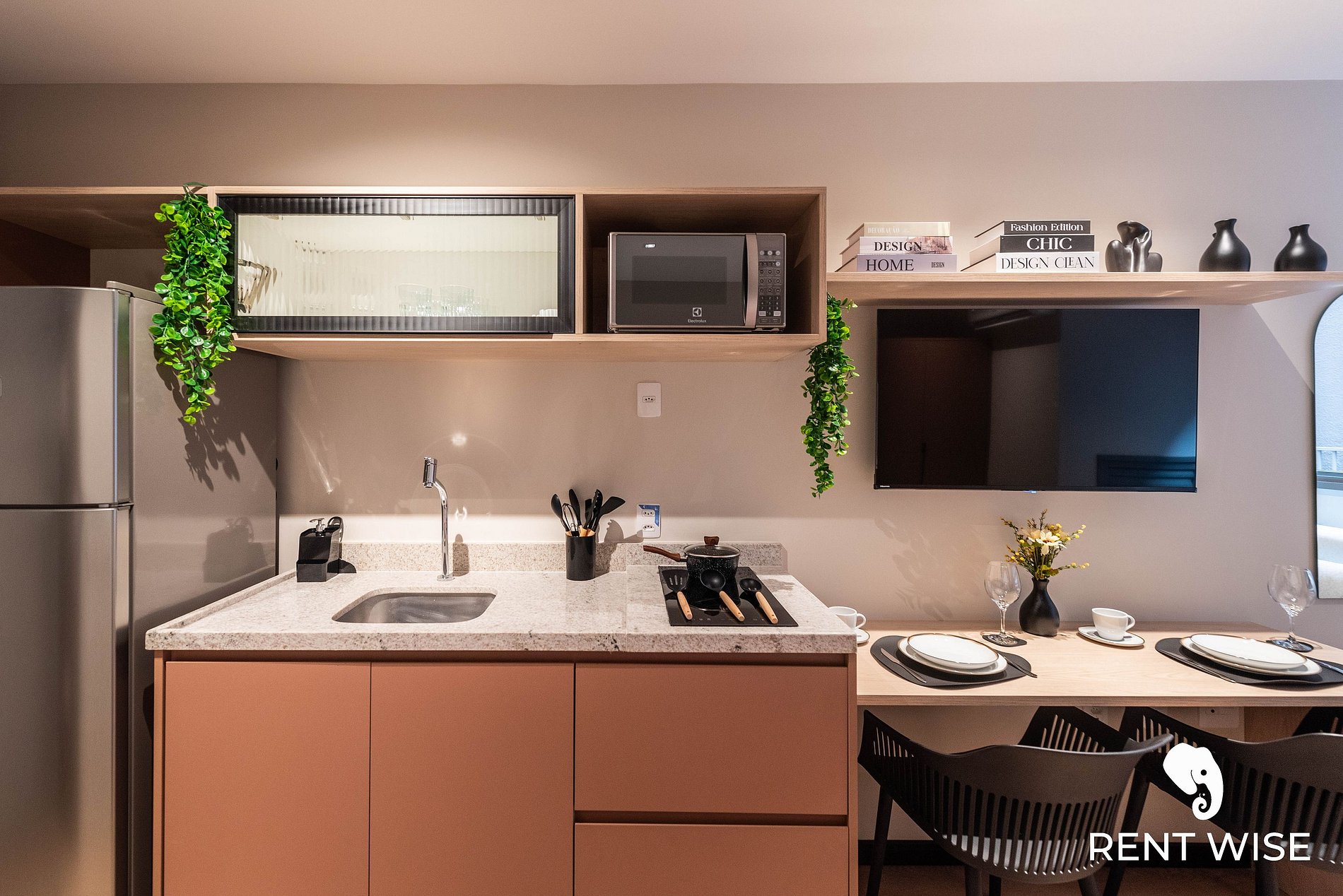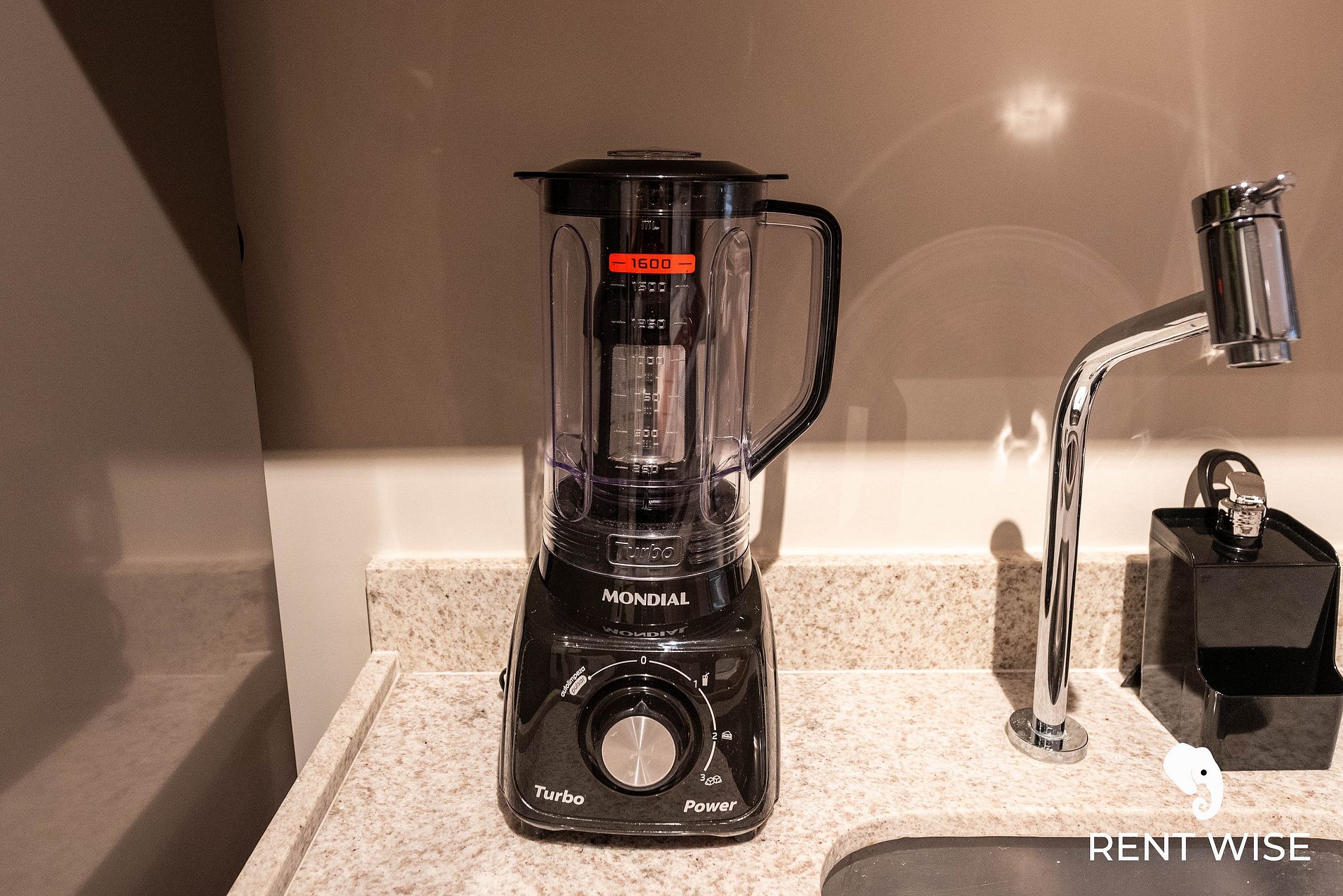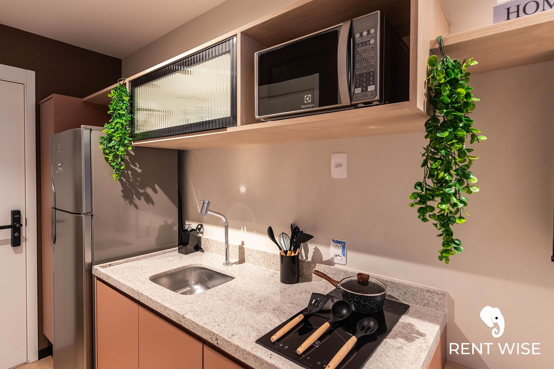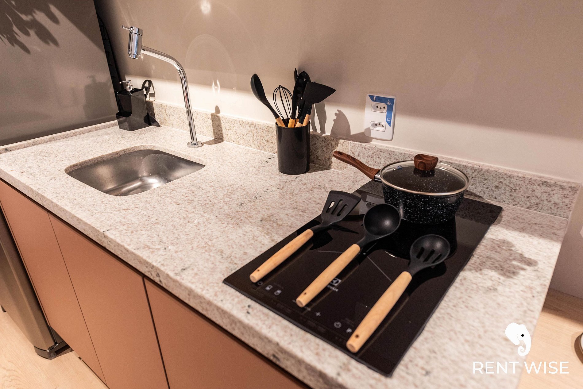 - Cozinha completa com fogão de indução 2 bocas, micro-ondas, liquidificador e cafeteira elétrica