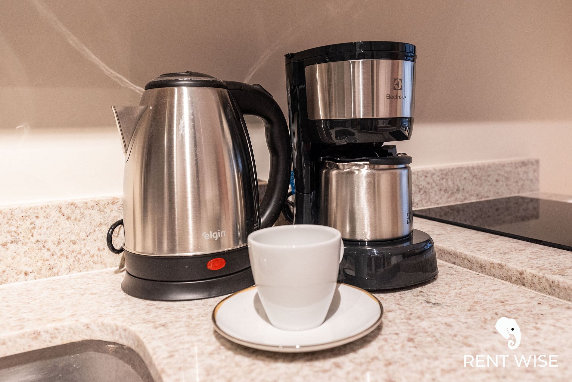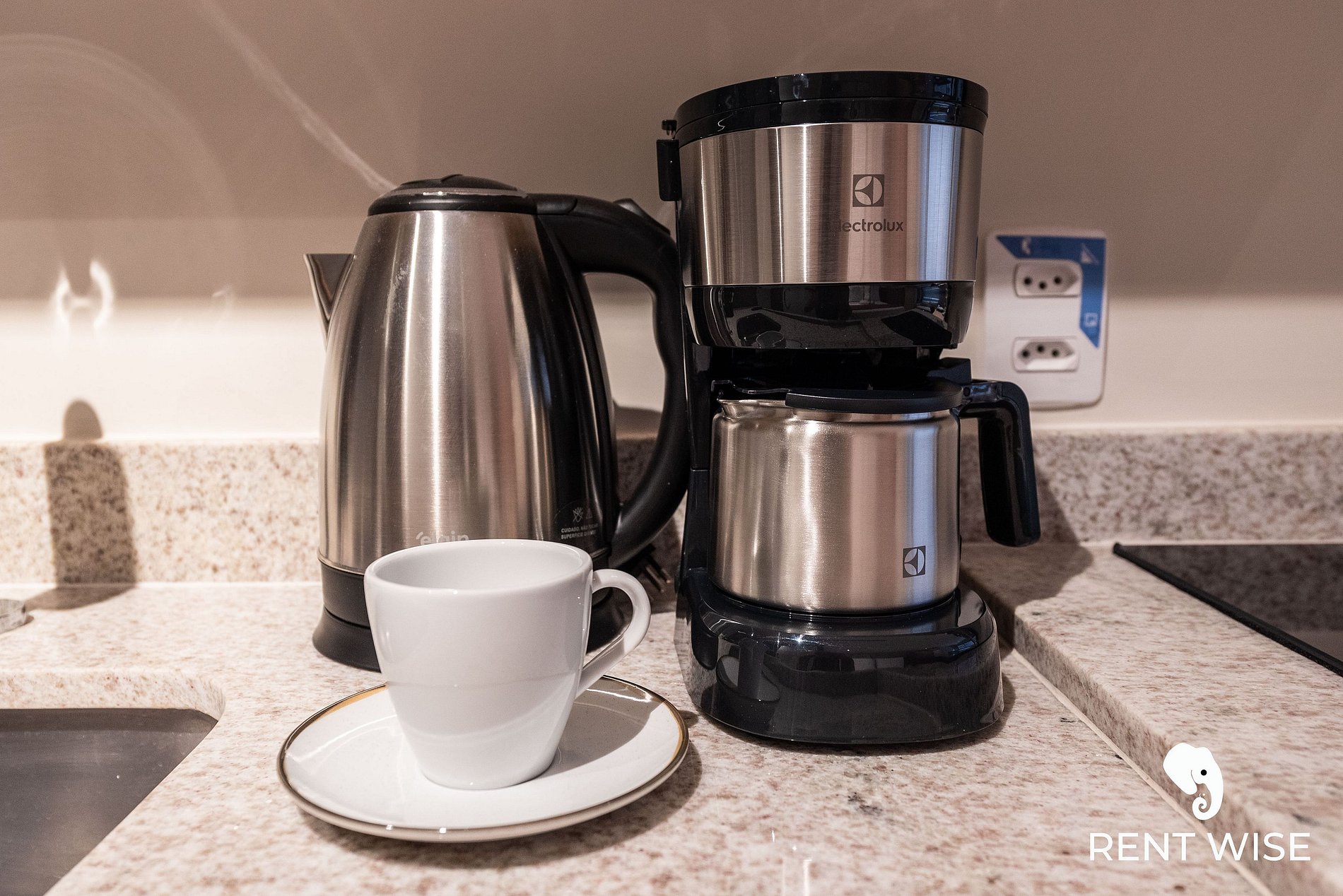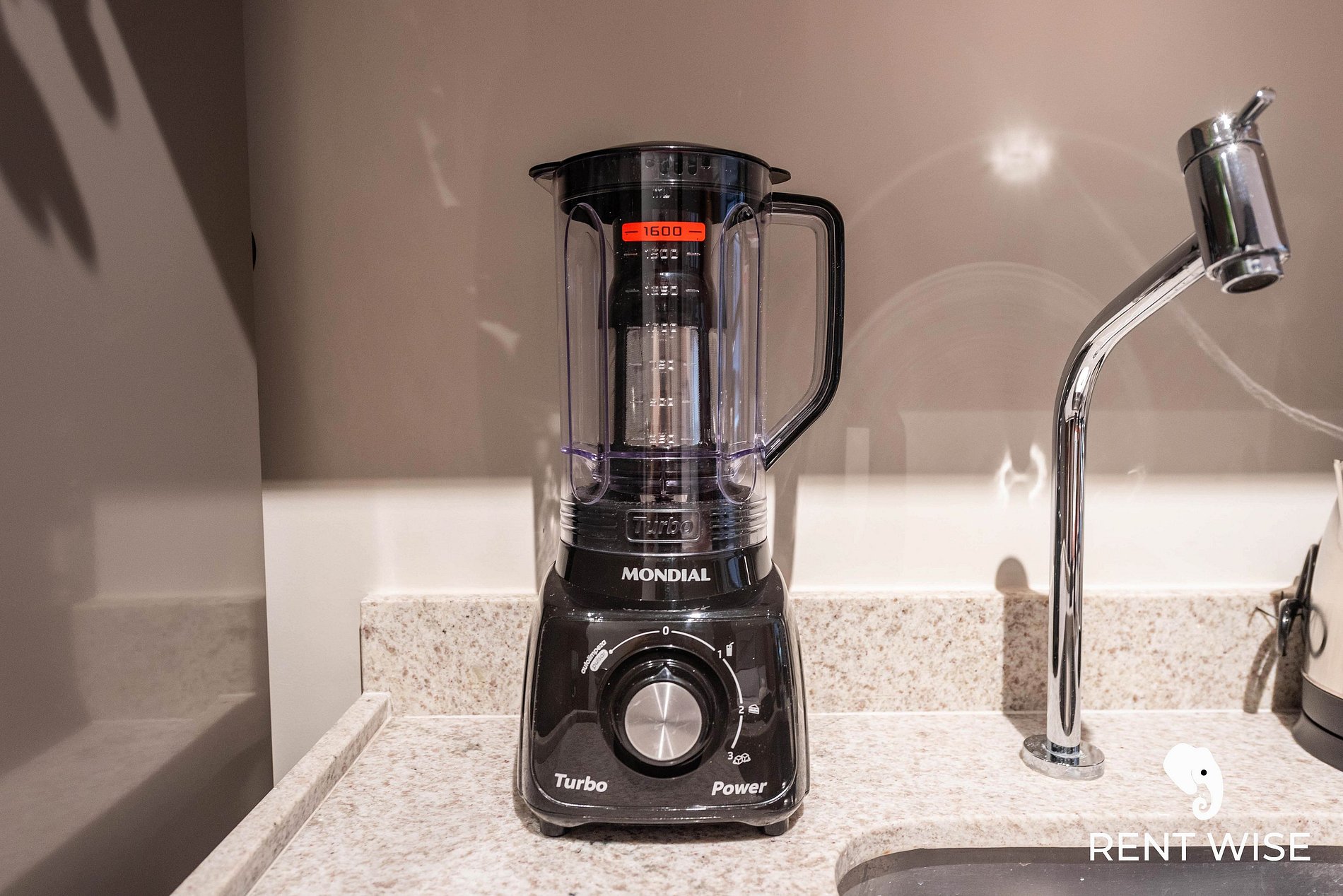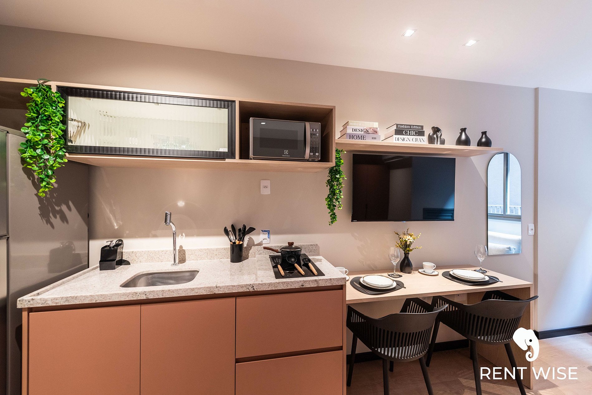 - Cozinha completa com fogão de indução 2 bocas, micro-ondas, liquidificador e cafeteira elétrica