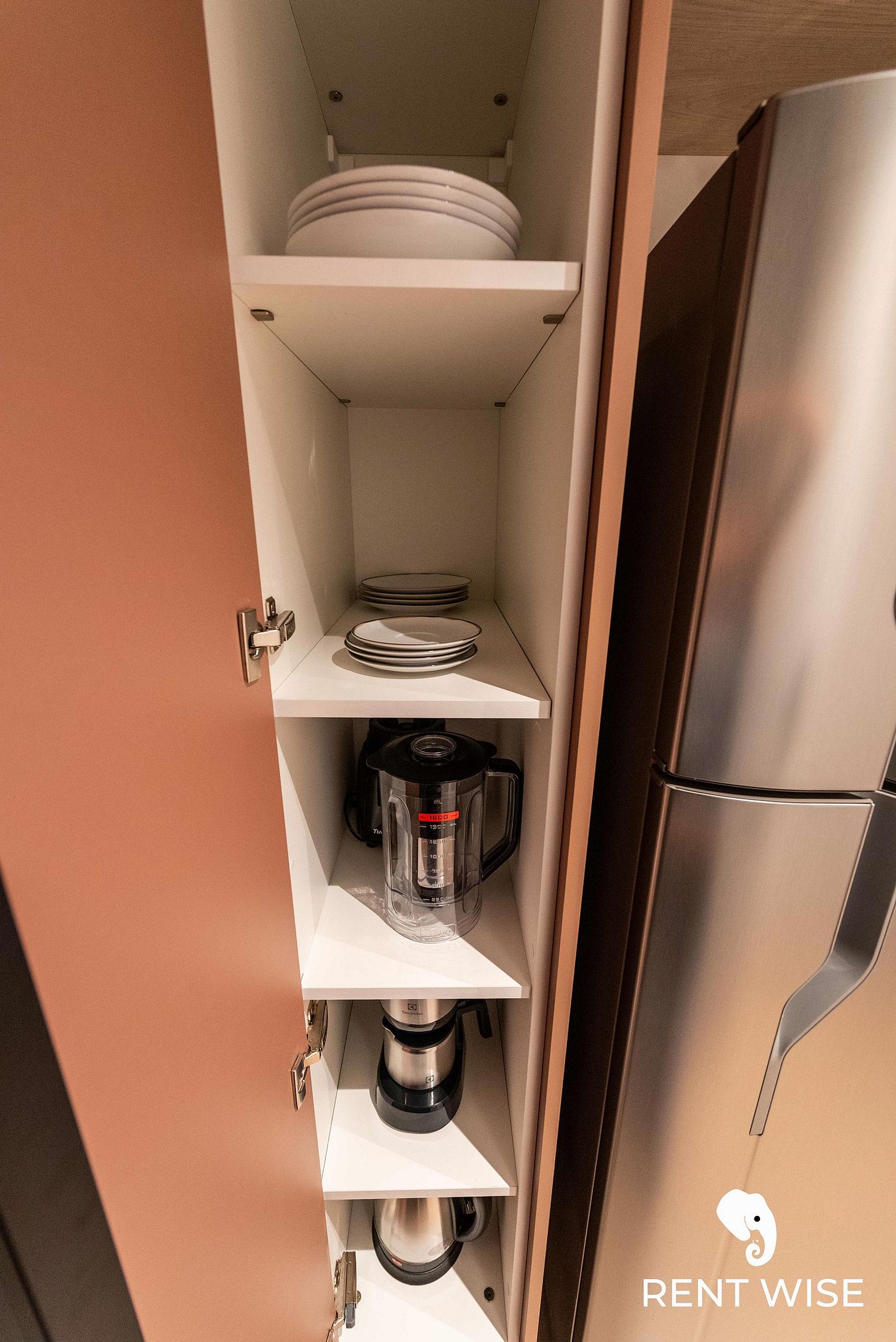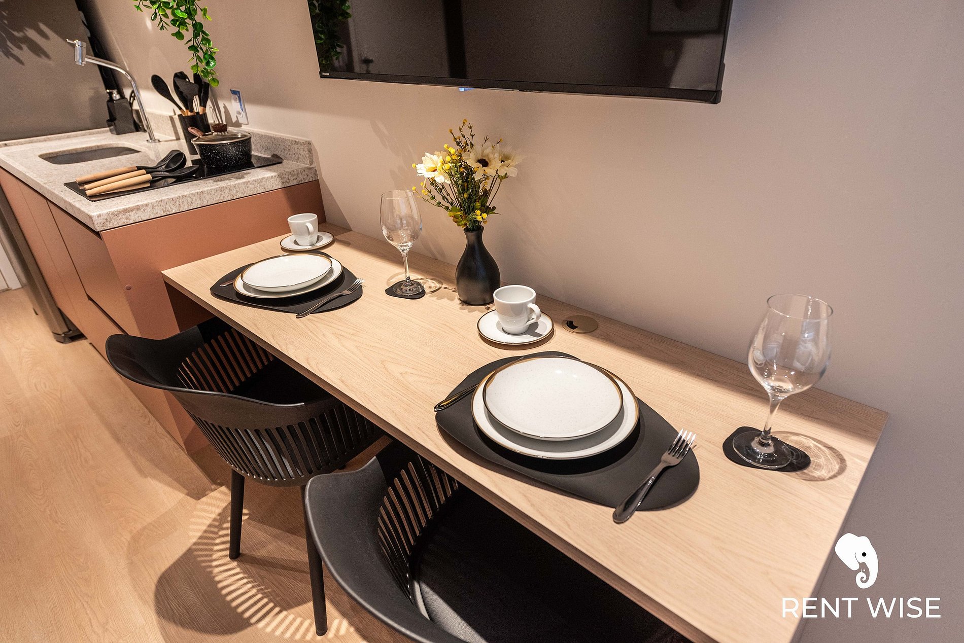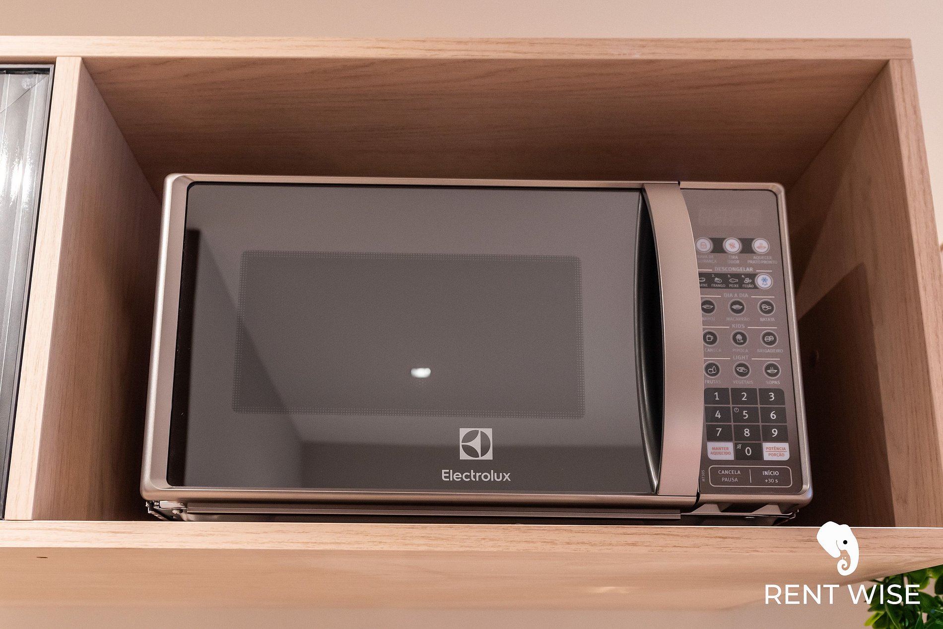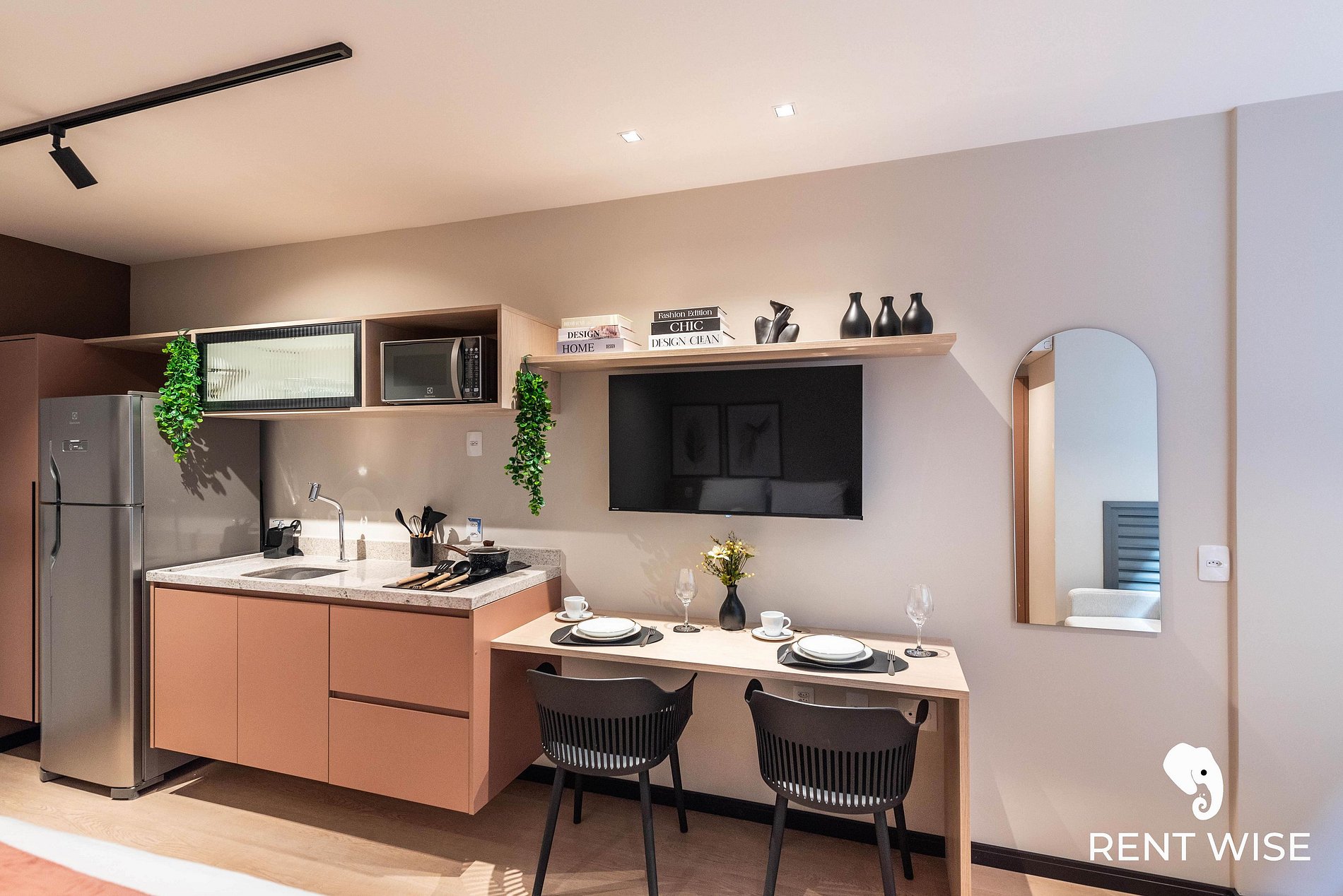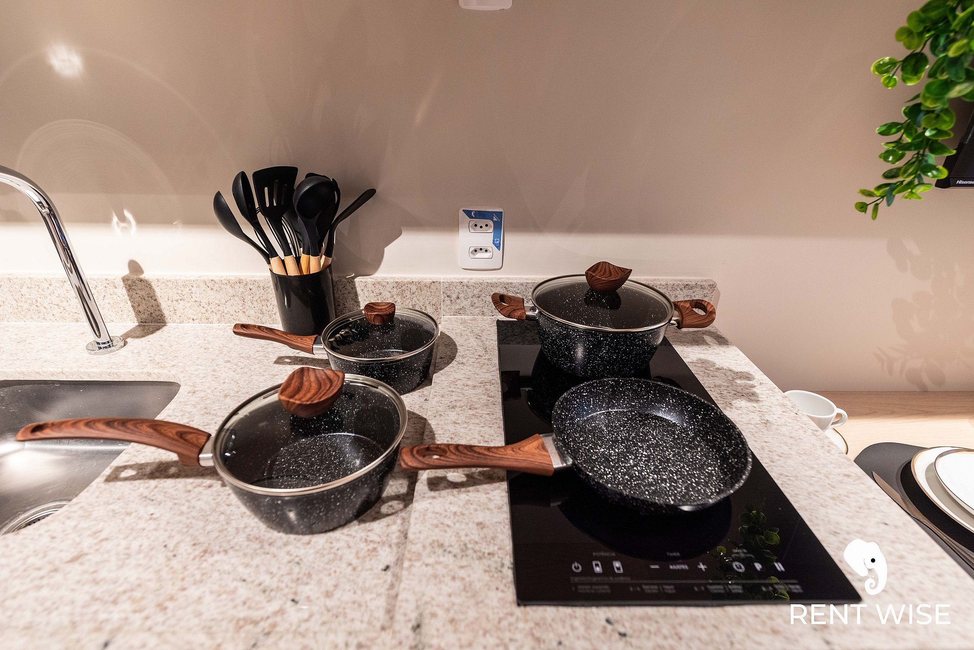 - Cozinha completa com fogão de indução 2 bocas, micro-ondas, liquidificador e cafeteira elétrica