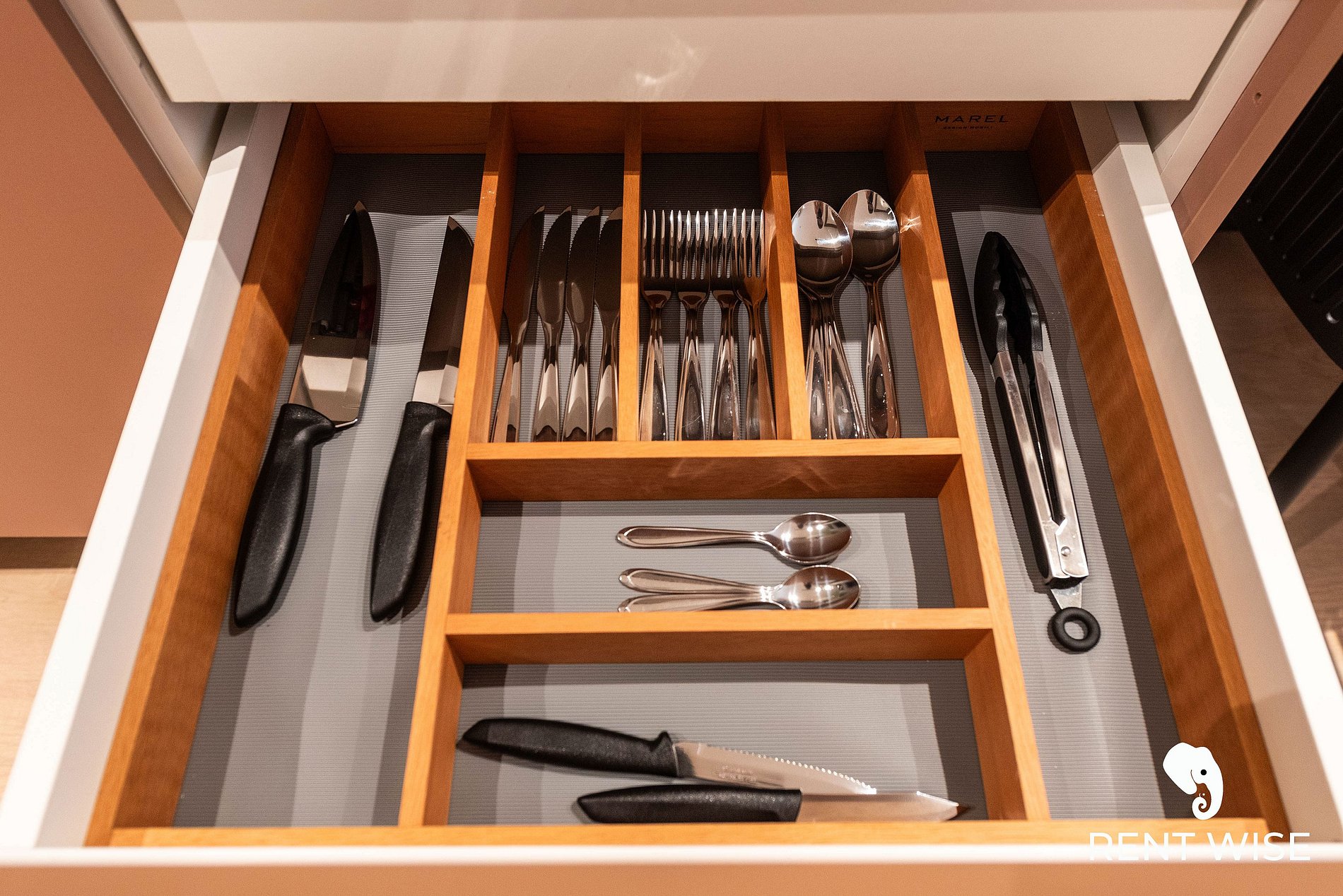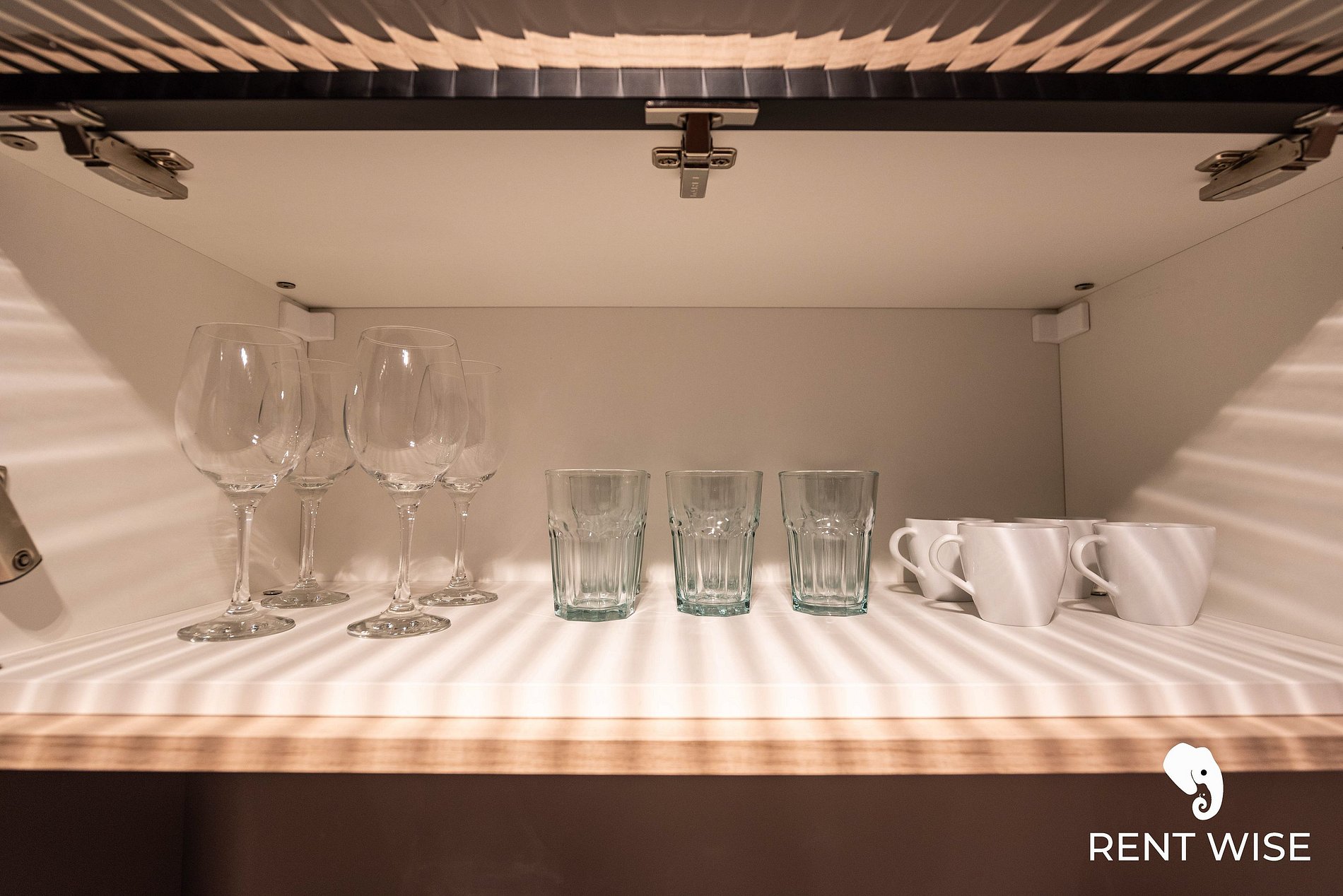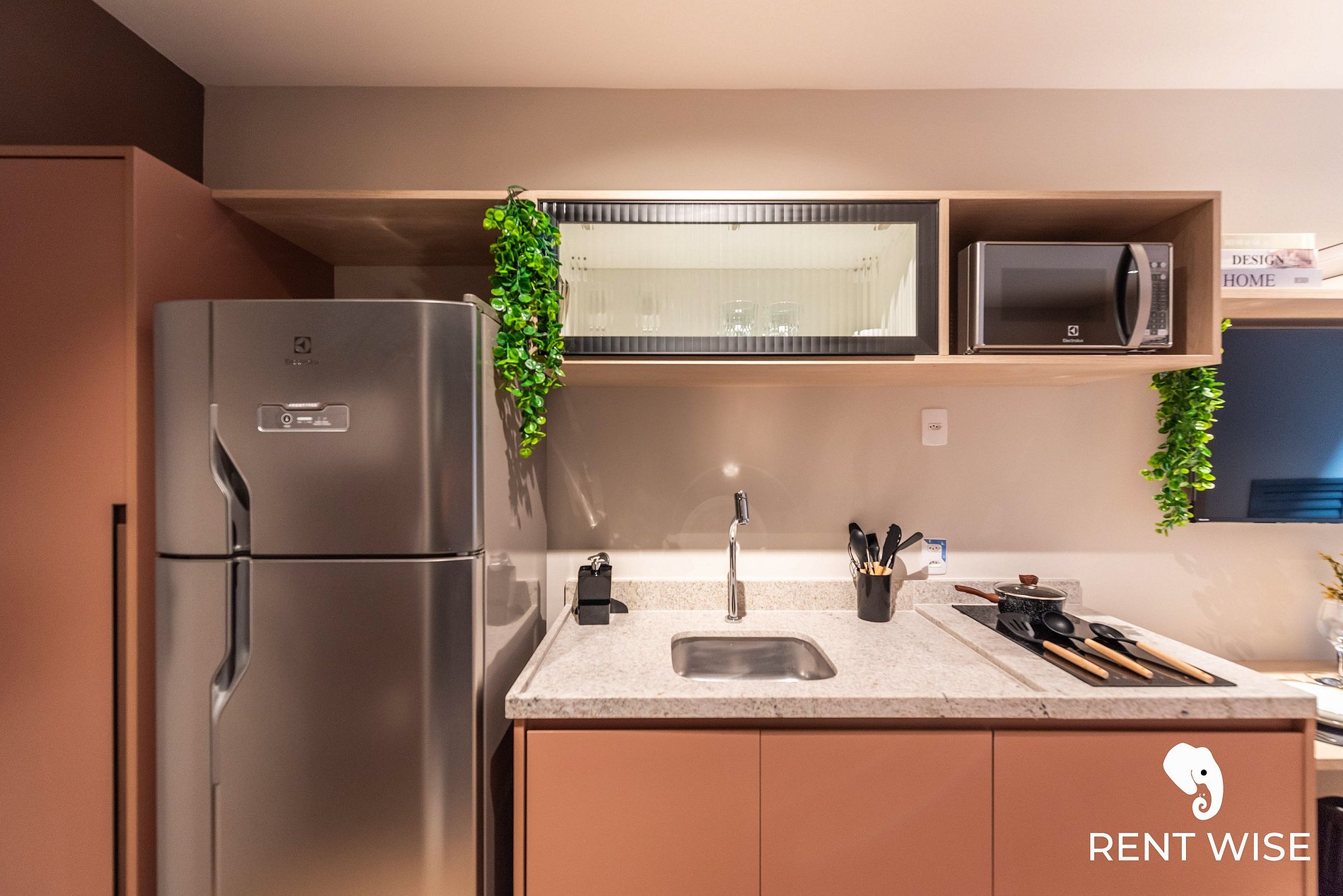 - Cozinha completa, equipada com geladeira, micro-ondas, fogão cooktop e todos os utensílios necessários para preparar suas refeições