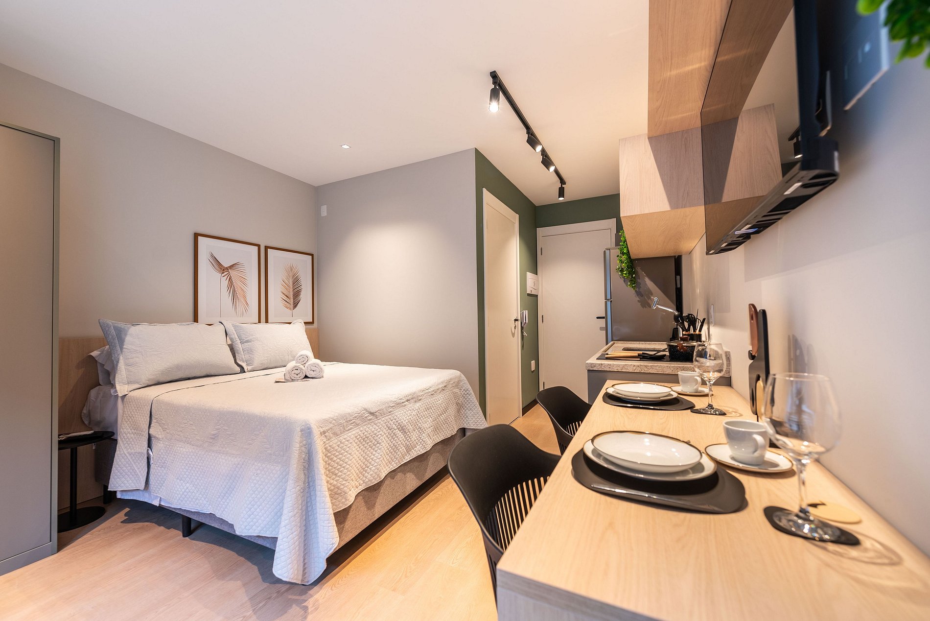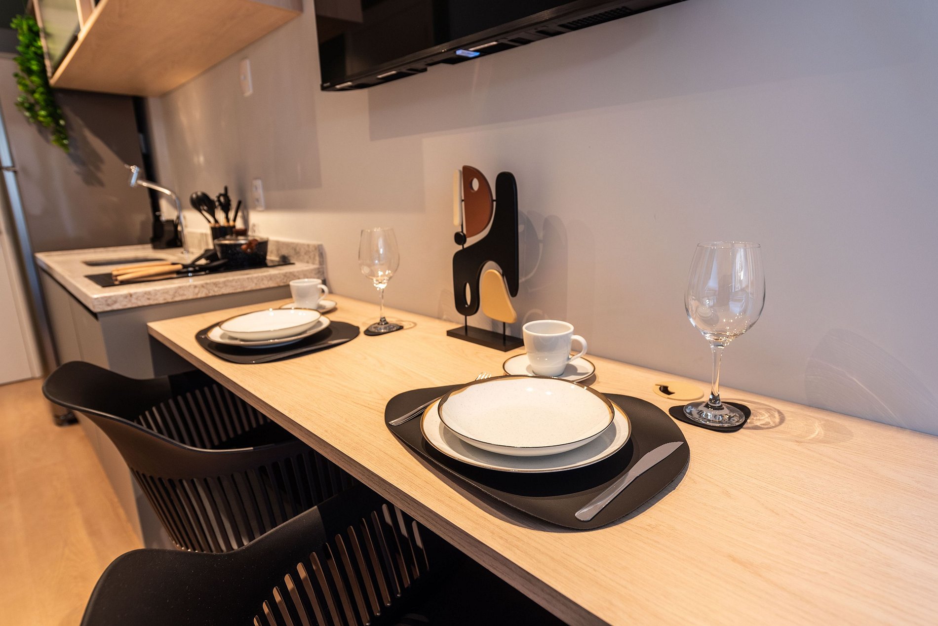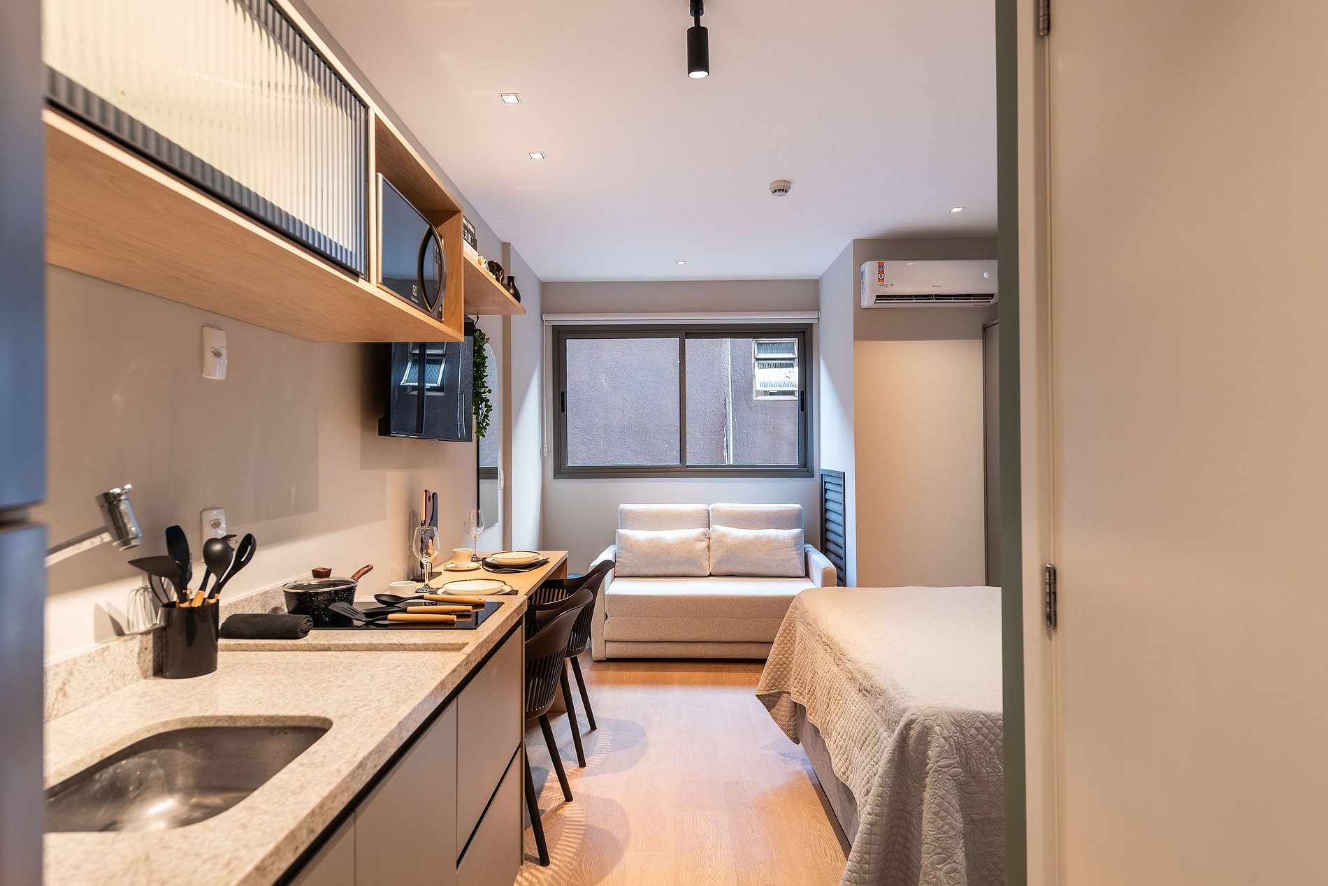 - Cozinha completa, equipada com geladeira, micro-ondas, fogão cooktop e todos os utensílios necessários para preparar suas refeições