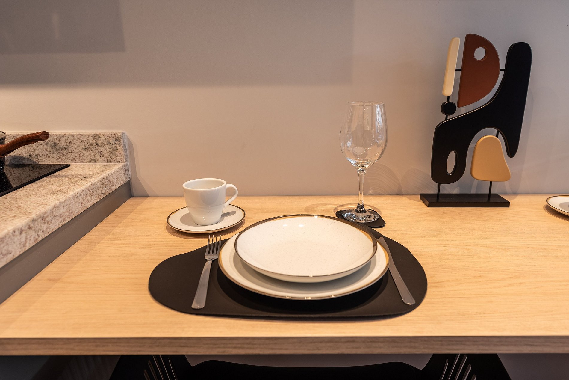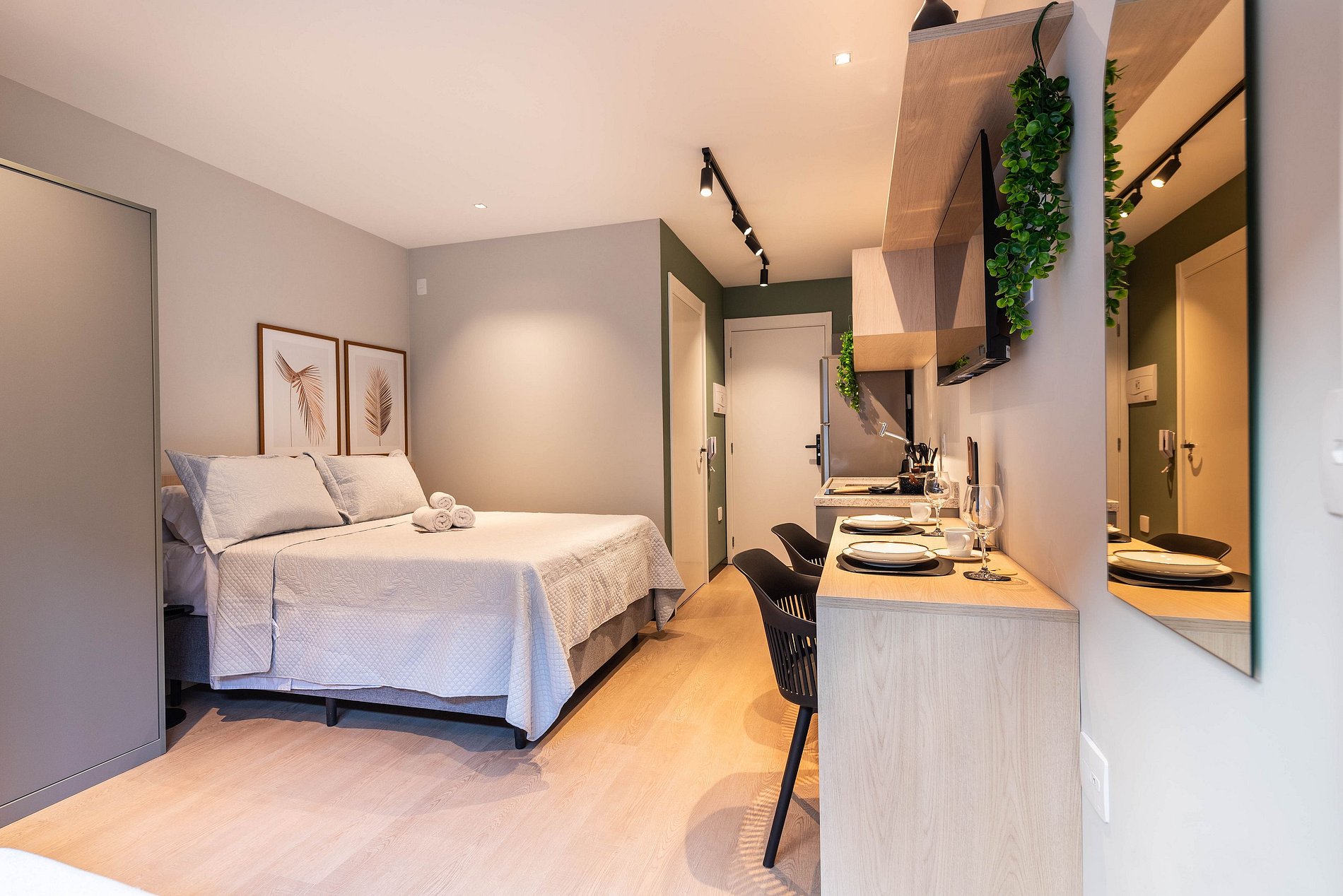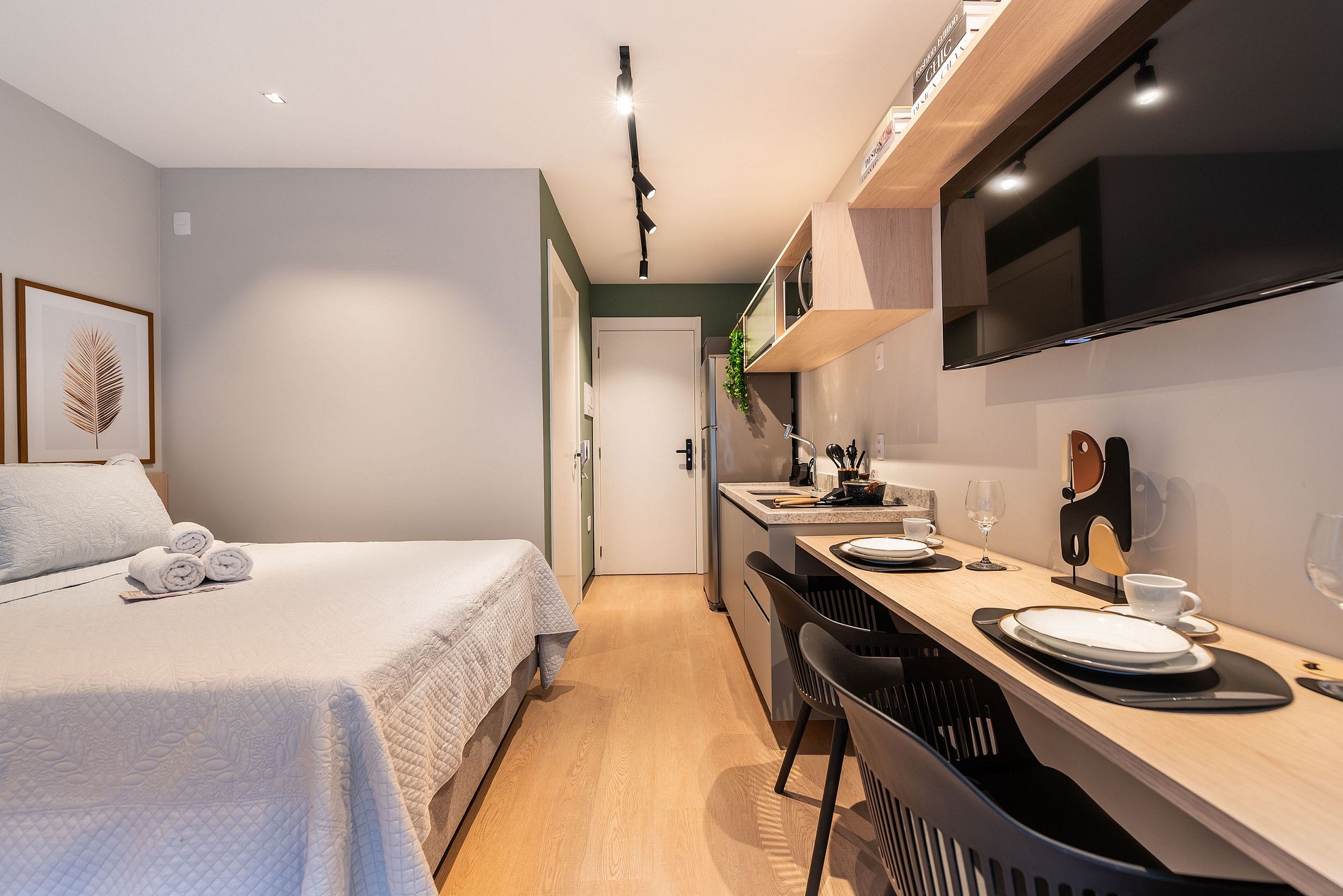 - Cozinha completa, equipada com geladeira, micro-ondas, fogão cooktop e todos os utensílios necessários para preparar suas refeições