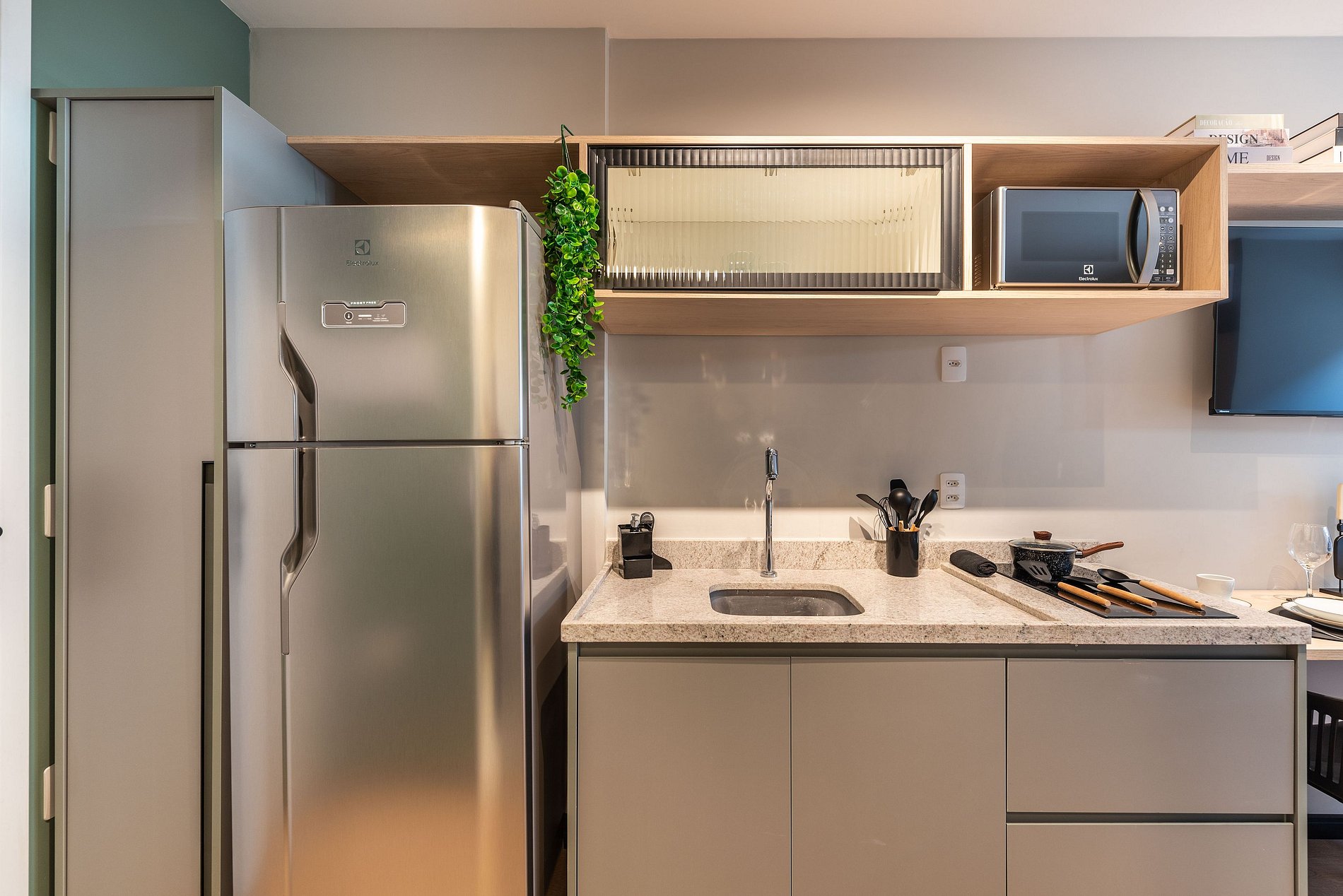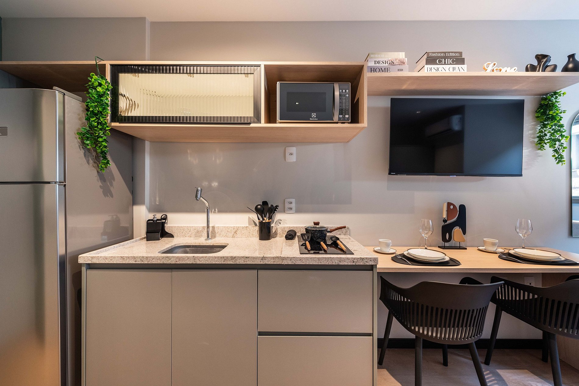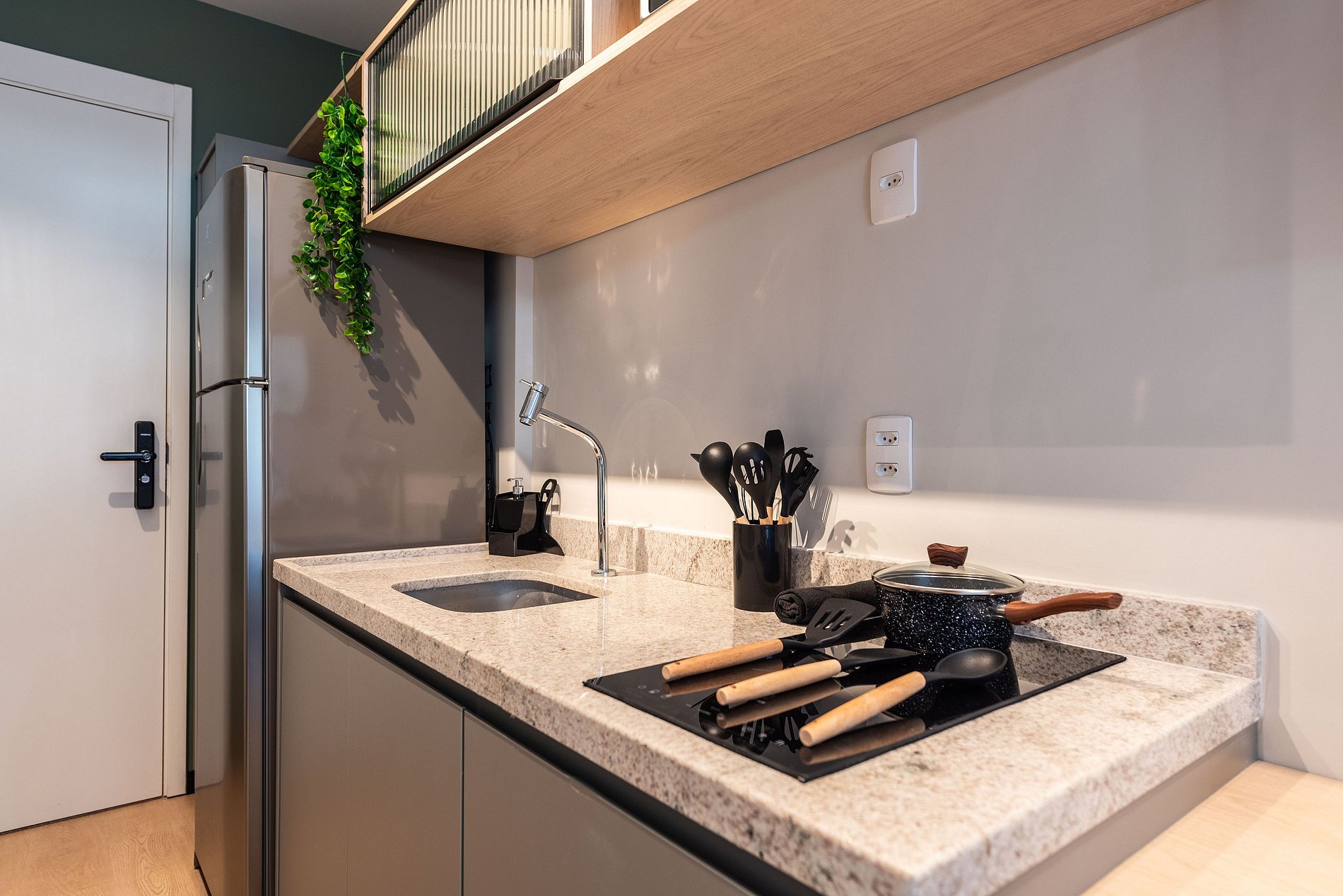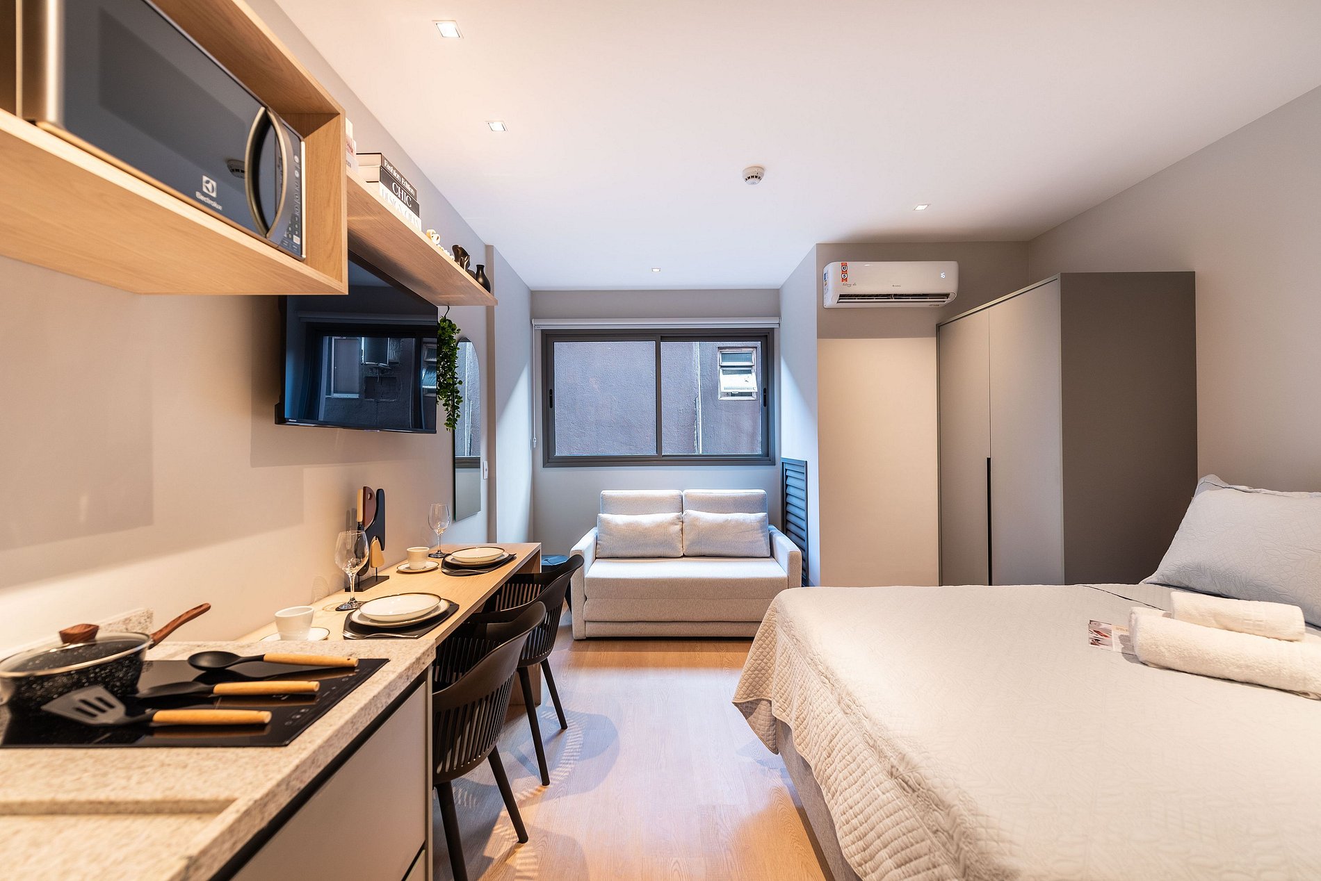 - Cozinha completa com fogão de indução 2 bocas, micro-ondas, liquidificador e cafeteira elétrica