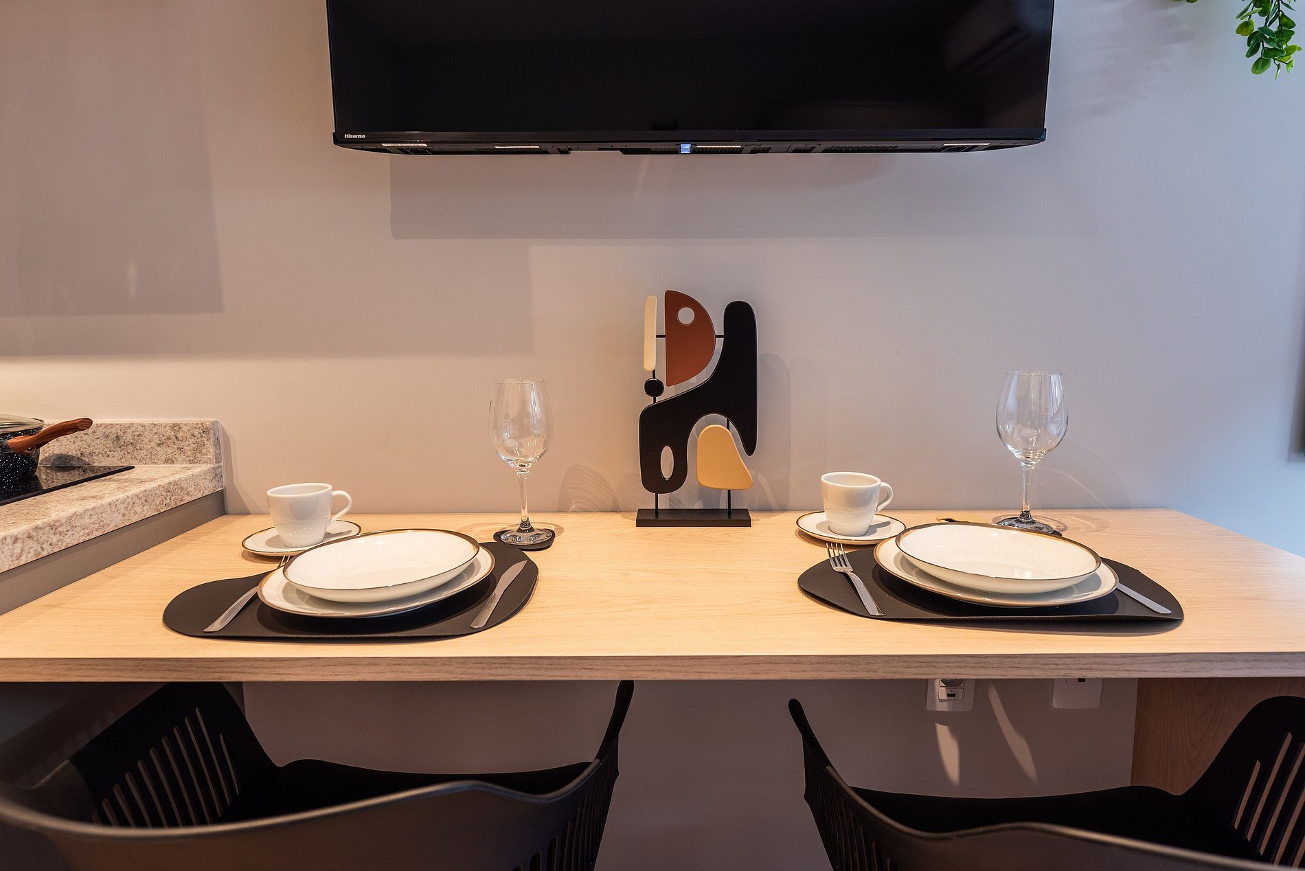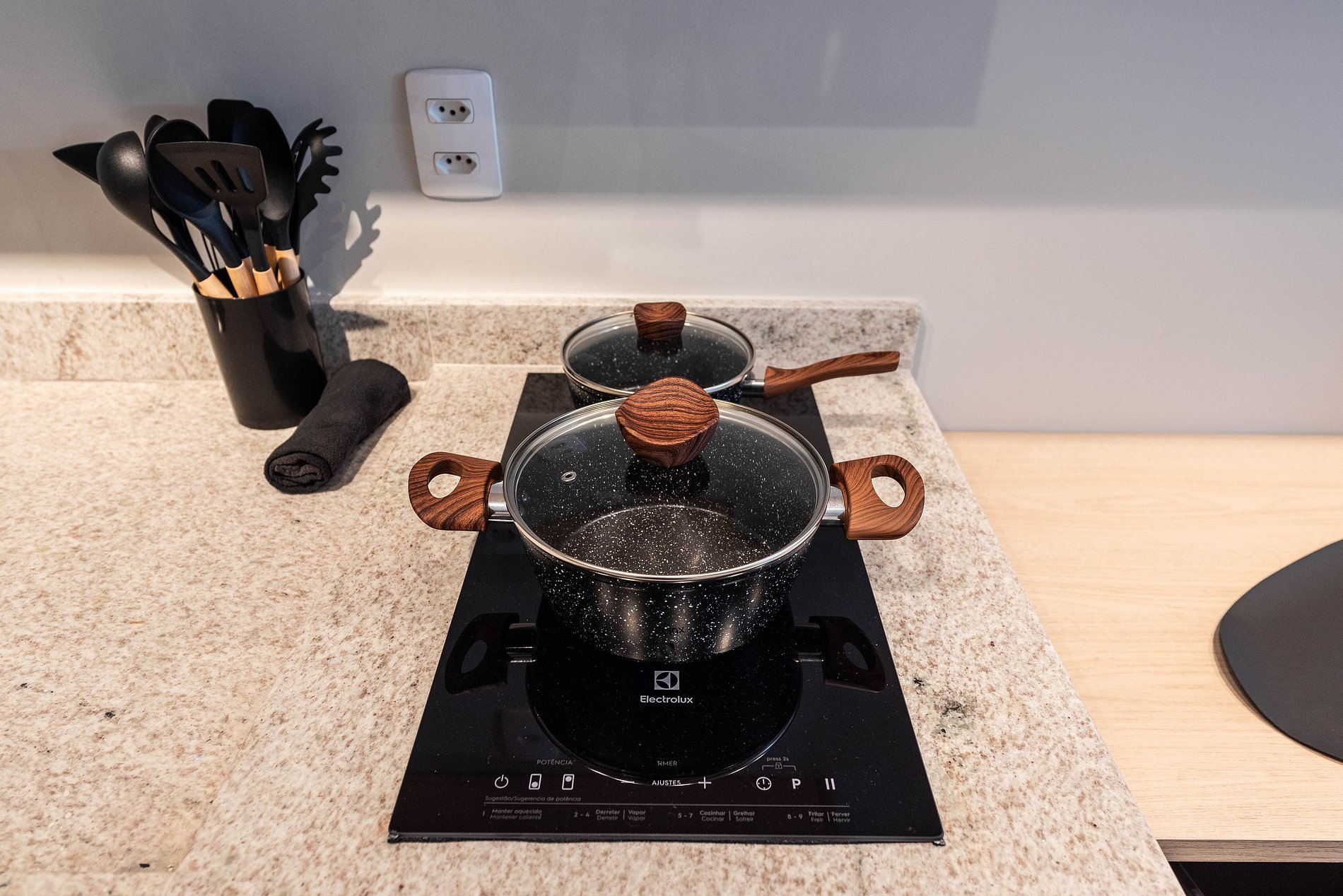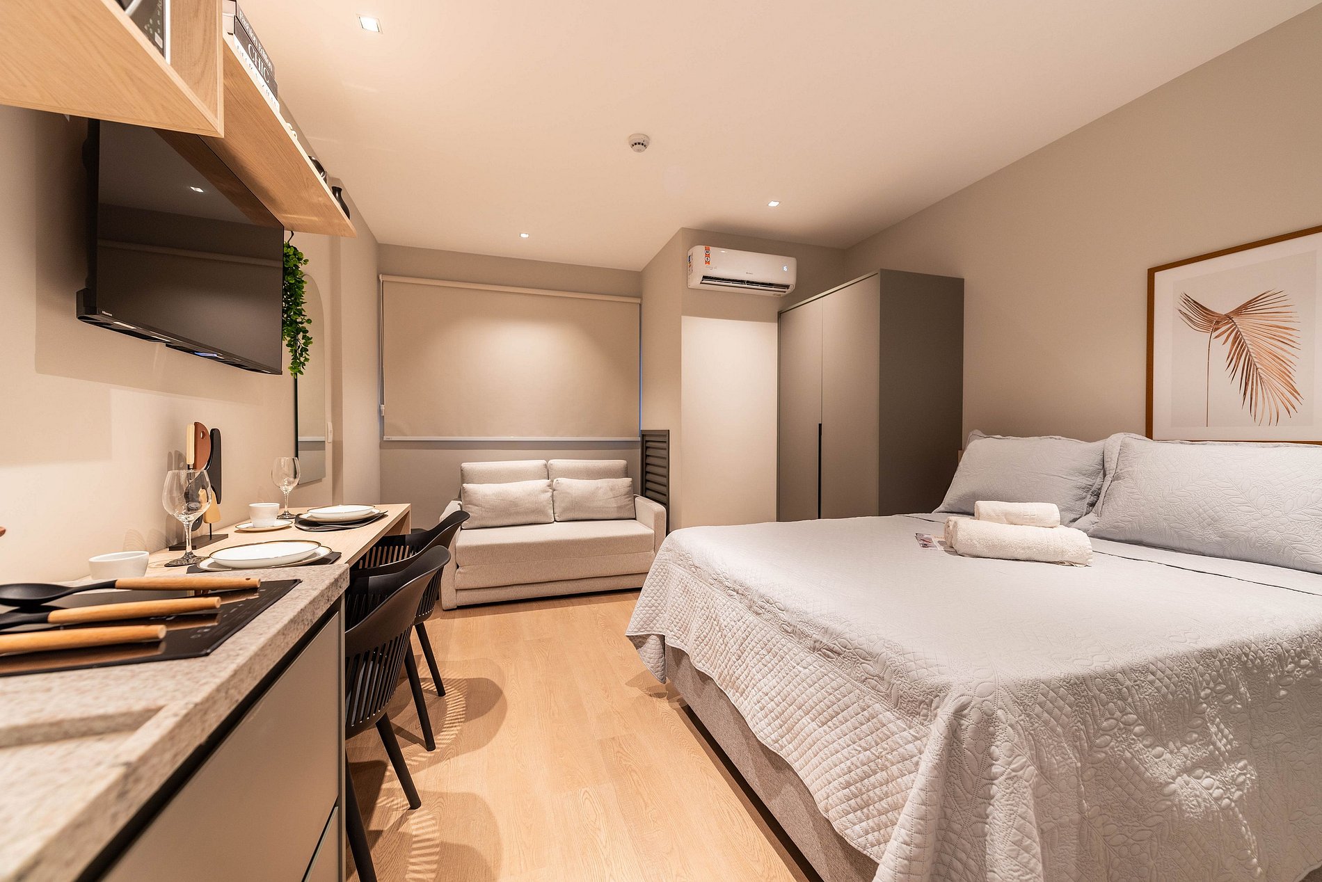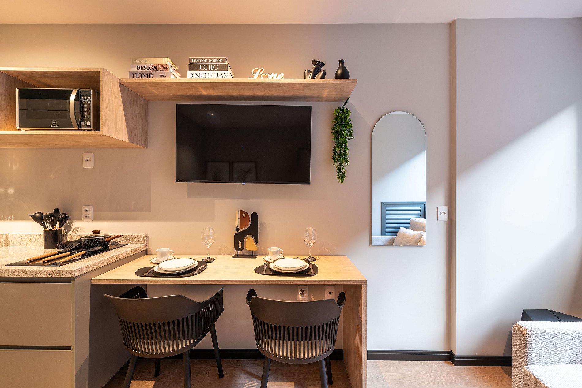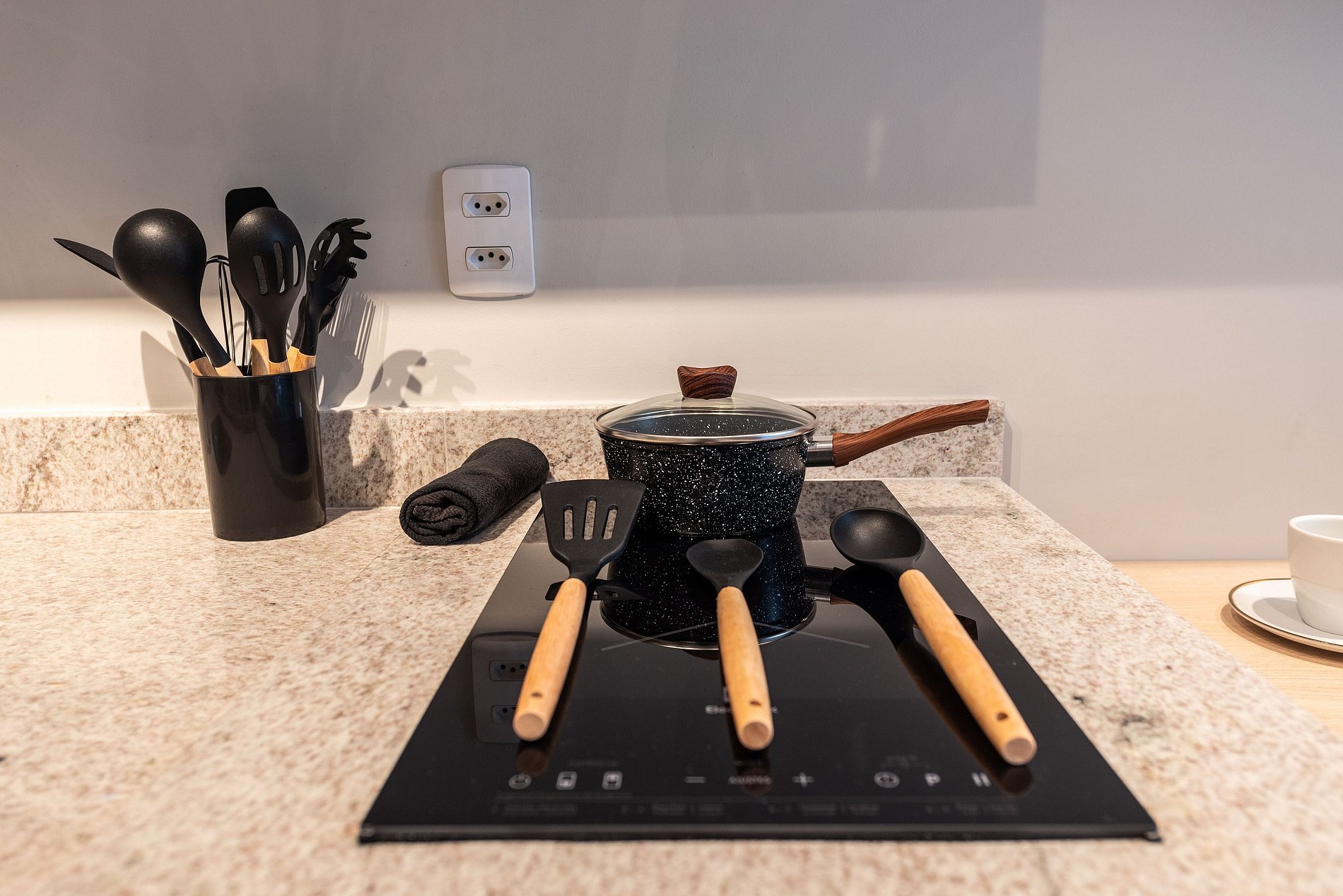 - Cozinha completa com fogão de indução 2 bocas, micro-ondas, liquidificador e cafeteira elétrica