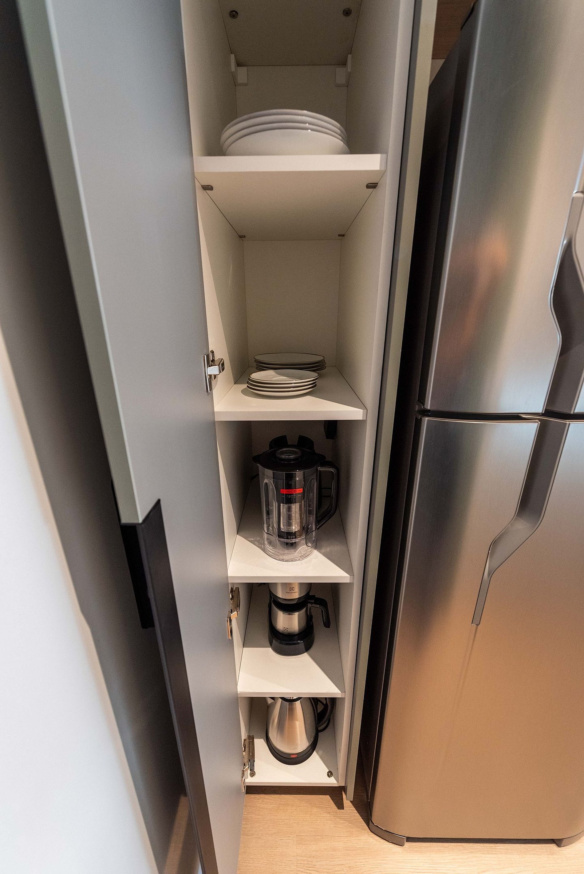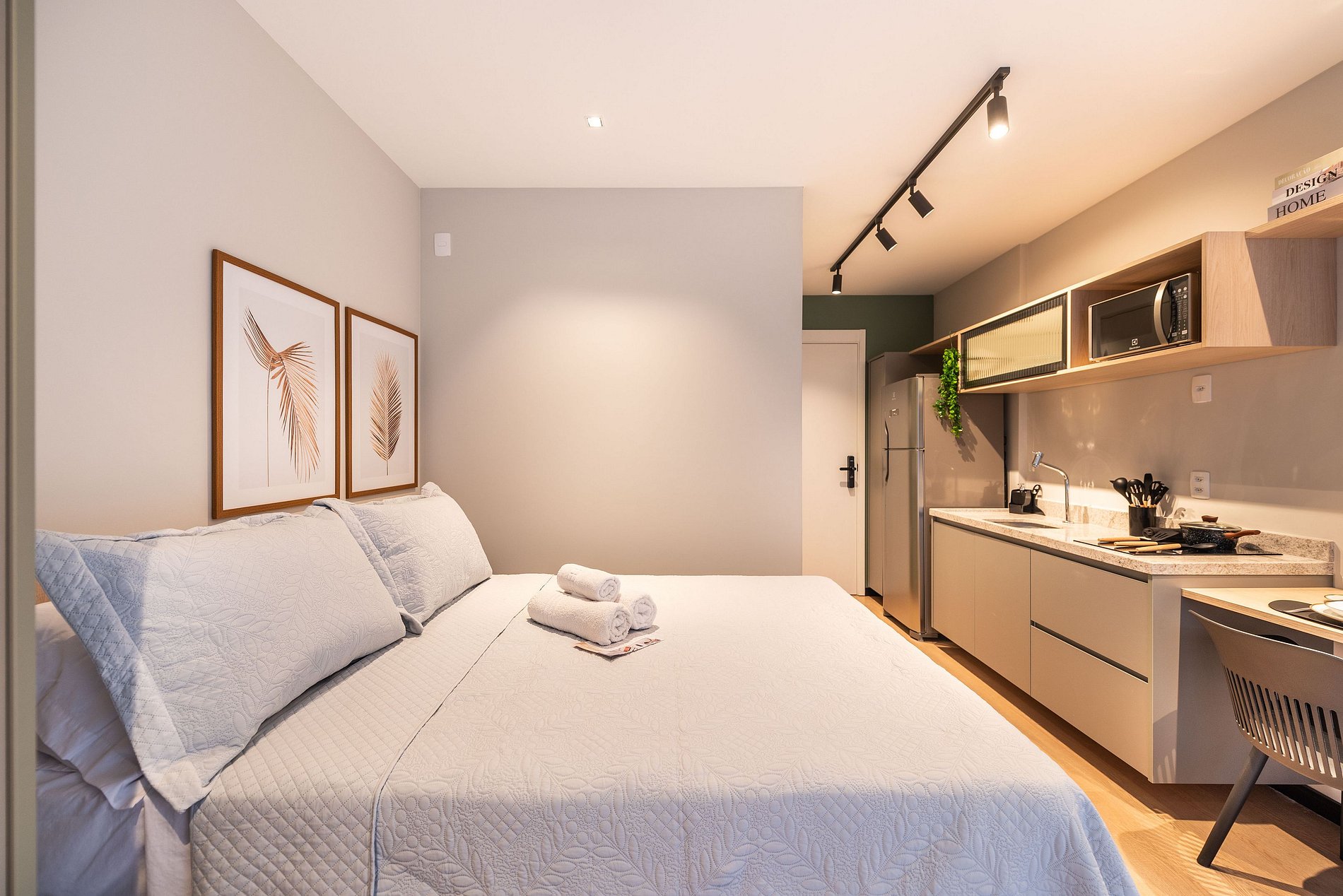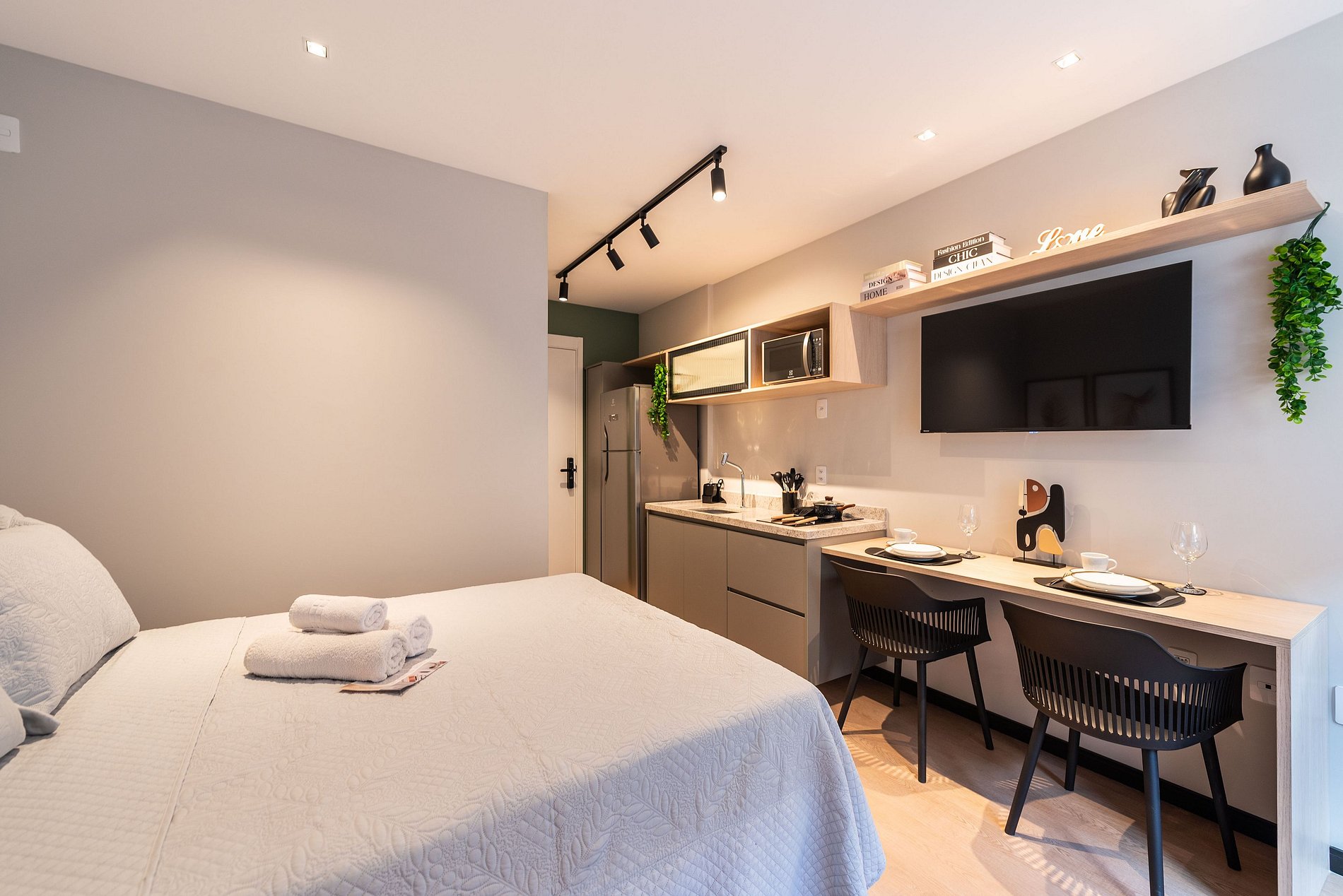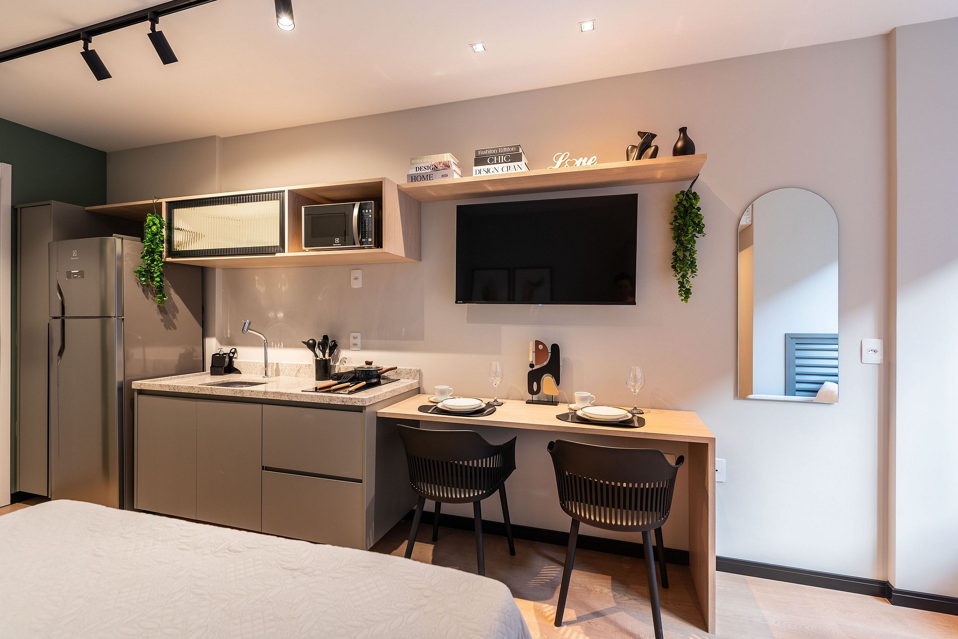 - Cozinha completa com fogão de indução 2 bocas, micro-ondas, liquidificador e cafeteira elétrica