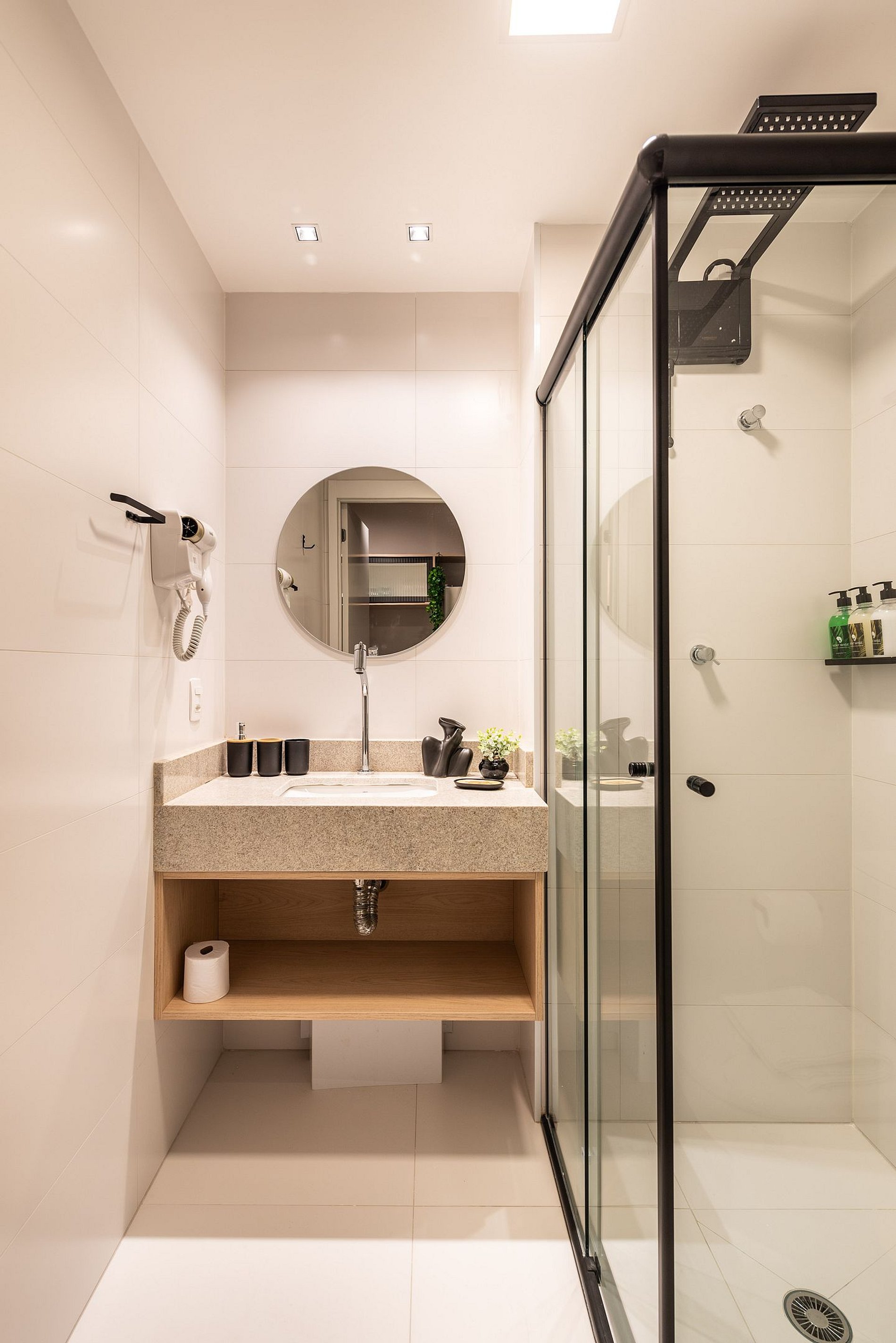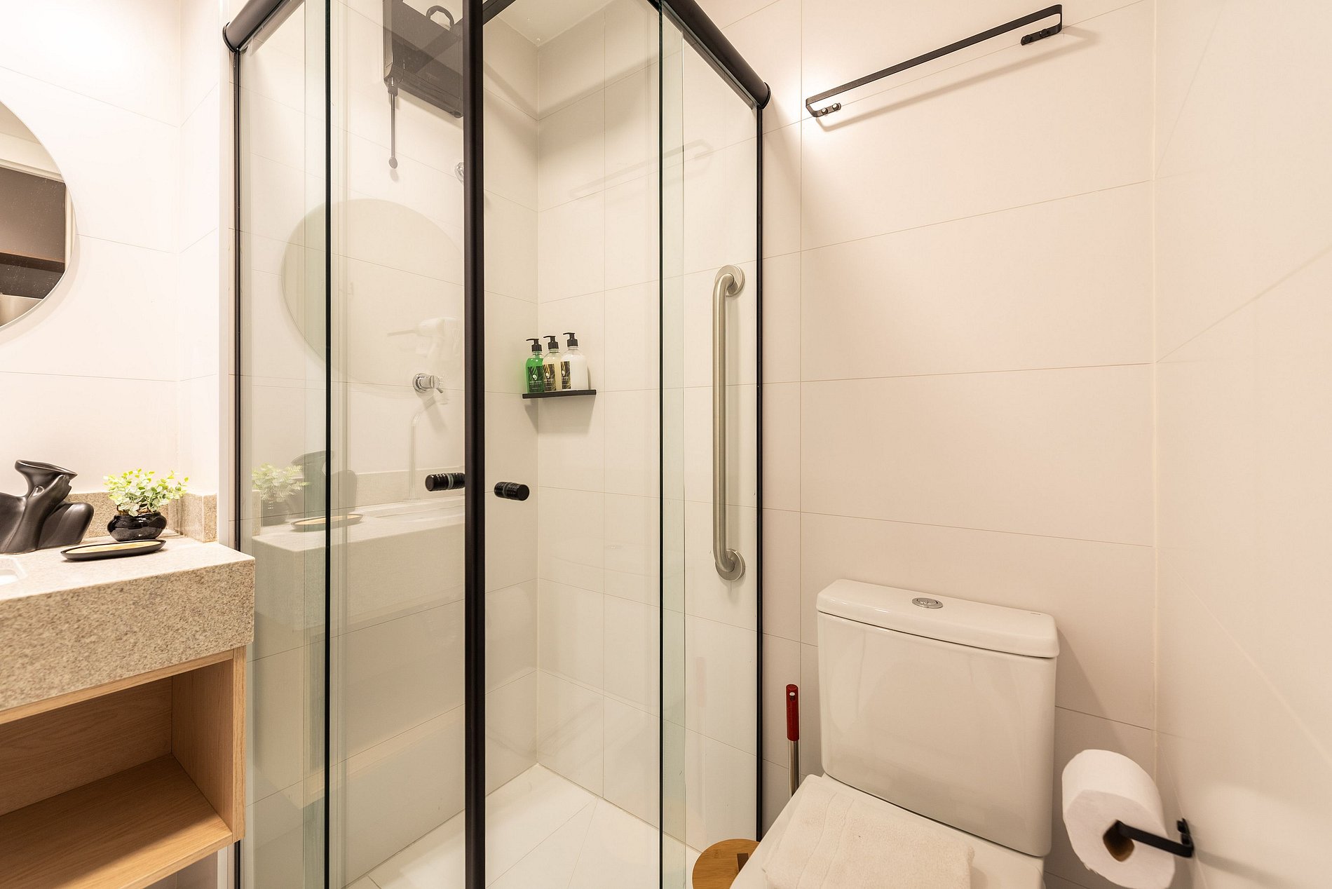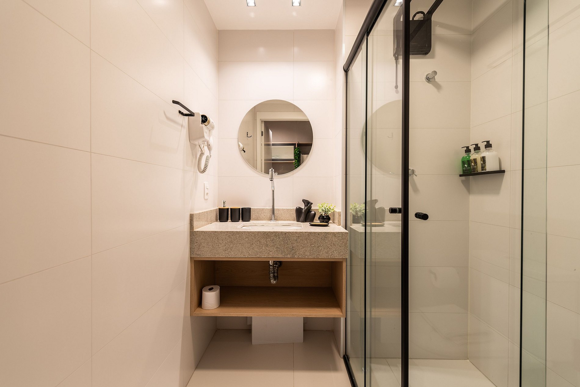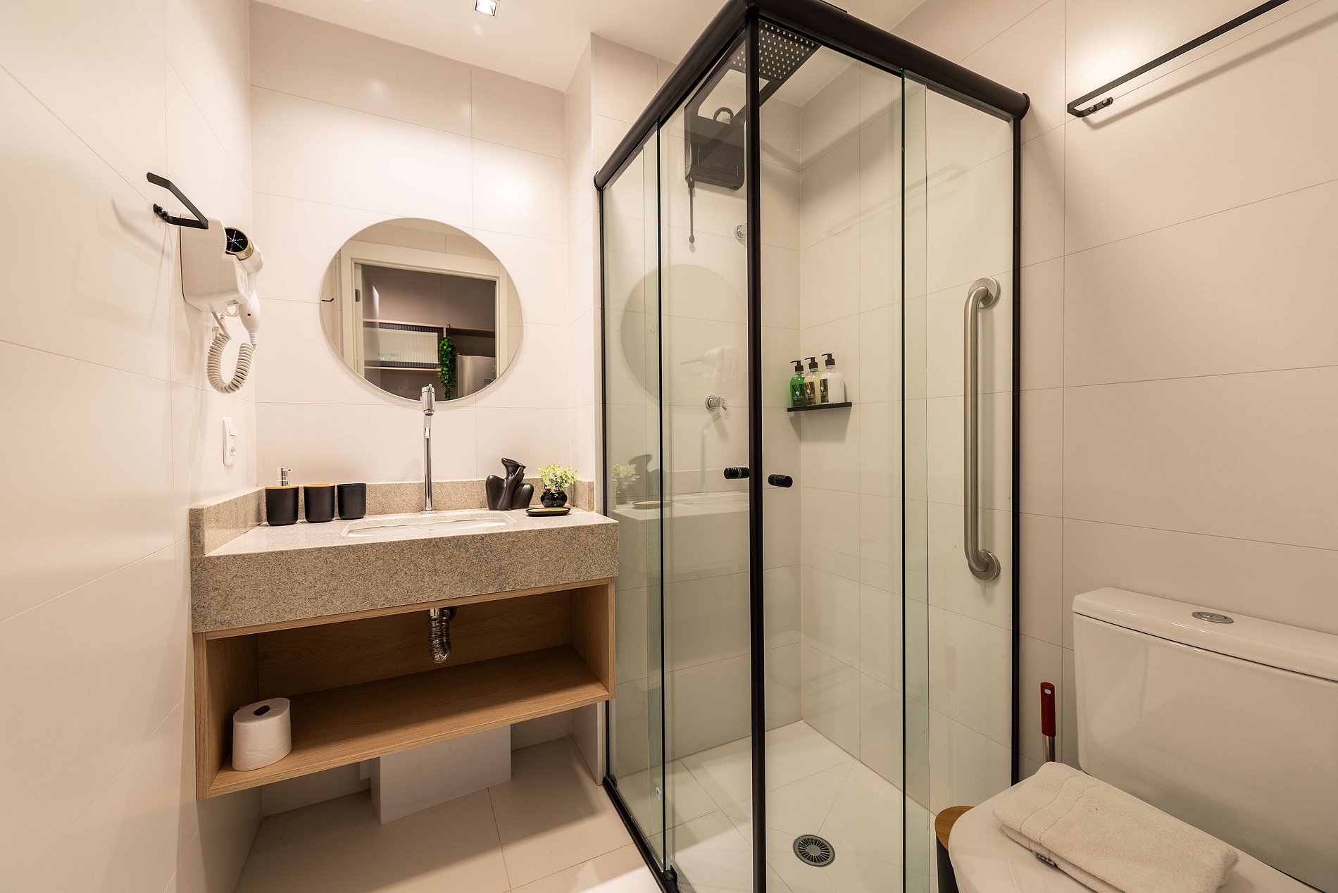 - Itens básicos de banheiro como secador de cabelo, shampoo, condicionador e sabonete para sua comodidade