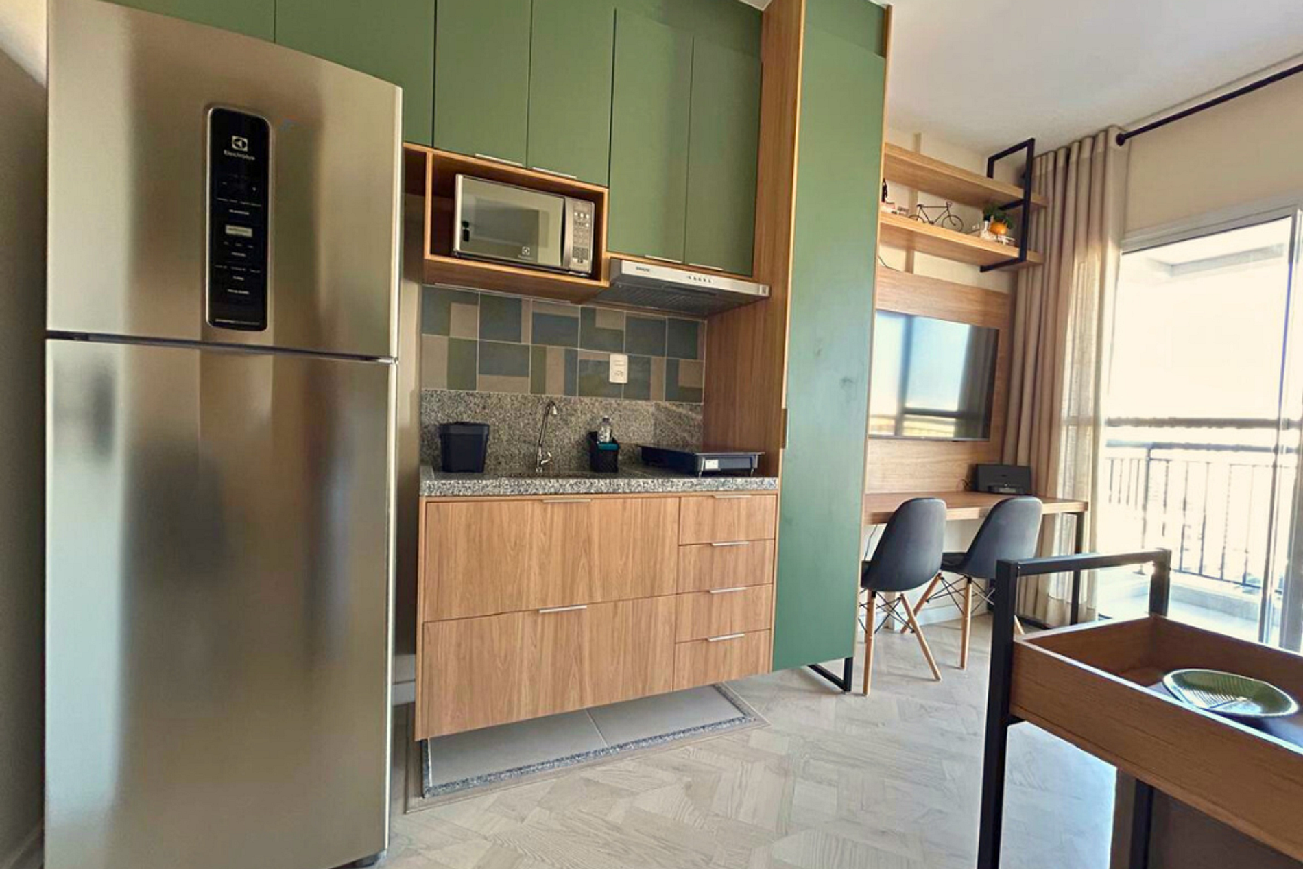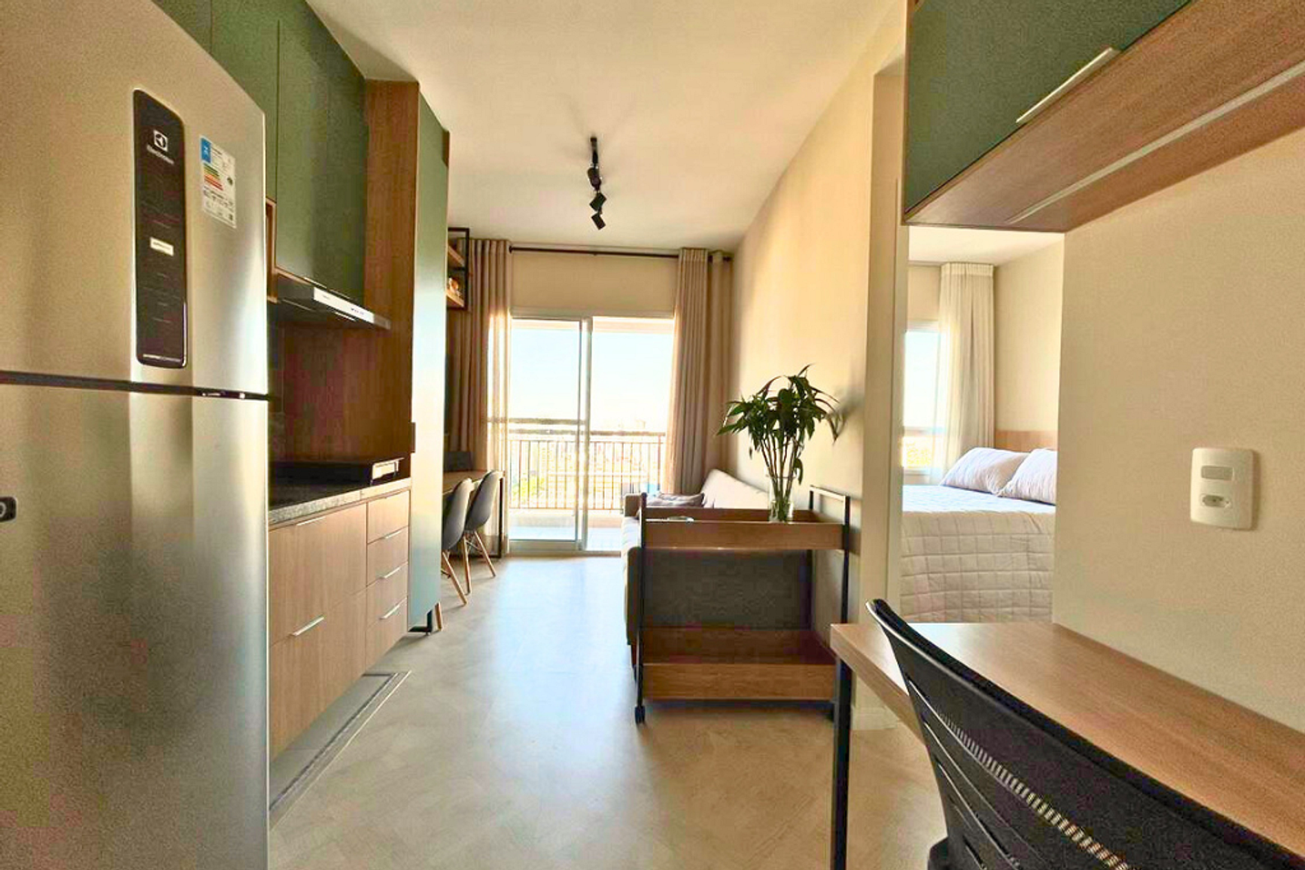 * Cozinha completa, equipada com geladeira, micro-ondas, fogão cooktop 4 bocas, forno, airfryer e todos os utensílios necessários para preparar suas refeições