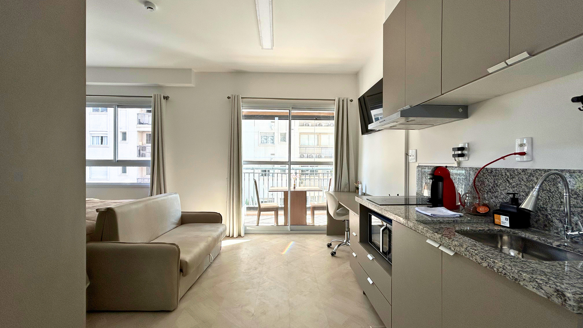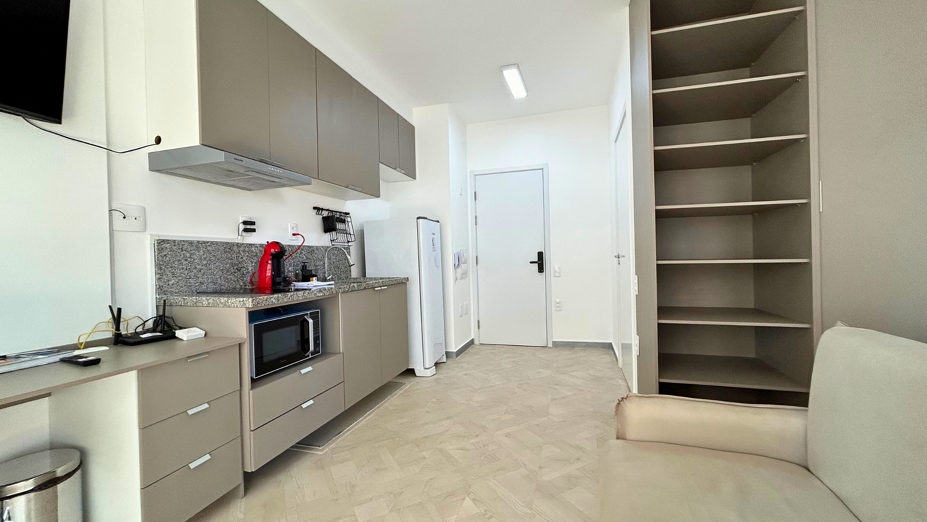 * Cozinha completa com geladeira, micro-ondas, chaleira elétrica e cooktop