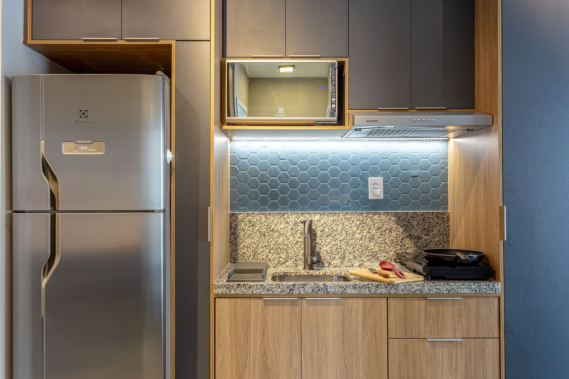 * Cozinha completa, equipada com geladeira, micro-ondas, fogão cooktop 2 bocas e todos os utensílios necessários para preparar suas refeições