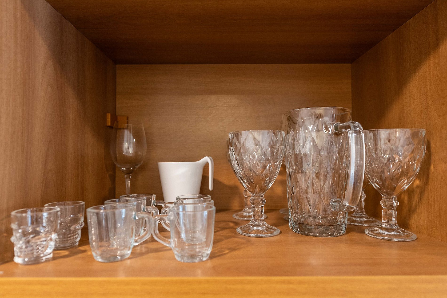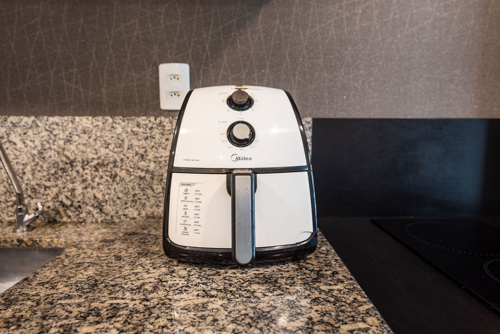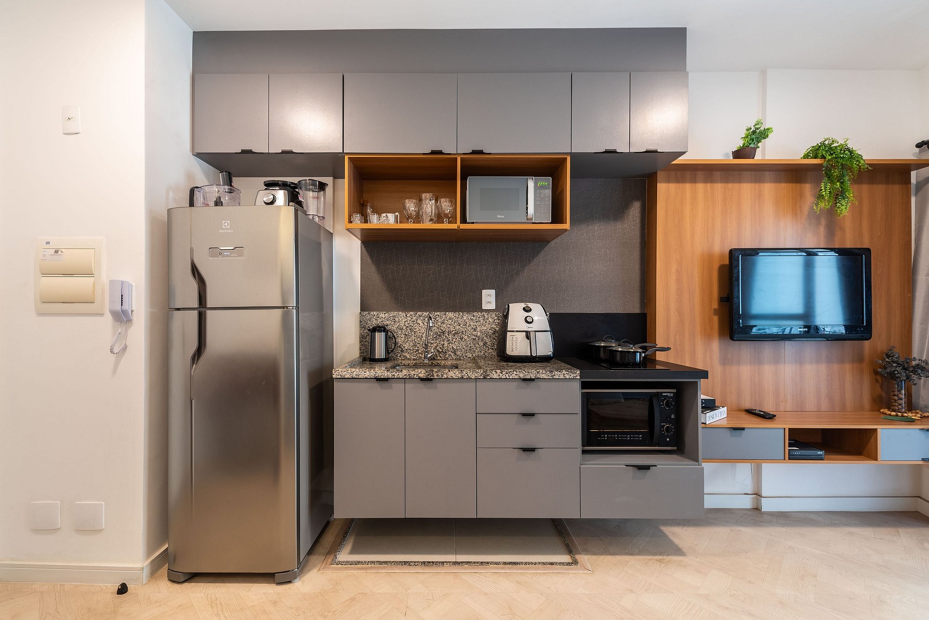 * Cozinha completa com geladeira, micro-ondas, cooktop, airfryer e utensílios essenciais