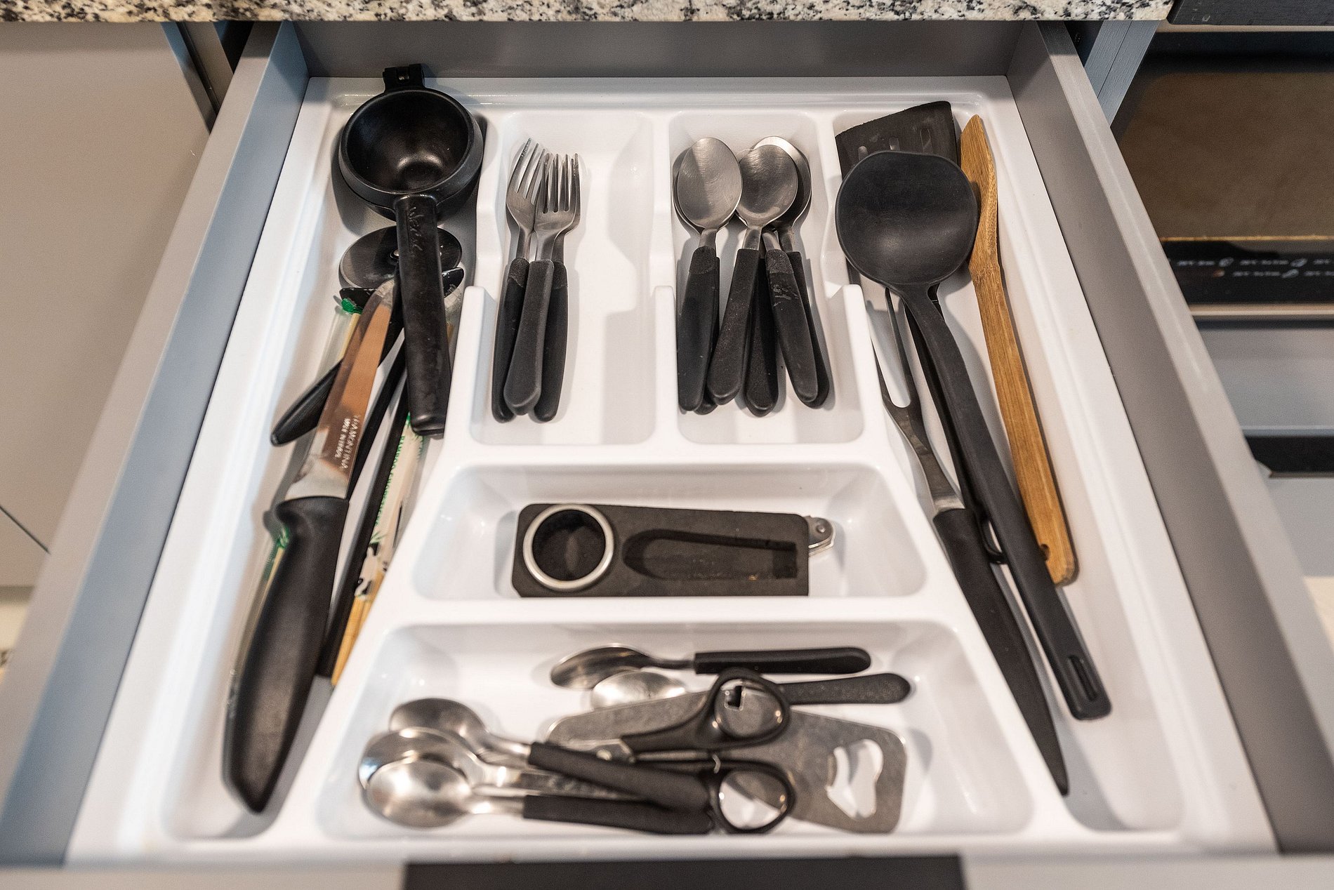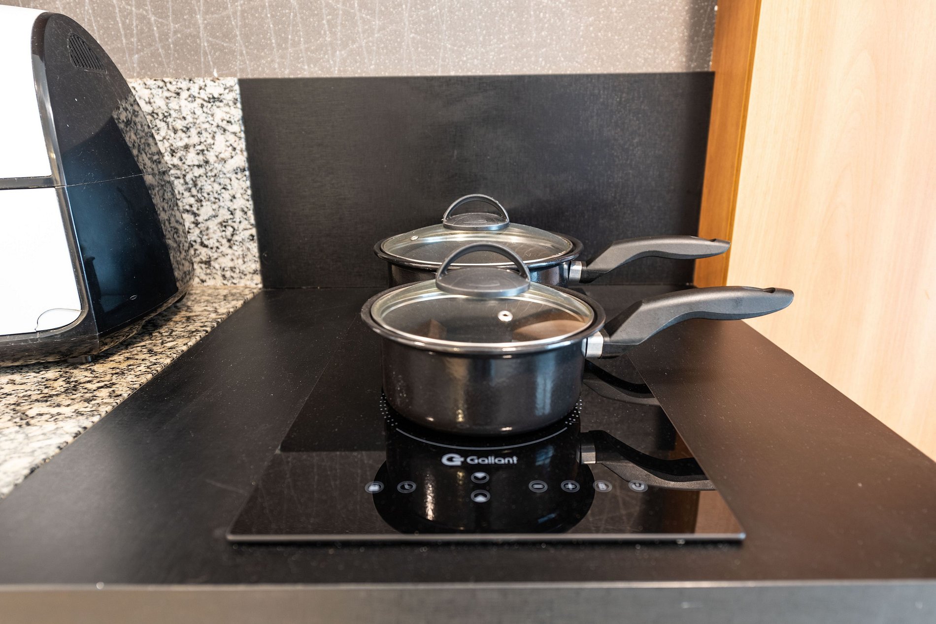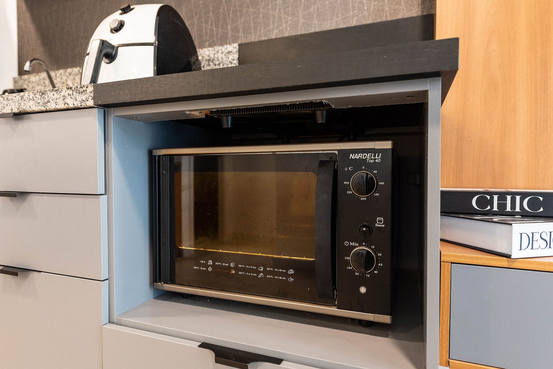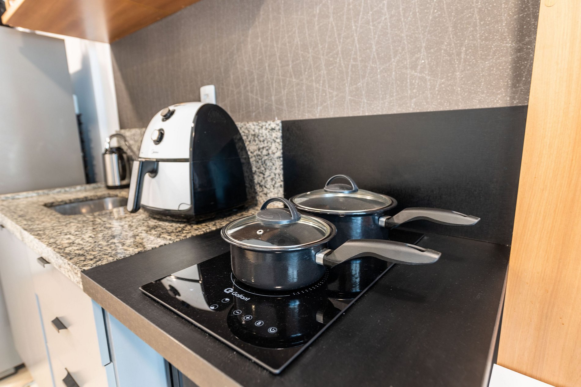 * Cozinha completa, equipada com geladeira, micro-ondas, fogão cooktop, airfyer e todos os utensílios necessários para preparar suas refeições