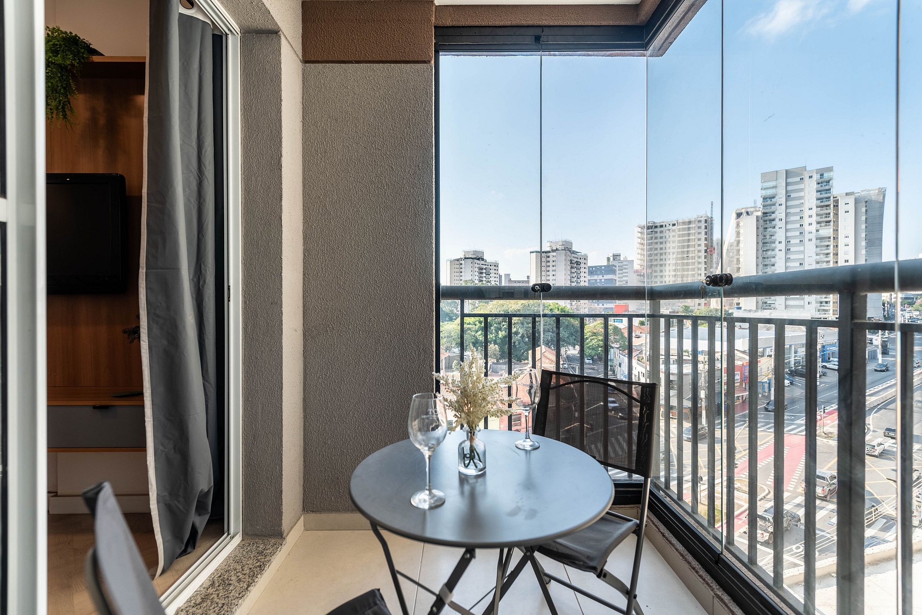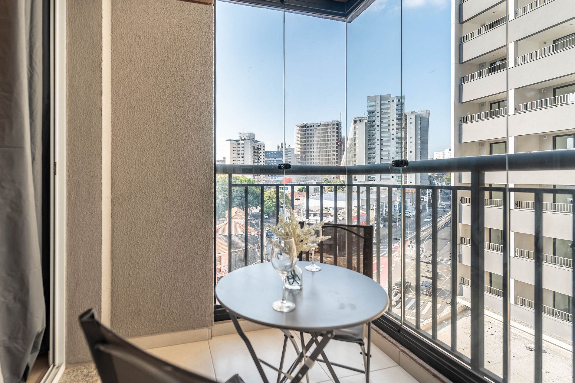 * Varanda aconchegante com vista para a cidade, ideal para relaxar após um dia cheio