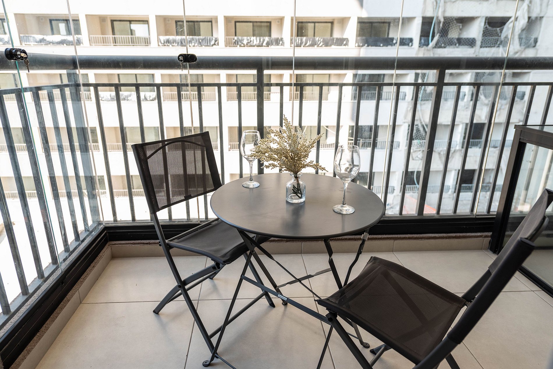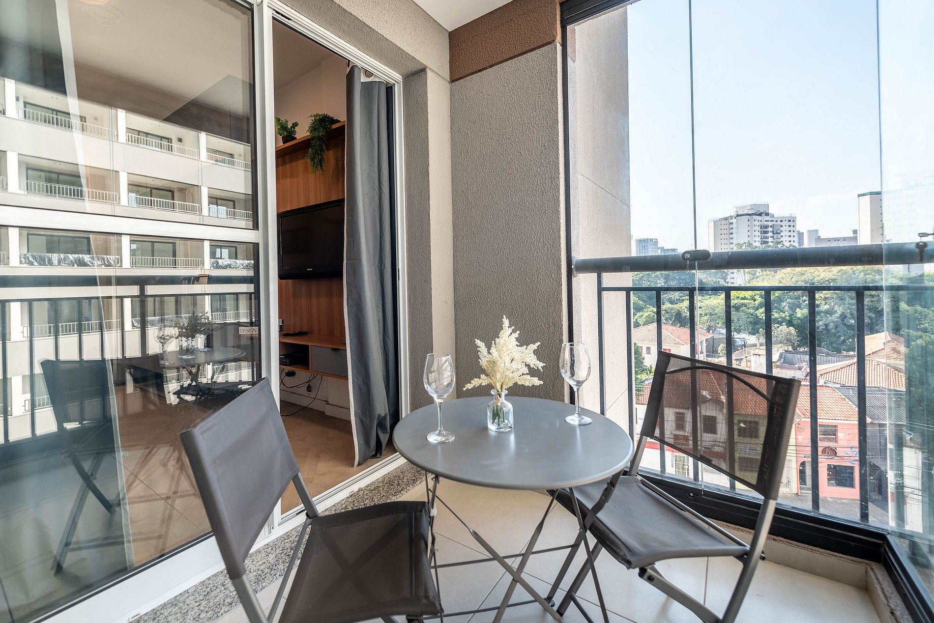 * Uma varanda aconchegante com vista para a cidade, perfeita para relaxar após um dia de passeios ou trabalho