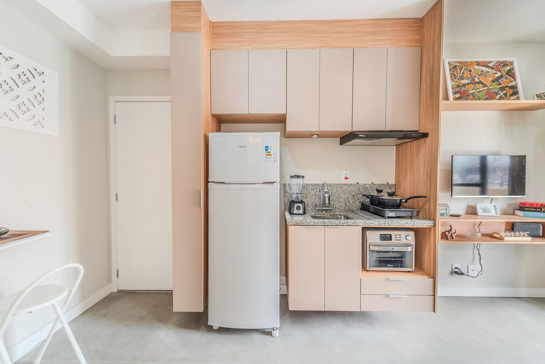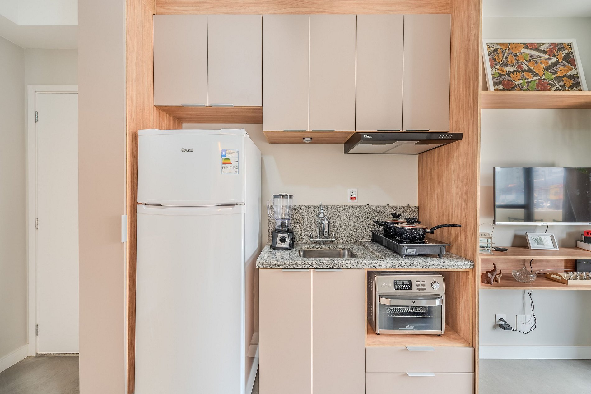 * Cozinha completa com geladeira, micro-ondas, cooktop, airfryer e utensílios essenciais