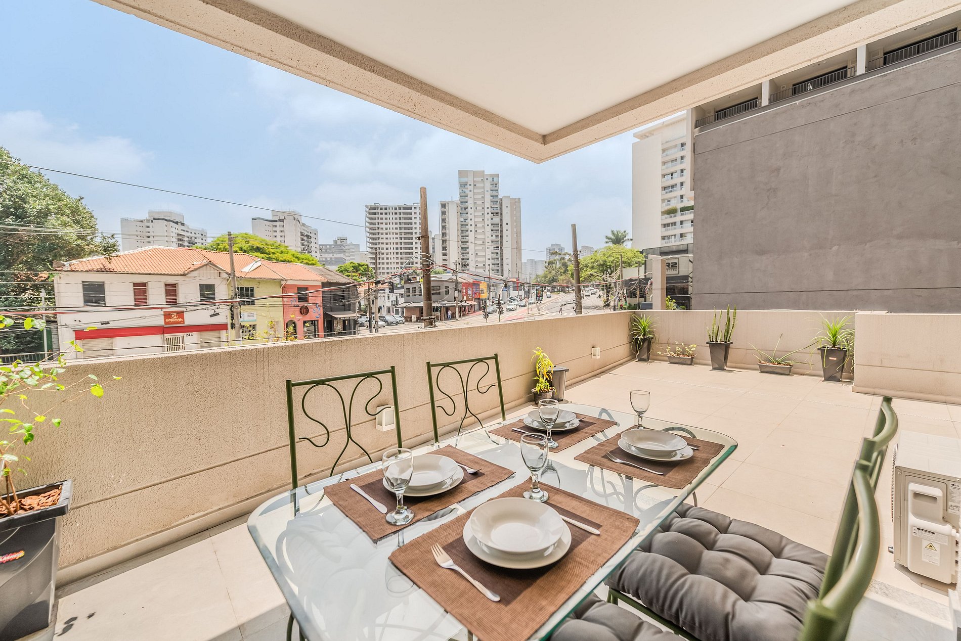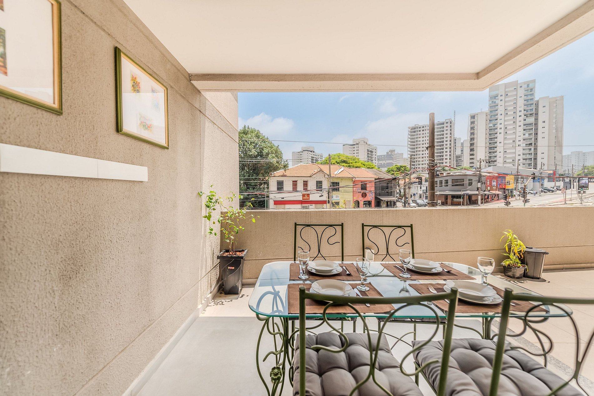 * Uma varanda aconchegante com vista para a cidade, perfeita para relaxar após um dia de passeios ou trabalho