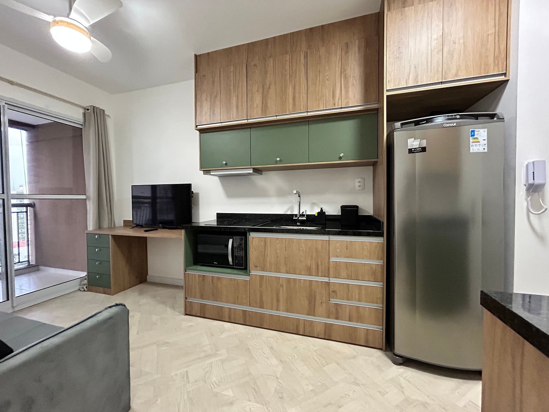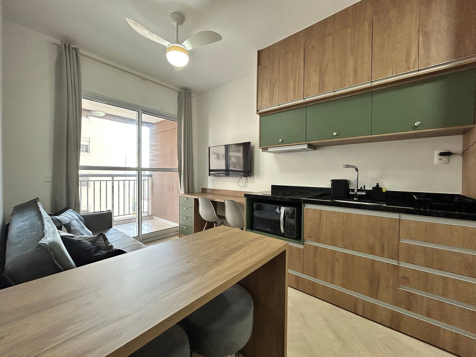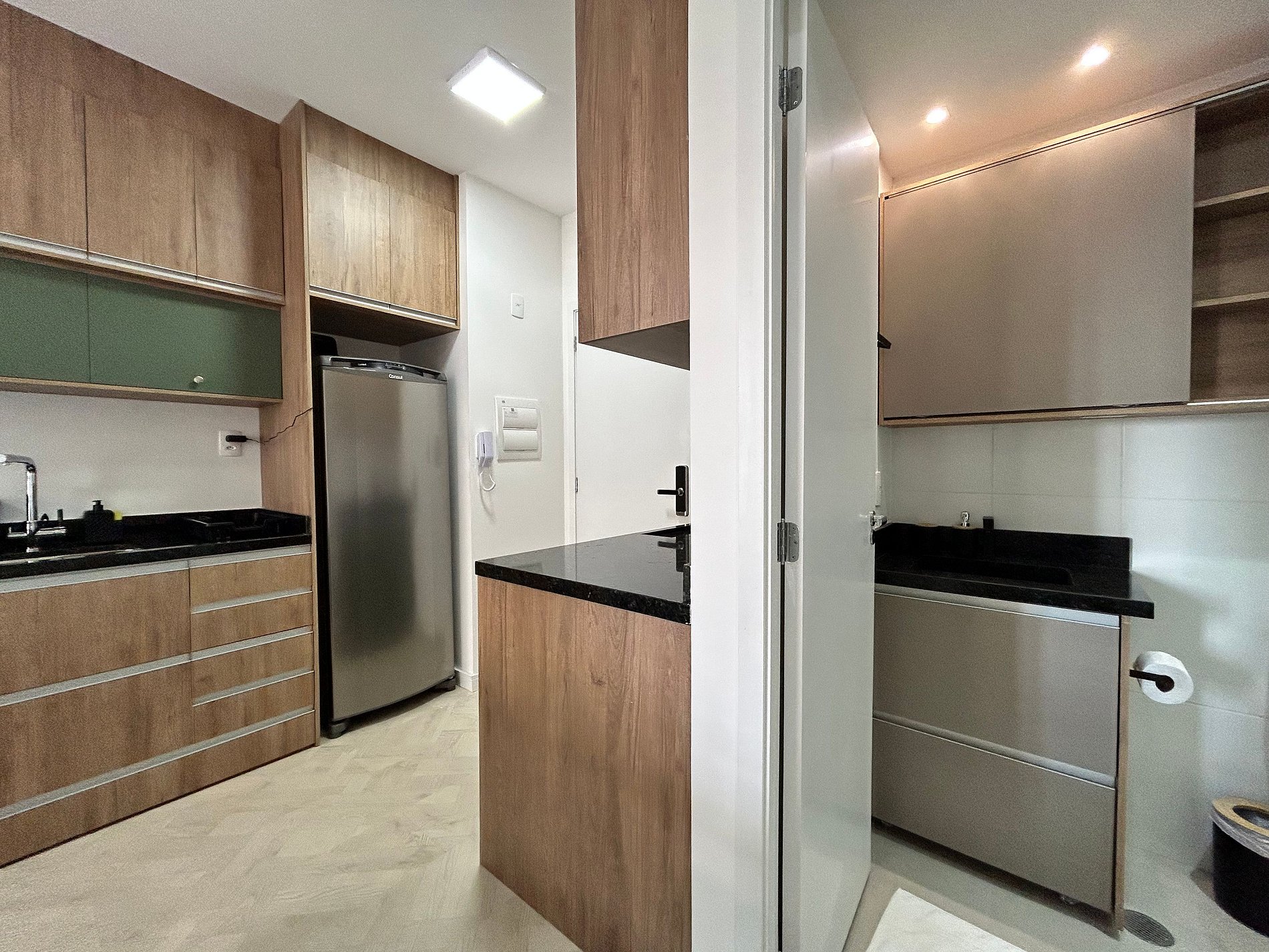 * Cozinha completa, equipada com geladeira, micro-ondas, fogão cooktop e todos os utensílios necessários para preparar suas refeições