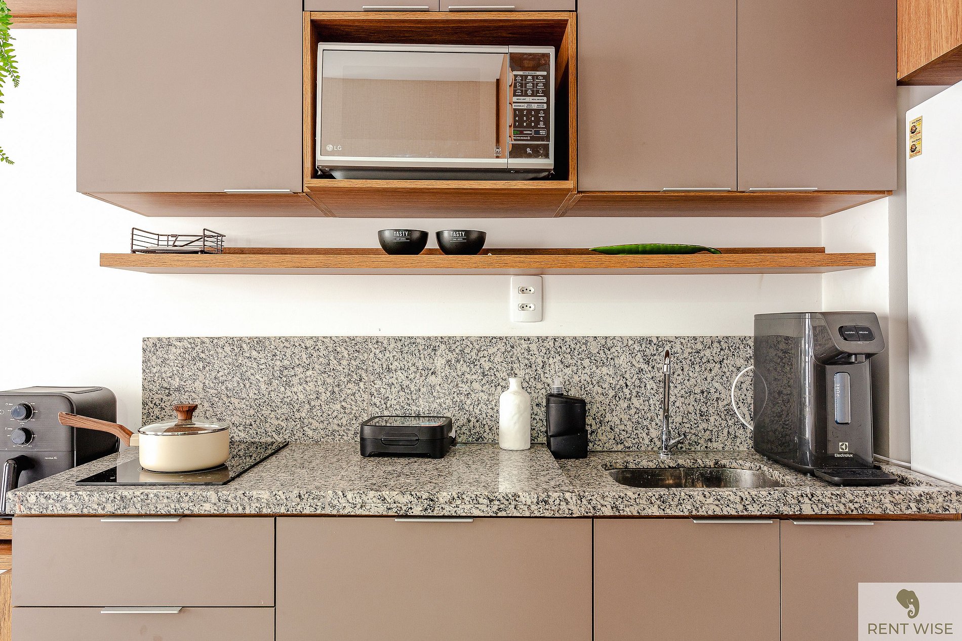 * Cozinha completa, equipada com geladeira, micro-ondas, fogão cooktop, airfyer e todos os utensílios necessários para preparar suas refeições
