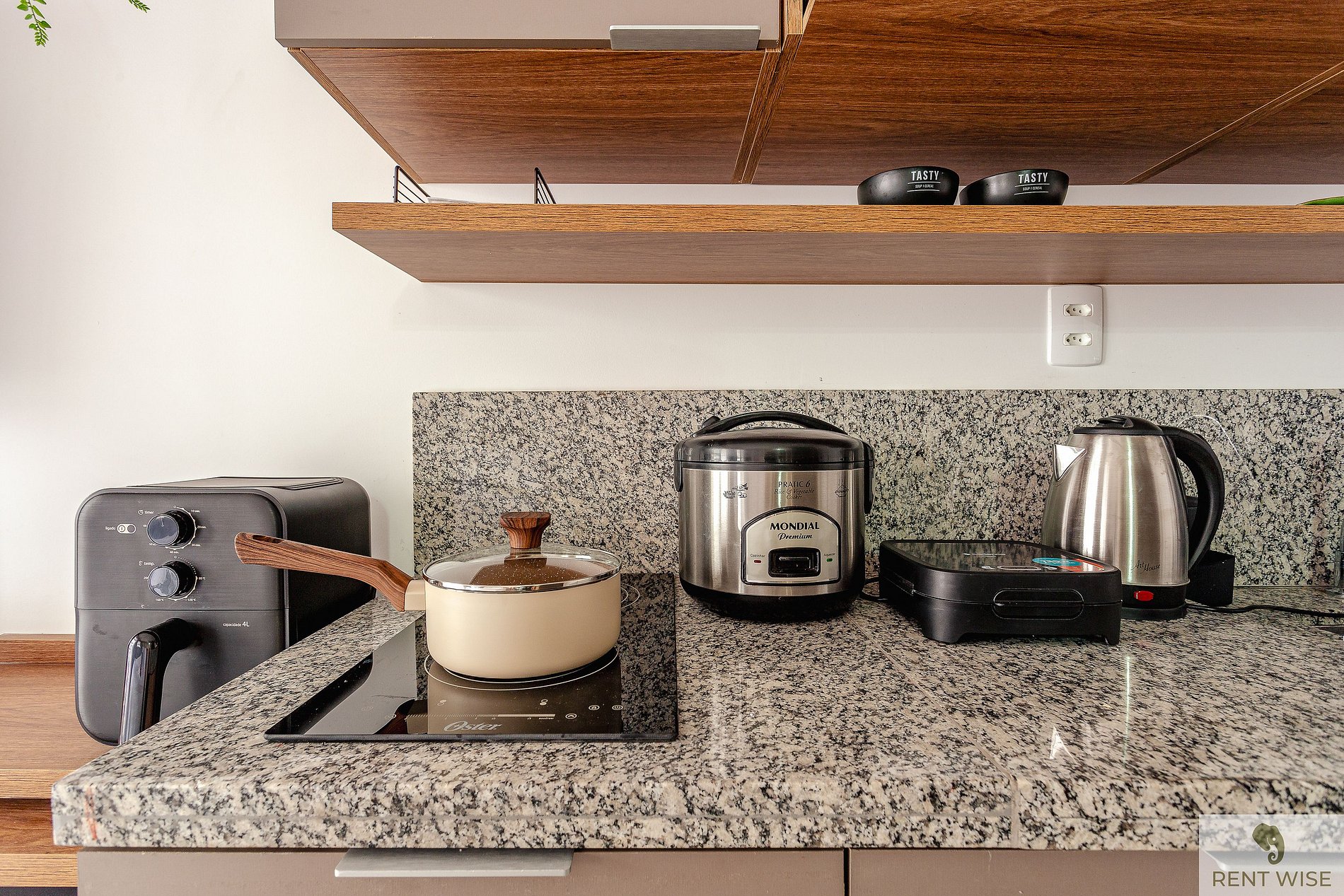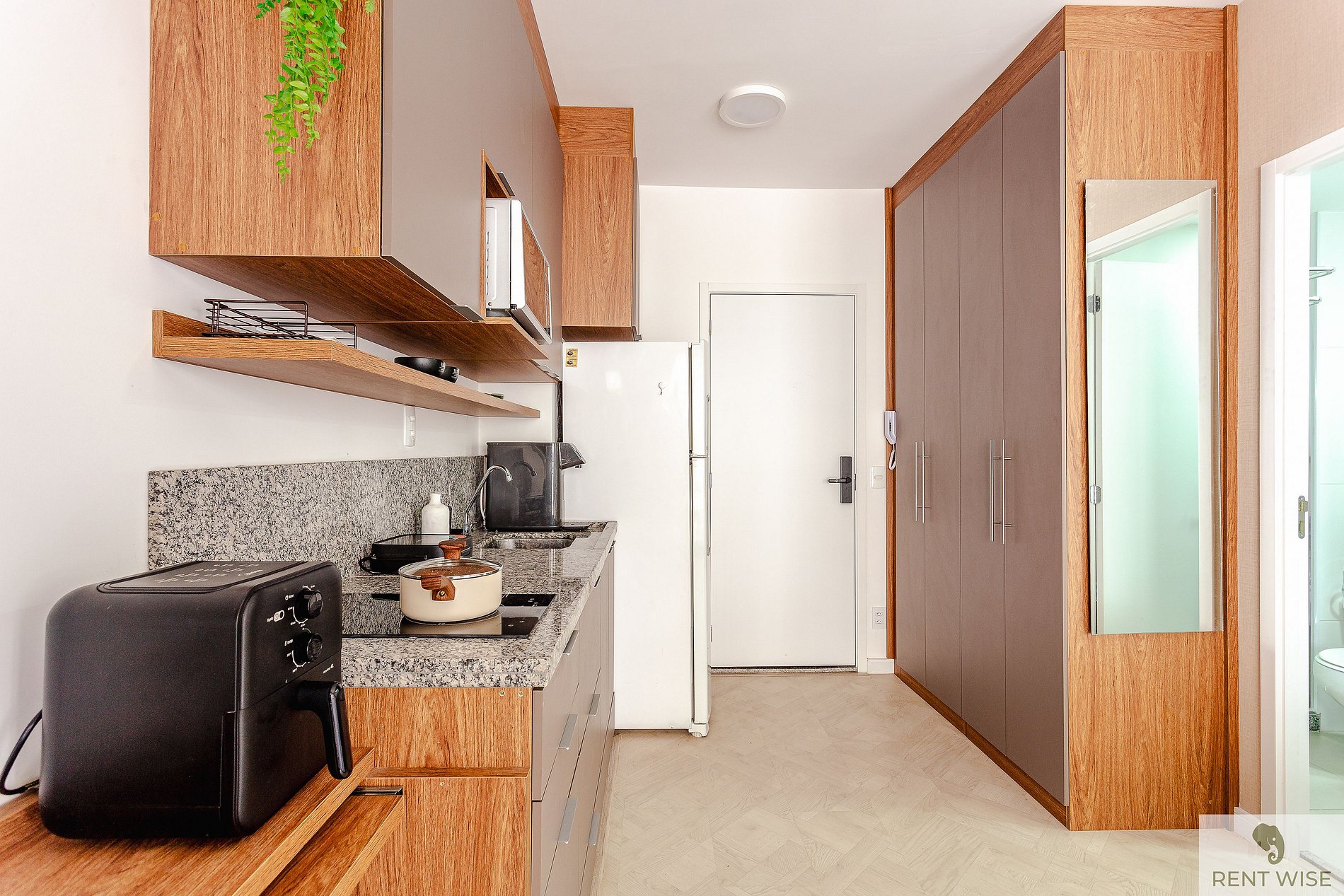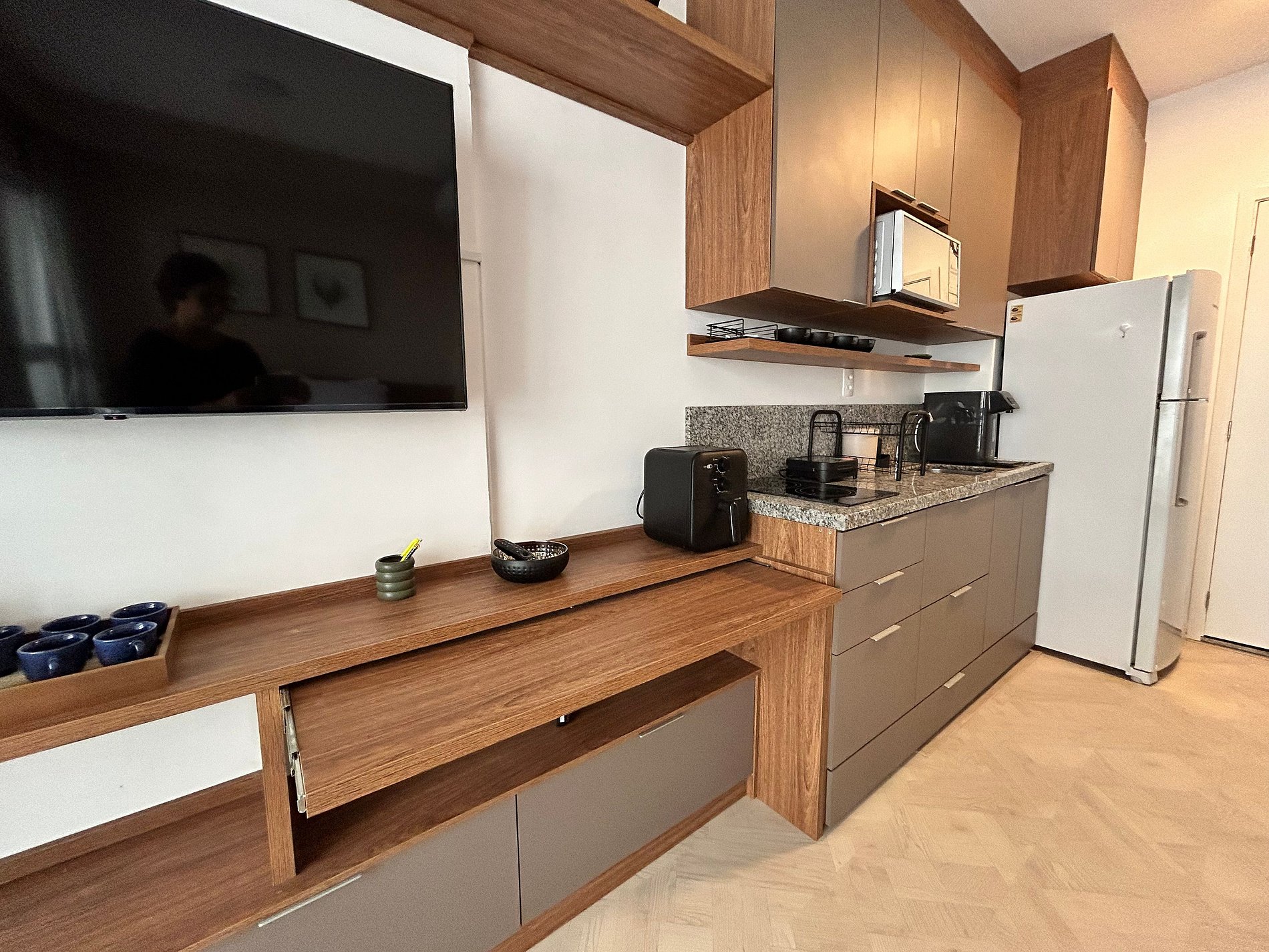 * Cozinha completa, equipada com geladeira, micro-ondas, fogão cooktop, airfyer e todos os utensílios necessários para preparar suas refeições
