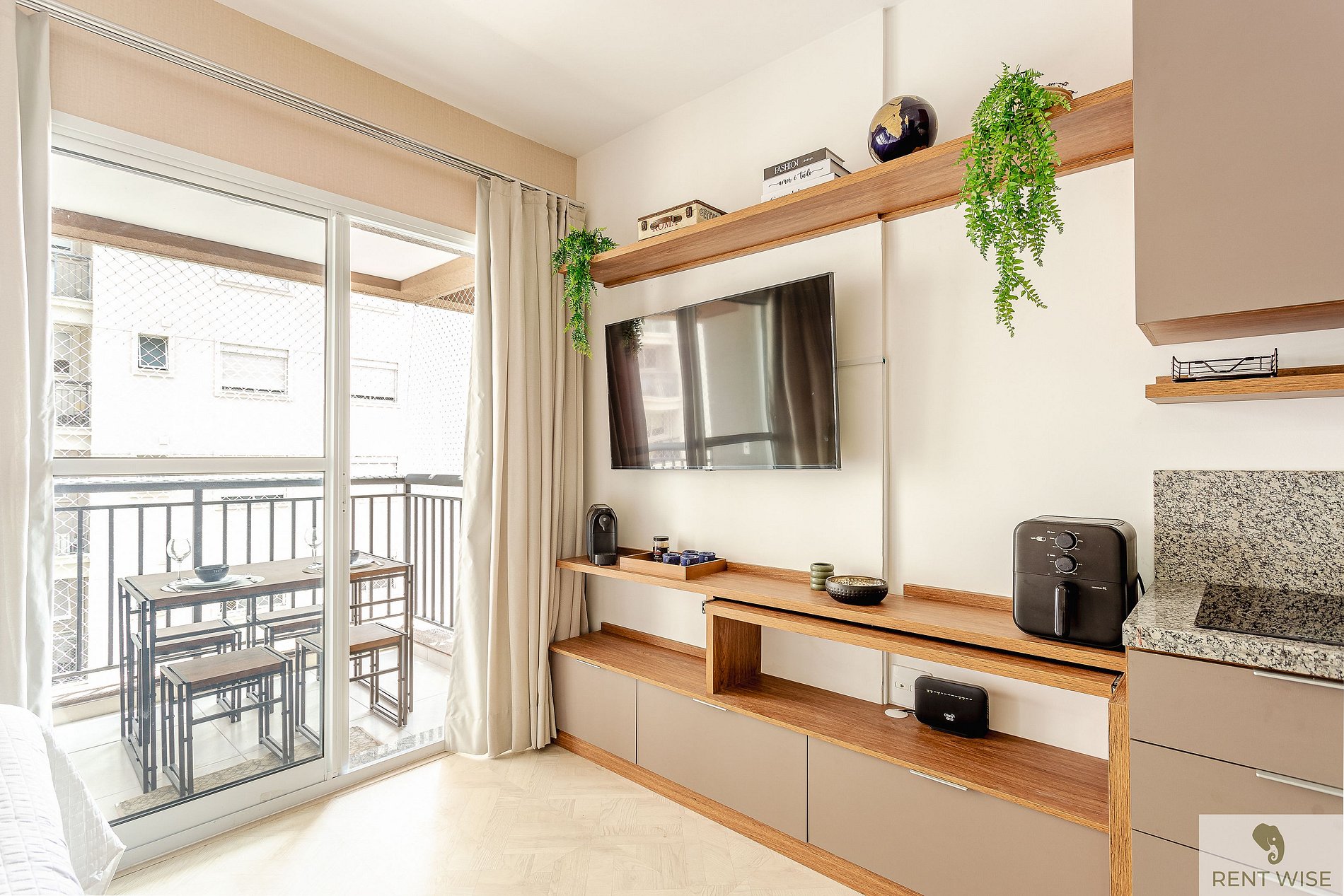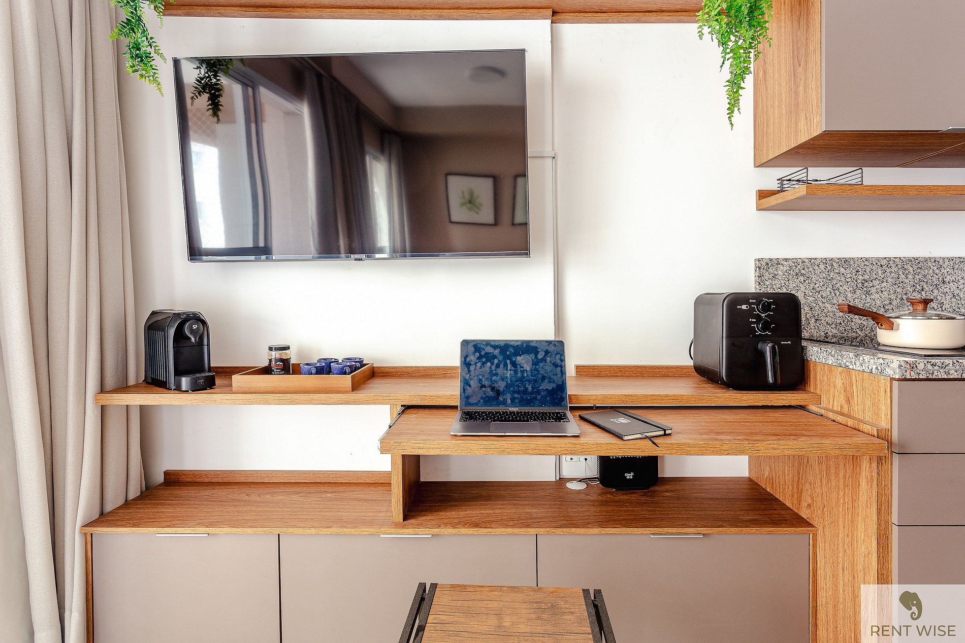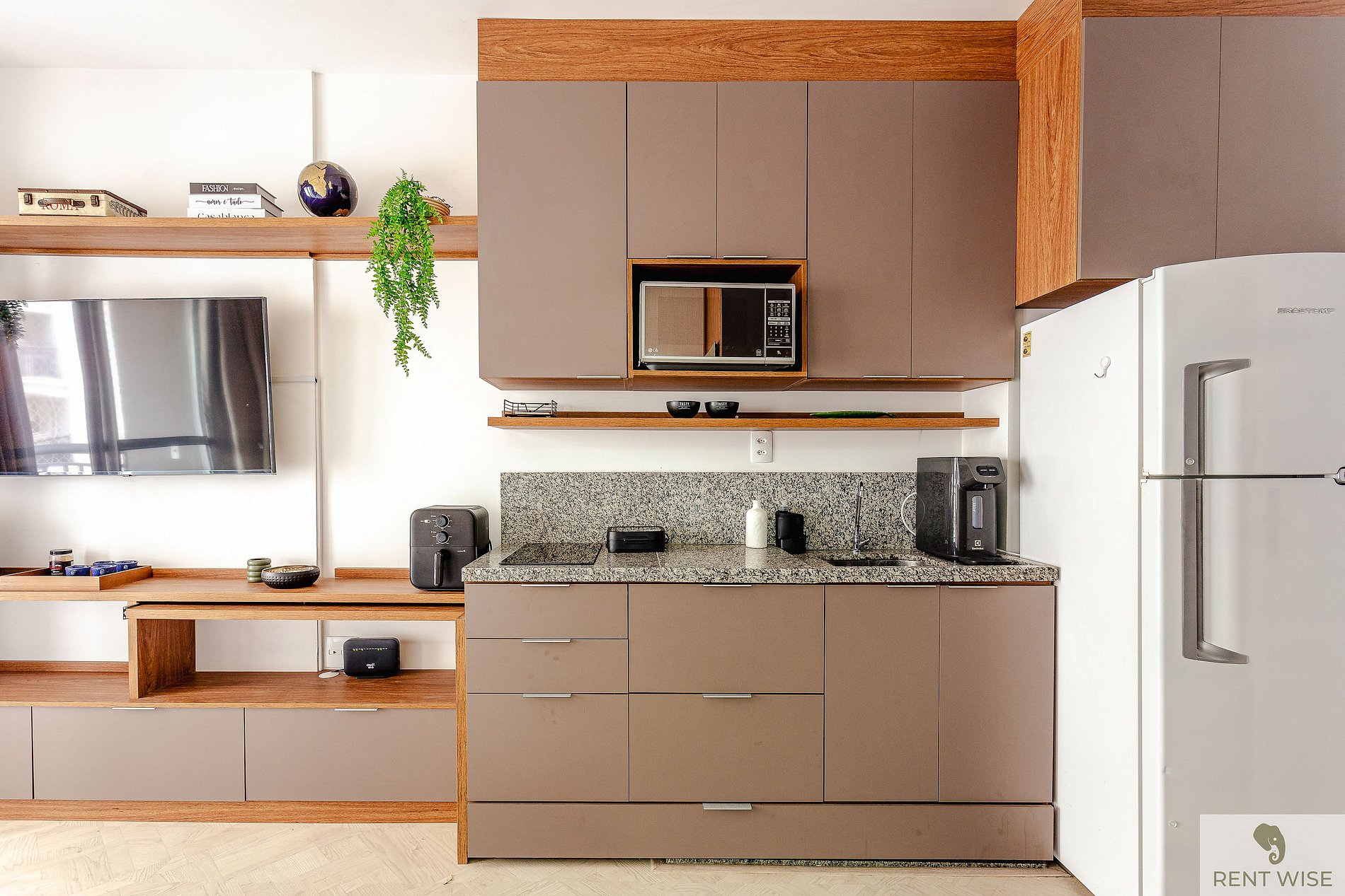* Cozinha completa, equipada com geladeira, micro-ondas, fogão cooktop, airfyer e todos os utensílios necessários para preparar suas refeições