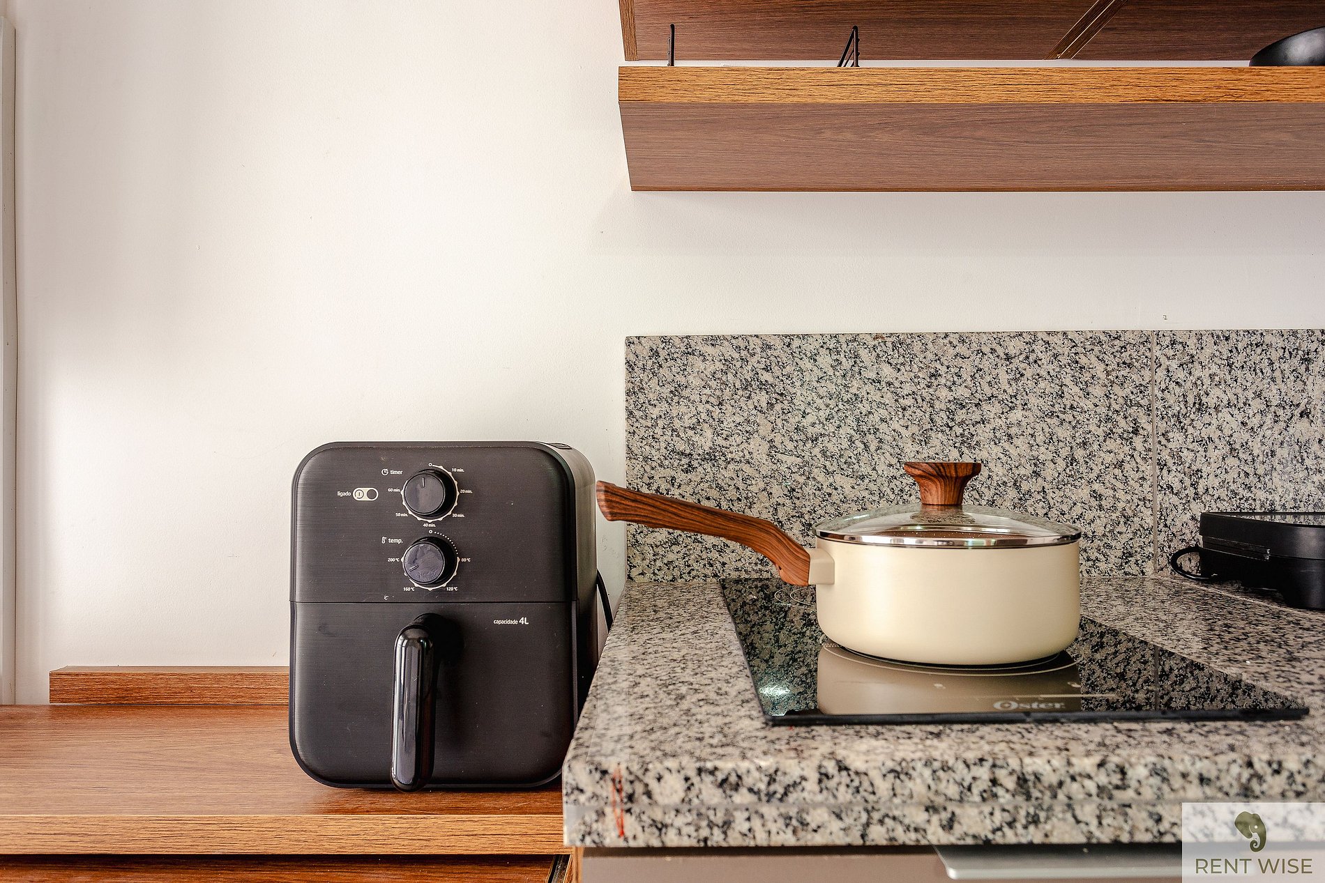 * Cozinha completa, equipada com geladeira, micro-ondas, fogão cooktop, airfyer e todos os utensílios necessários para preparar suas refeições