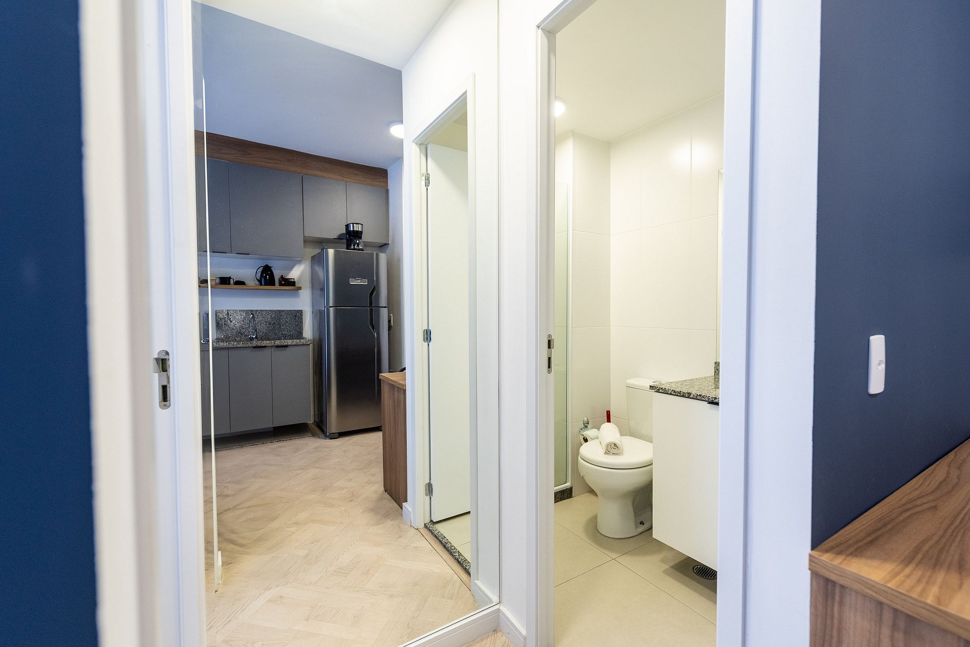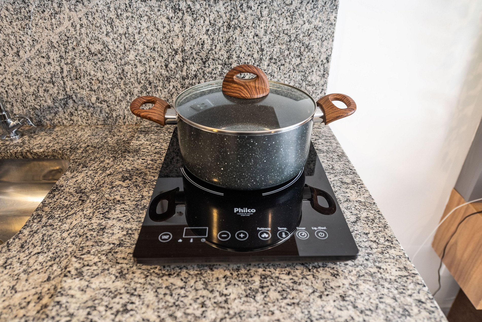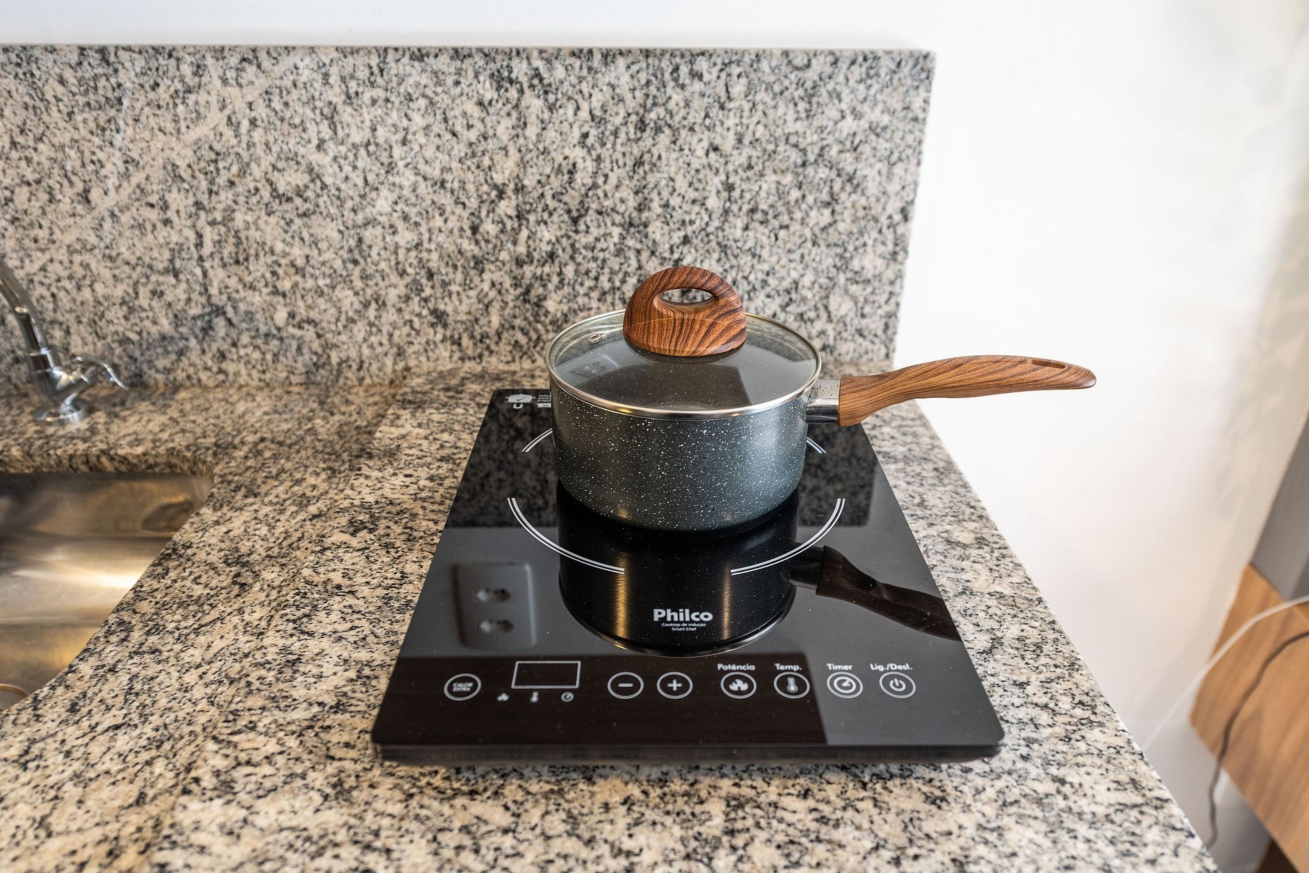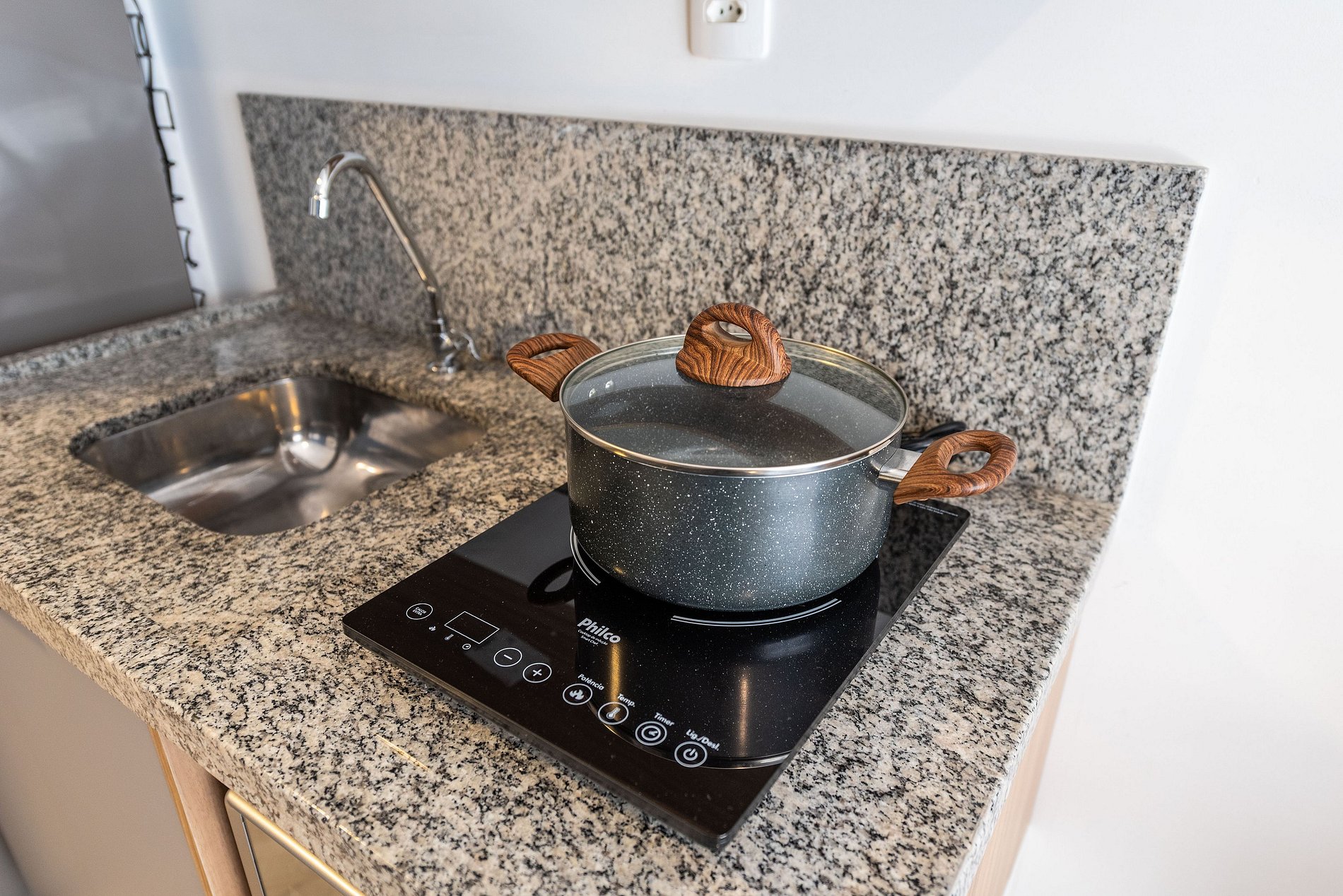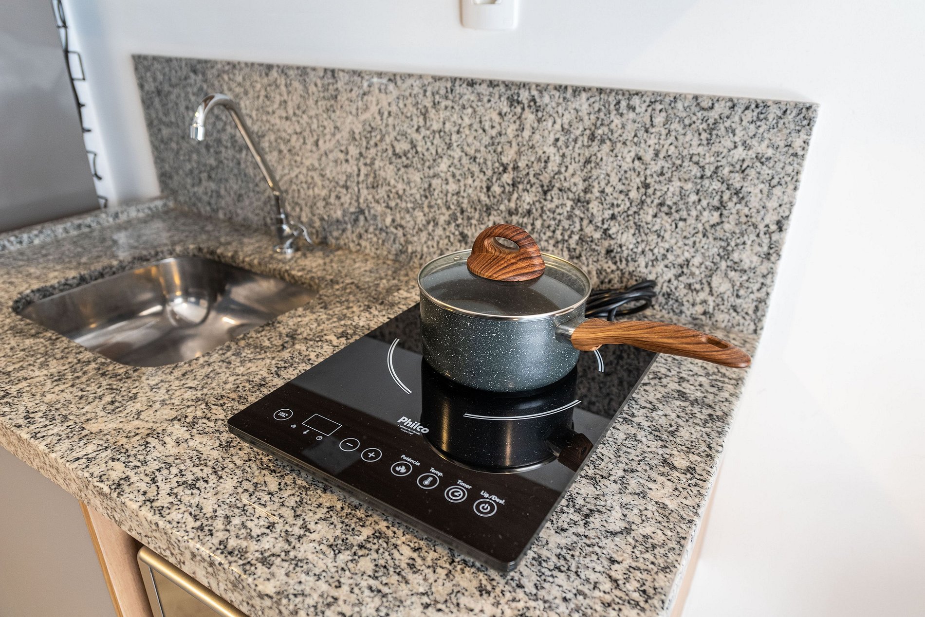 * Cozinha completa, equipada com geladeira, micro-ondas, fogão cooktop, e todos os utensílios necessários para preparar suas refeições
