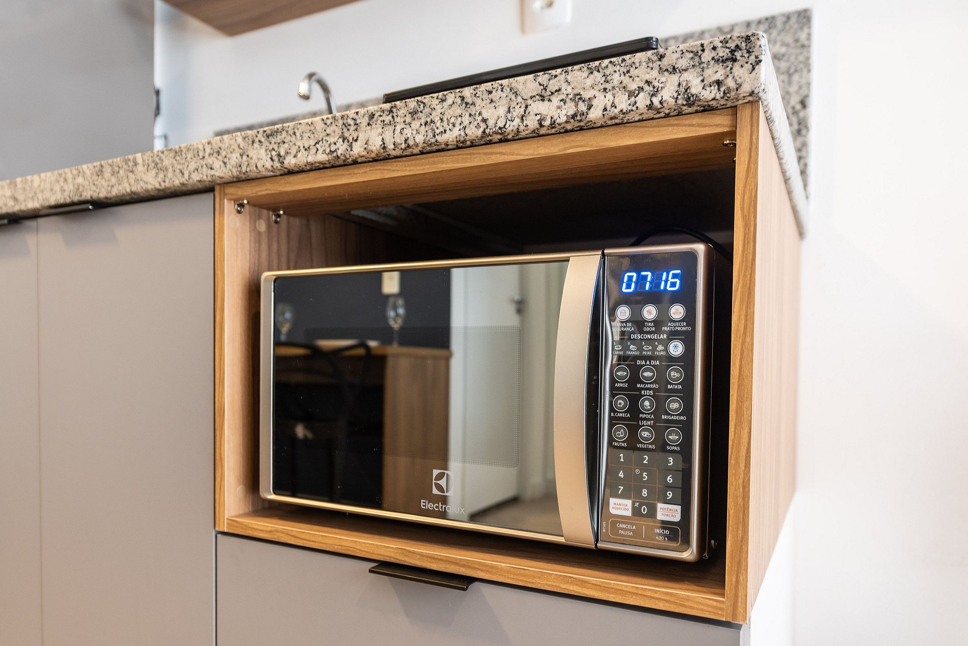 * Cozinha completa, equipada com geladeira, micro-ondas, fogão cooktop, e todos os utensílios necessários para preparar suas refeições