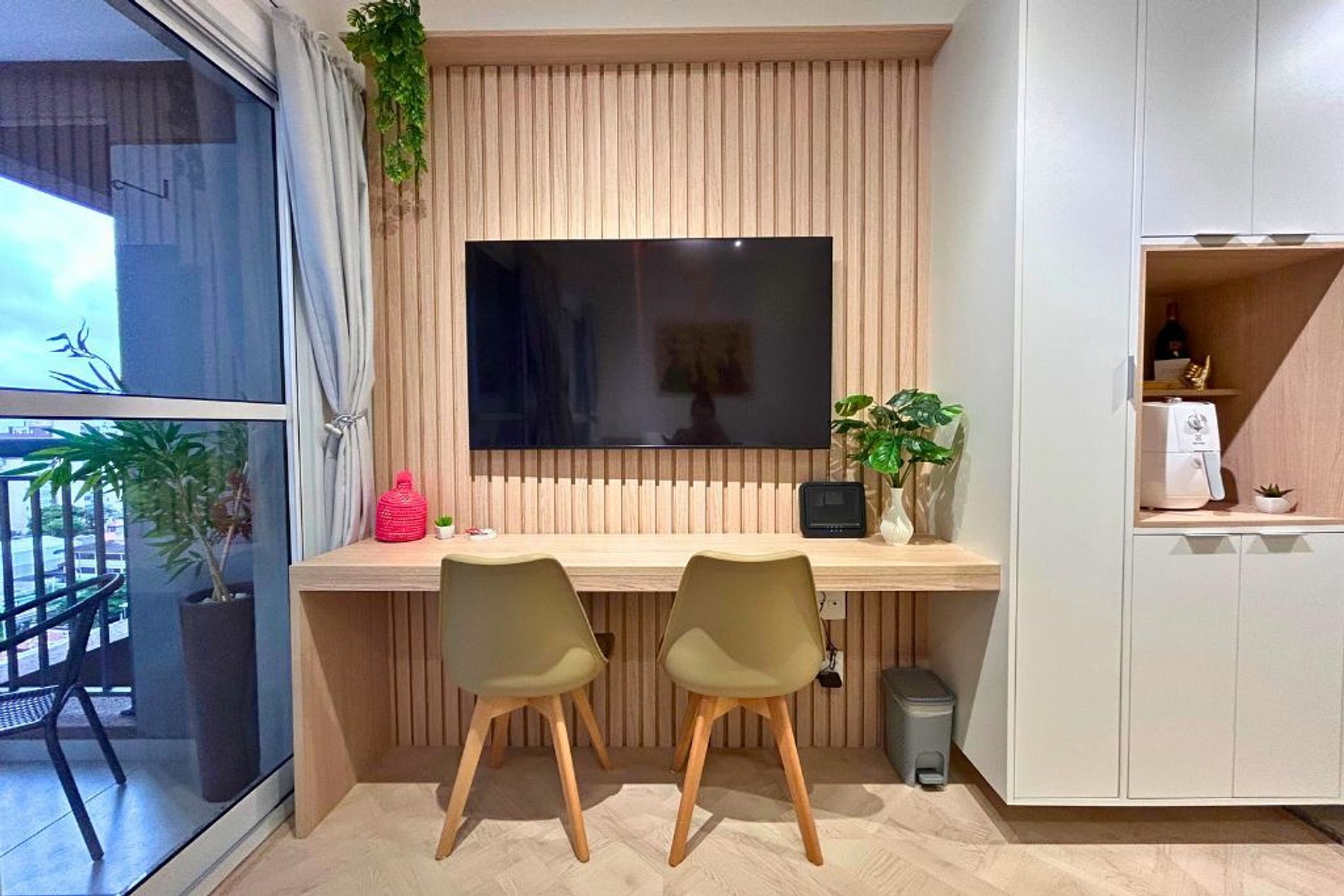 * Cozinha completa, equipada com geladeira, micro-ondas, fogão cooktop, airfryer, máquina de café Nespresso e todos os utensílios necessários para preparar suas refeições