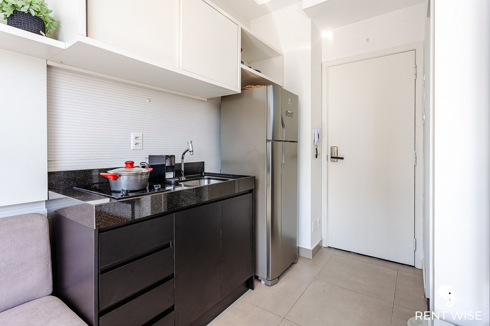 - Cozinha equipada com cooktop por indução, micro-ondas, cafeteira Nespresso, Airfryer, sanduicheira e utensílios essenciais.