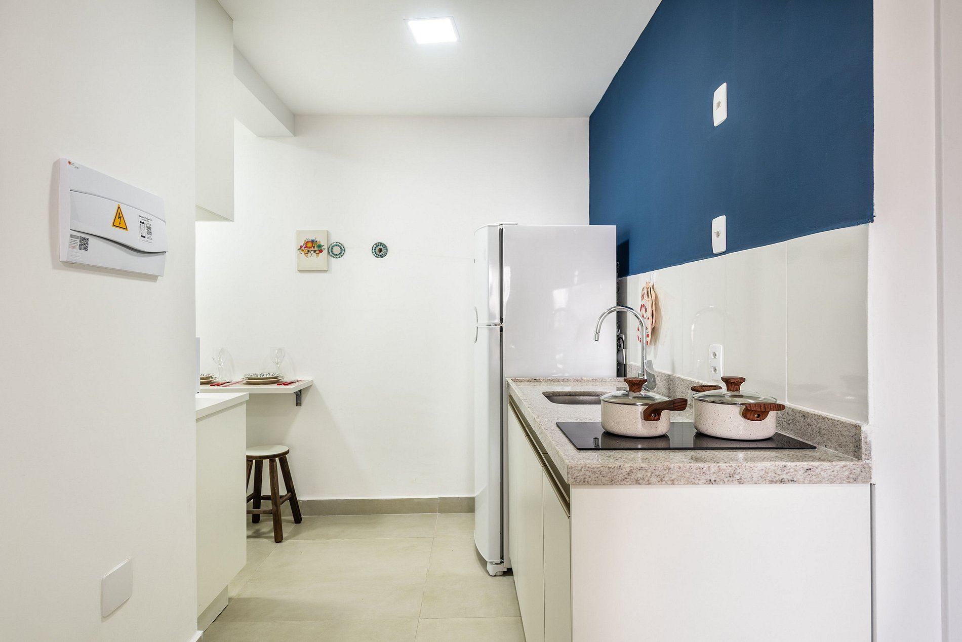 - Cozinha americana com fogão de indução 2 bocas, micro-ondas, sanduicheira, cafeteira elétrica, liquidificador e chaleira elétrica.