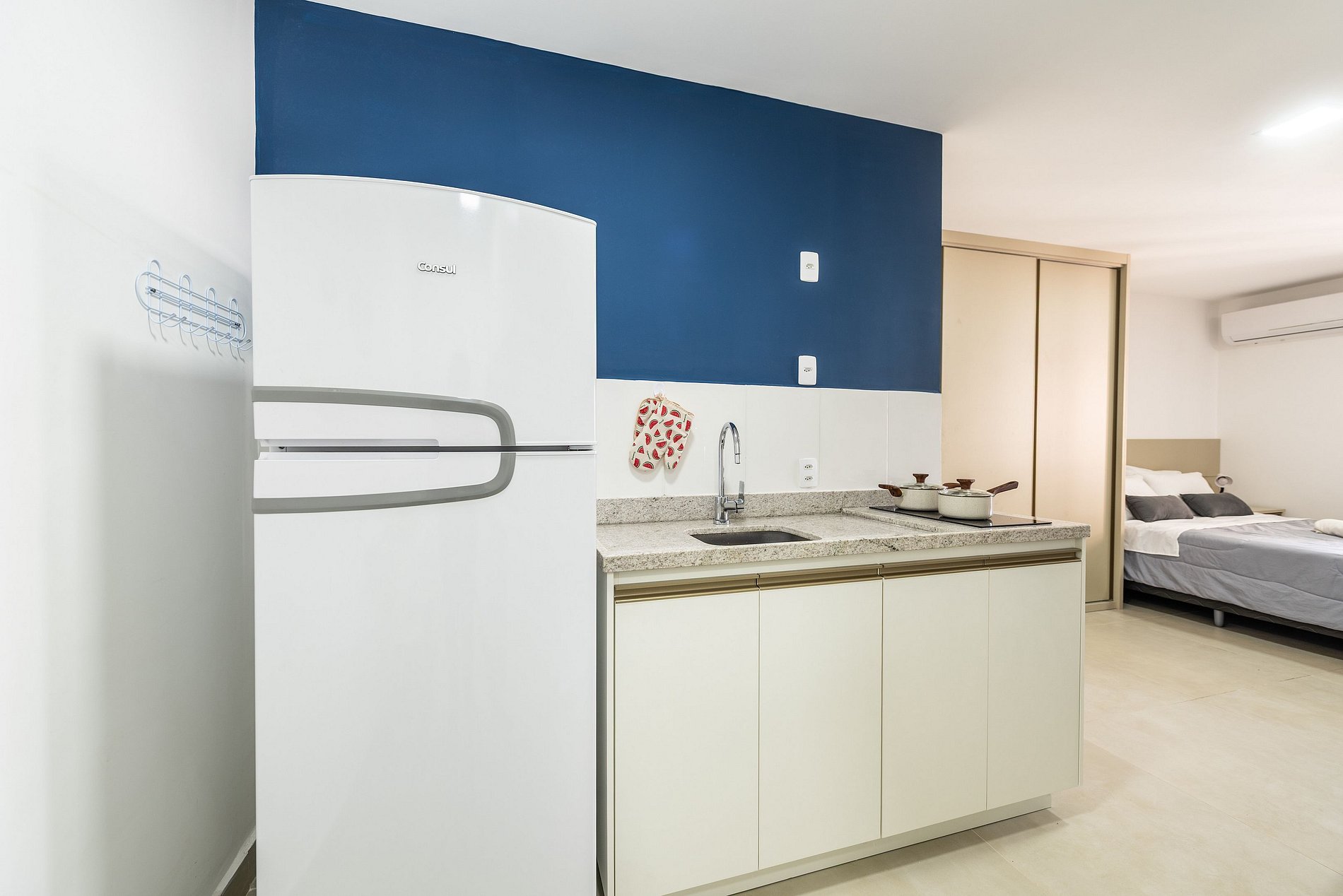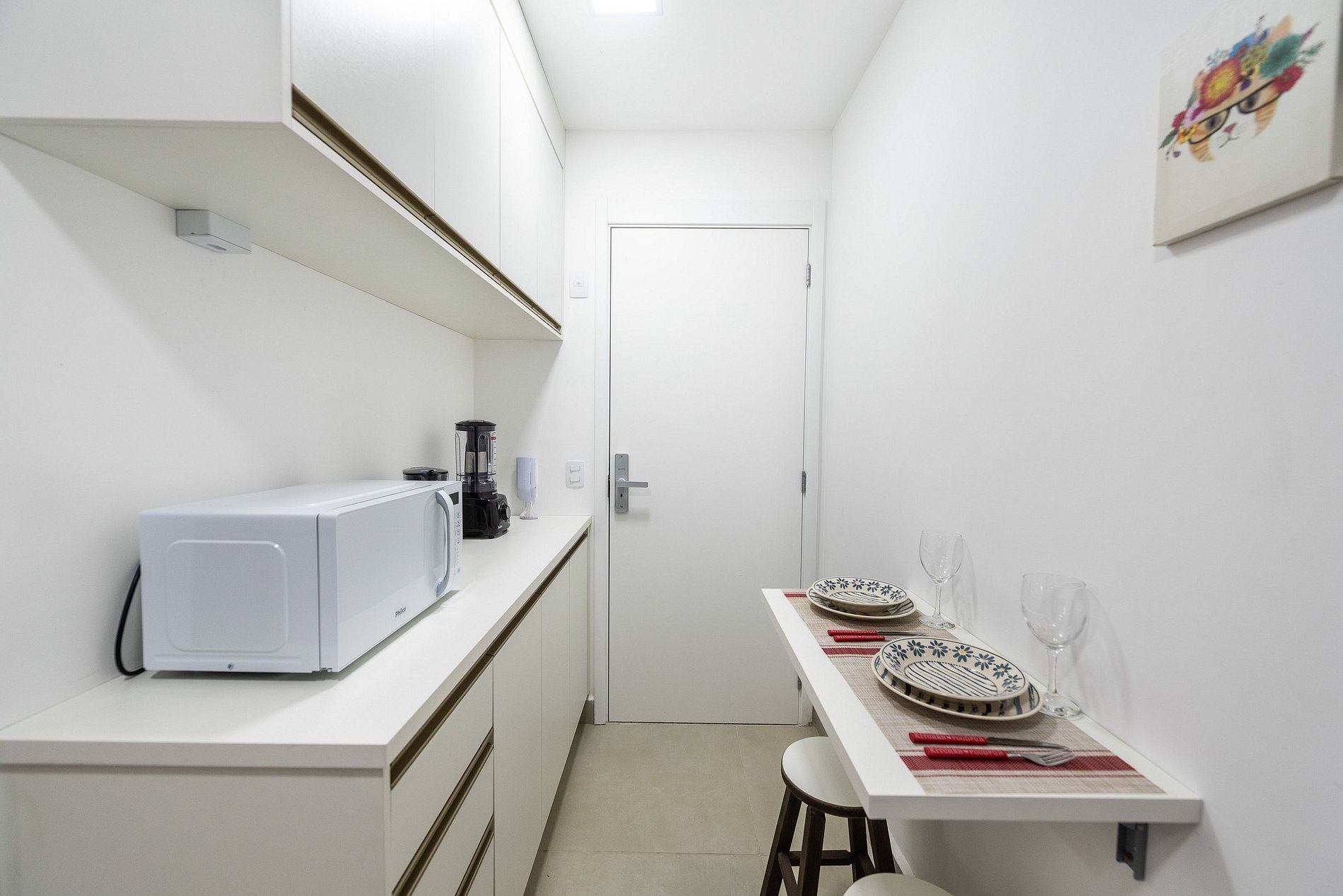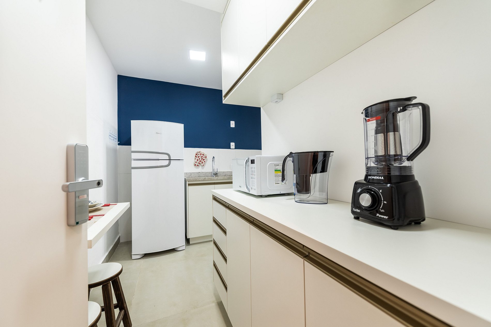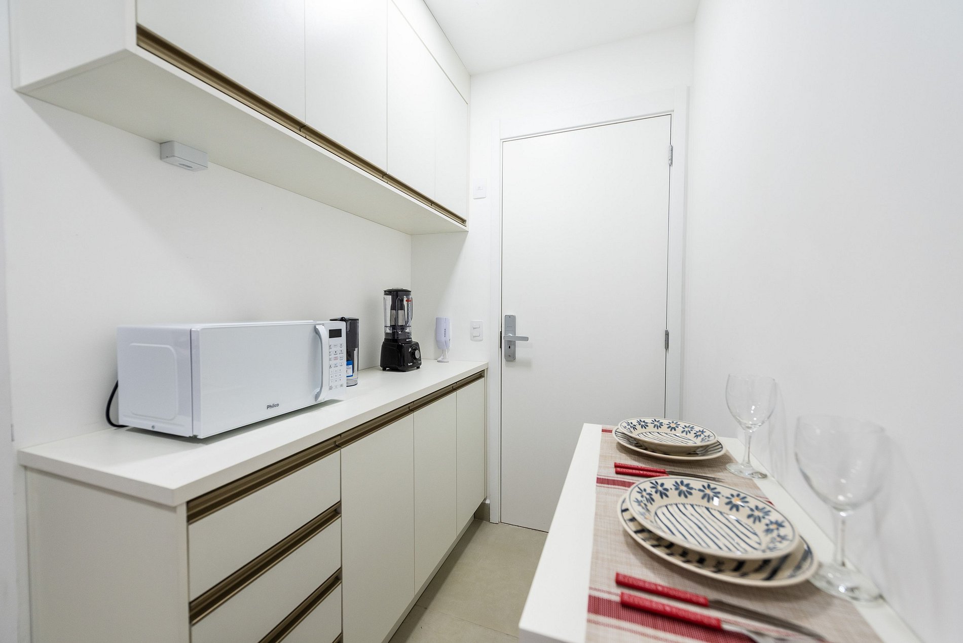 - Cozinha americana com fogão de indução 2 bocas, micro-ondas, sanduicheira, cafeteira elétrica, liquidificador e chaleira elétrica.